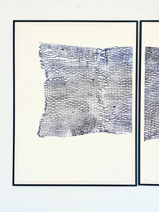 DécouvrirLes estampes de tissages sont réalisées à partir d'impressions d'ouvrages tissés en fibres naturelles. Chaque empreinte révèle la structure de la trame et son rythme.