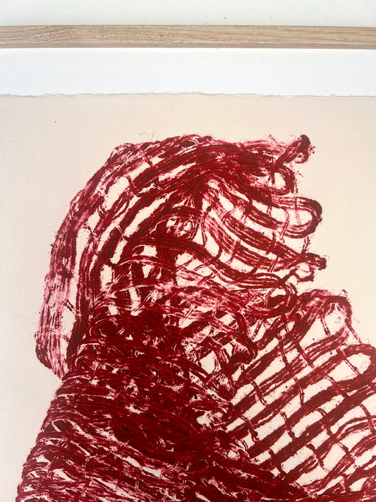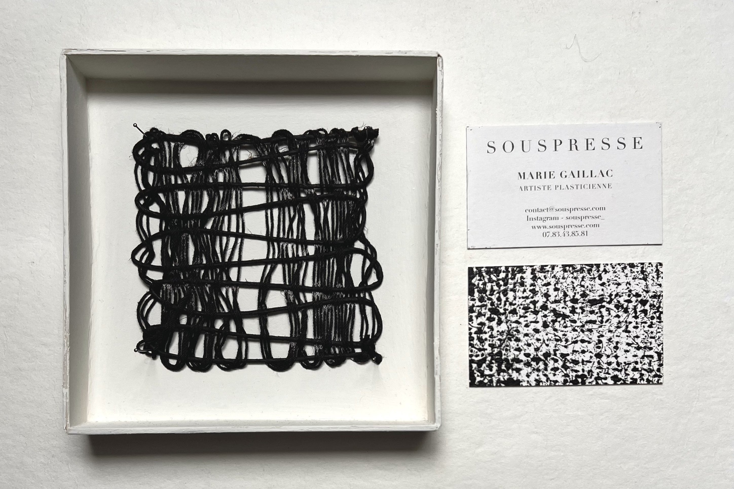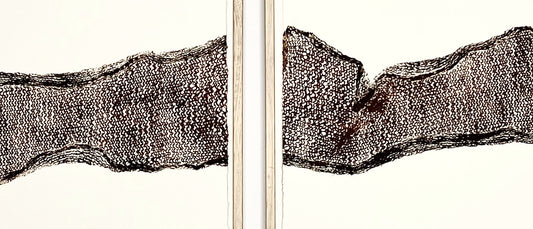 DécouvrirLes estampes de nouages sont réalisées à partir de l'impression d'ouvrages noués en fibres naturelles. Chaque empreinte révèle le geste lent du lien et la trame dessinée par la fibre.