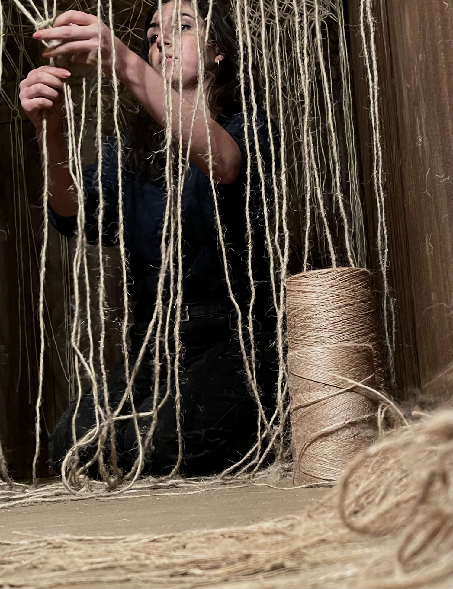 En 2019 elle réalise ses premiers ouvrages en fils auxquels elle attribue le rôle de matrices dans ce qui évolue comme une technique singulière d’impression de fibres. A partir de cette technique sont nées plusieurs pratiques qui l’inscrivent progressivement dans une véritable recherche autour de la trame, sculptée, déformée, imprimée, dessinée : la trame revêt des formes variées dont les applications sont infinies.