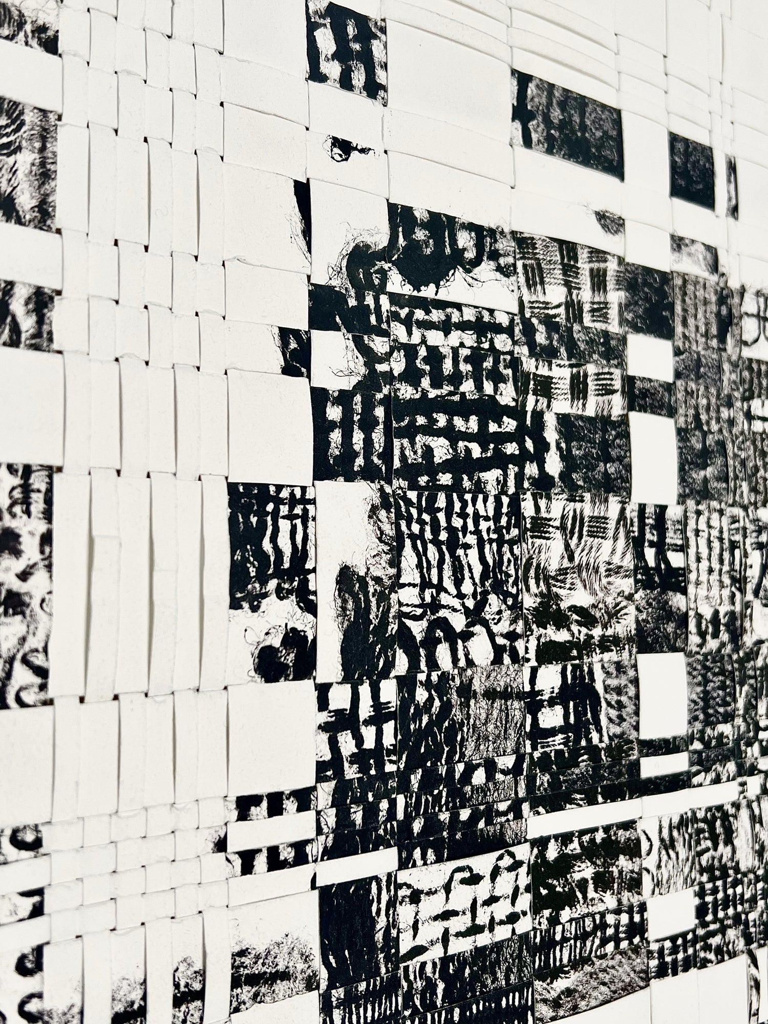 J’aime pousser le matériau à son épuisement, chercher une manière de remettre en question ce qui vient d’être créé pour tirer le fil encore plus loin. Je recycle en permanence. Mes tressages d’estampes participent à cette démarche. L’estampe, considérée ici en tant que matière principale du dessin, est découpée puis retressée pour révéler une autre réalité du dessin.