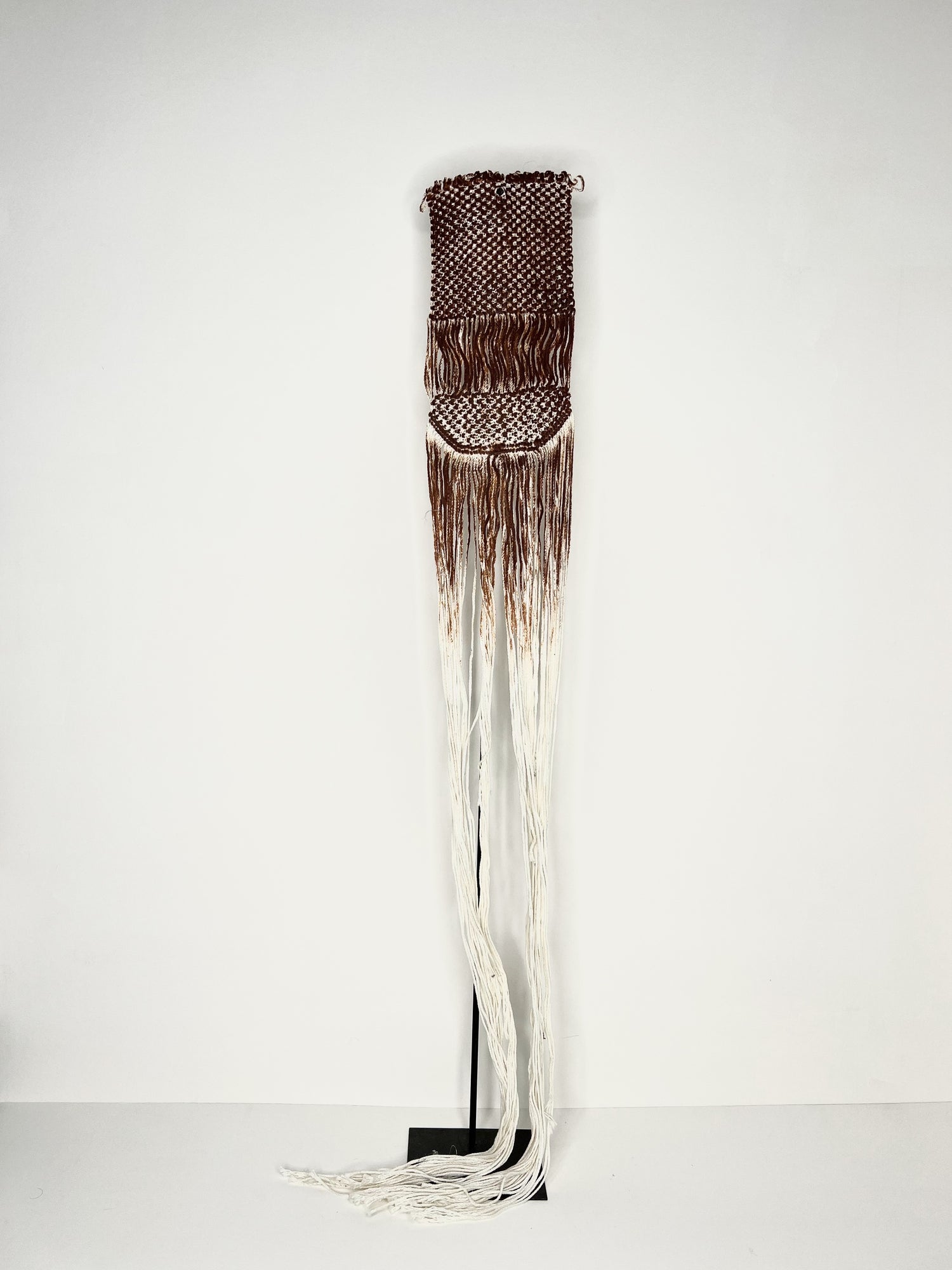 Au commencement de ma recherche sur la trame il y a l’envie de travailler cette matière fibre, d’en faire un ouvrage, un corps : dans un premier temps par la technique du nouage, puis le tissage prend le dessus, ressurgissant de mon enfance. Partir du fil pour construire un ouvrage est un travail avec le temps. La réalisation d’une trame peut prendre plusieurs jours. C’est un processus long et obsessionnel.