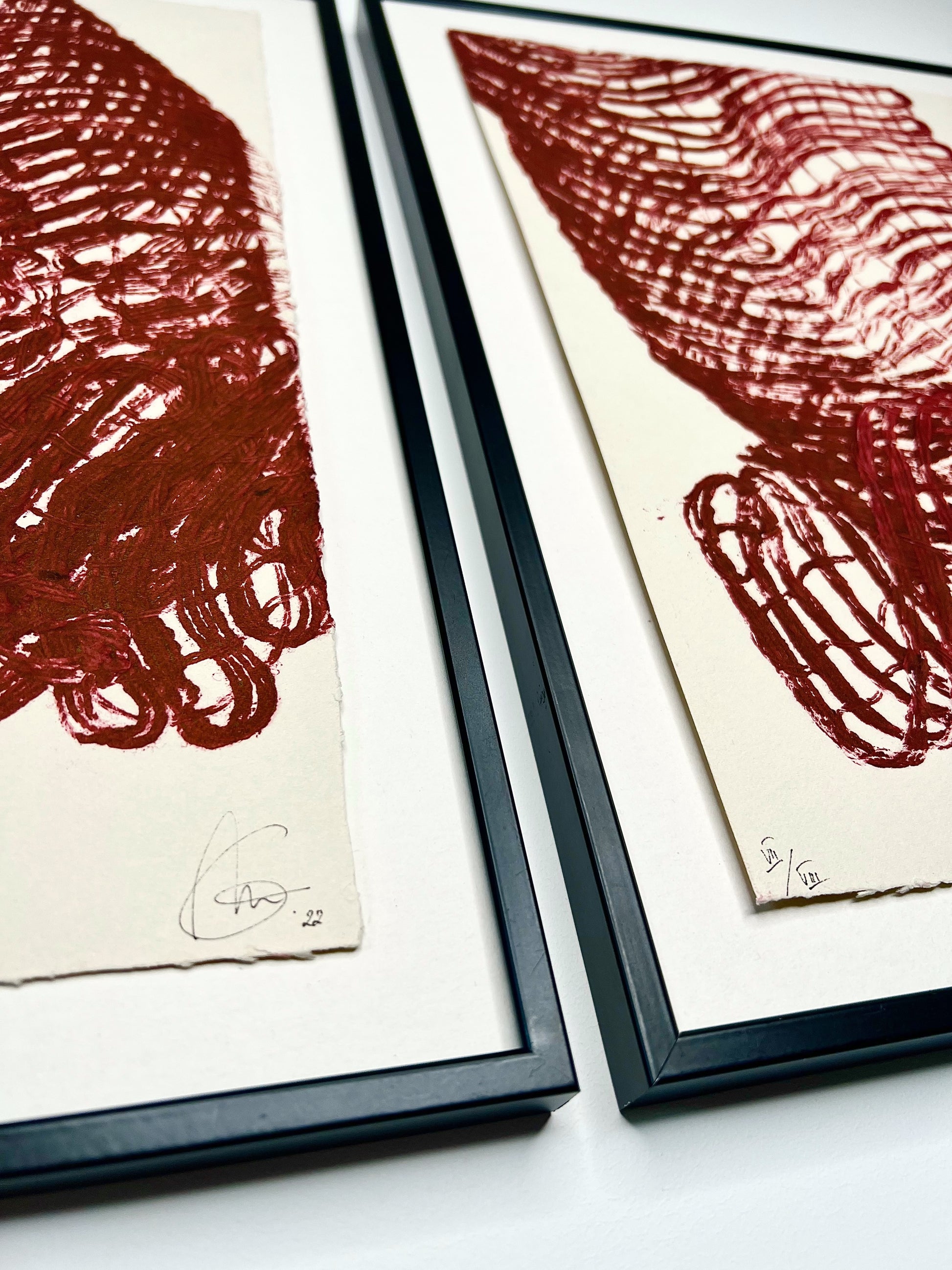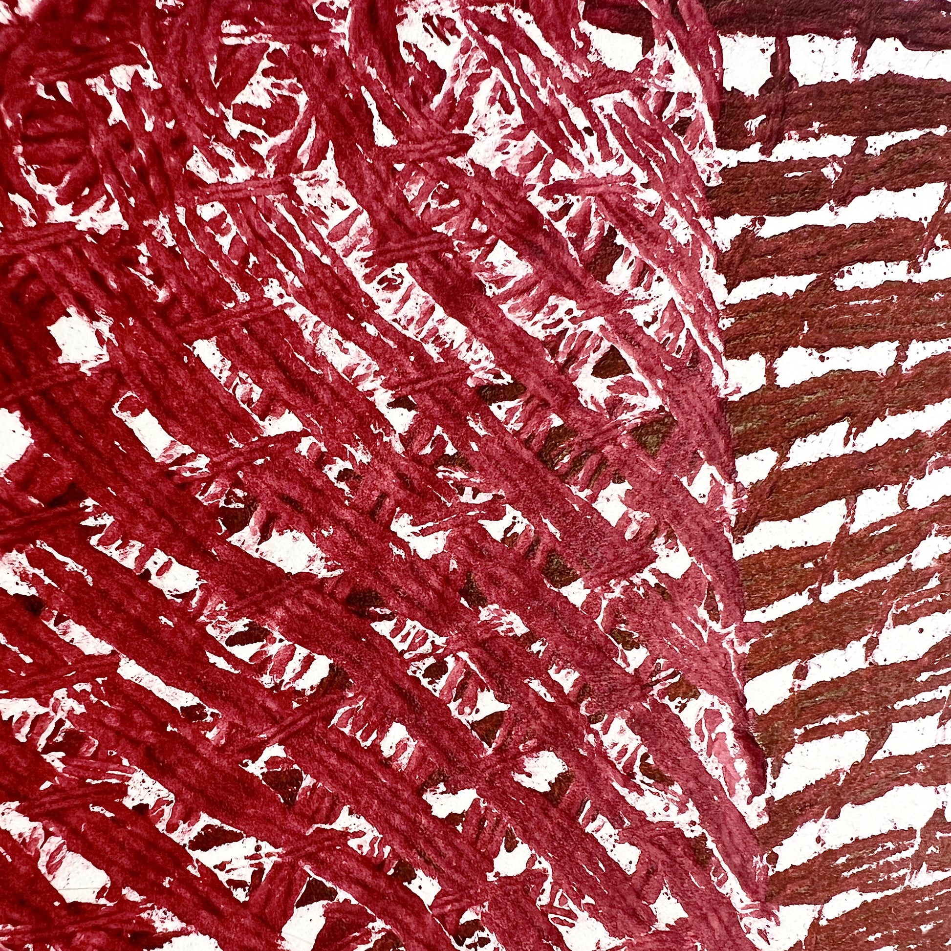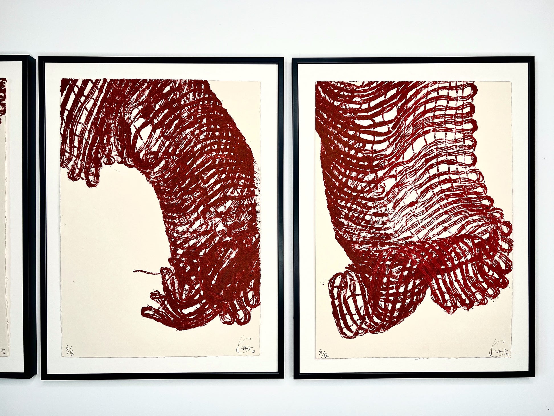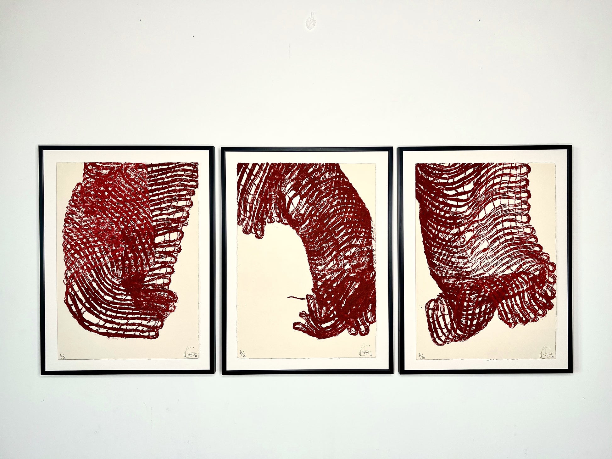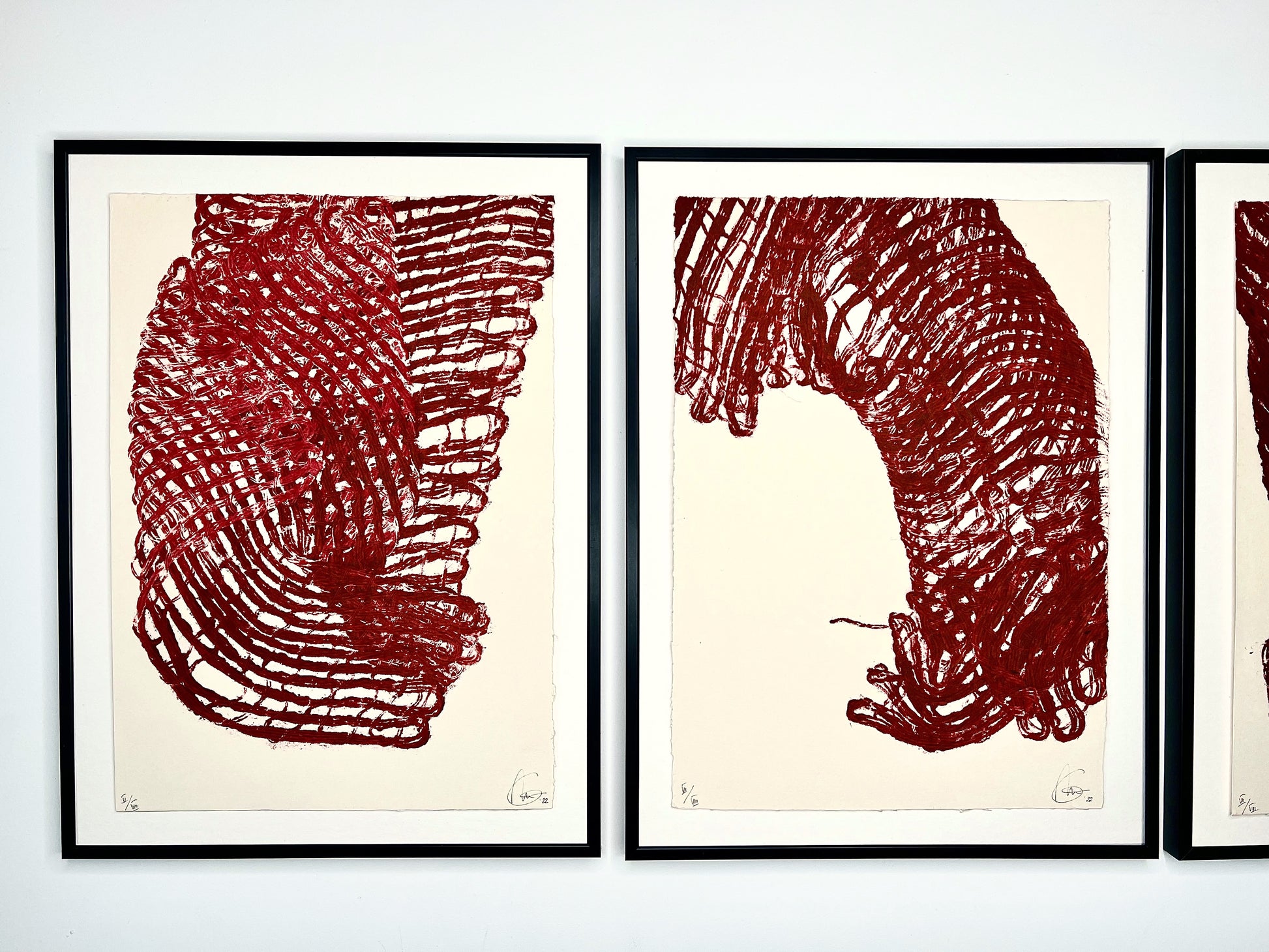 Triptyque d'estampes d'une matrice en fibres de coton tissées enduite de plusieurs encres d'impression et passée sous presse sur un papier Fabriano Rosaspina de 280g