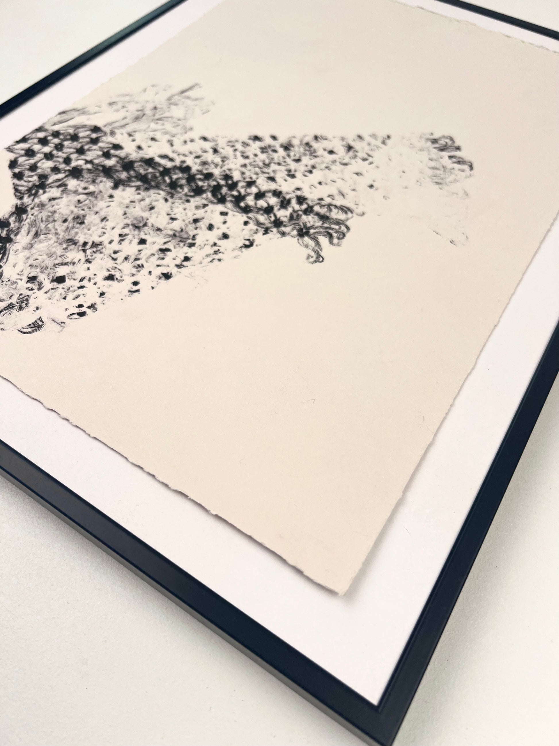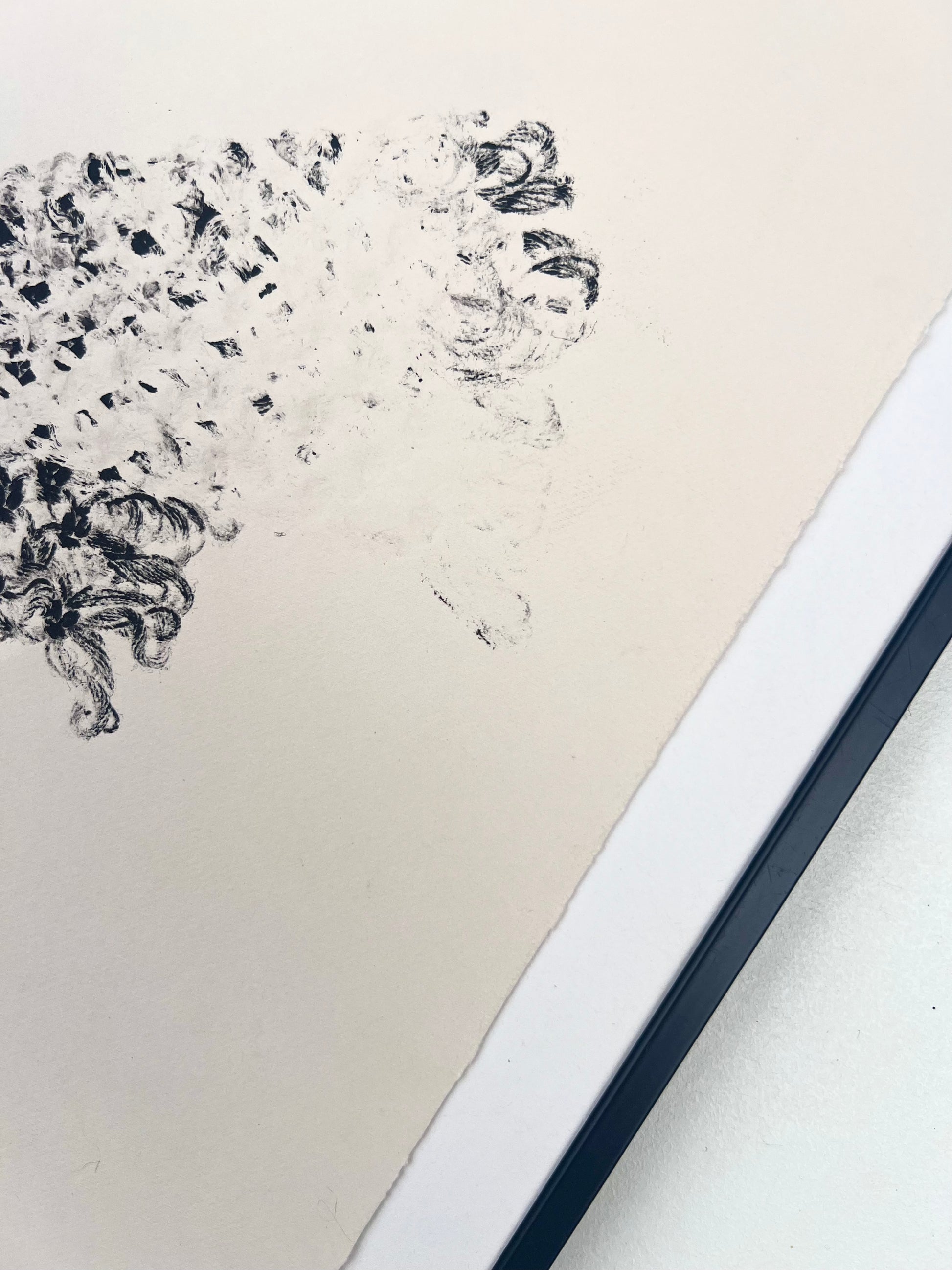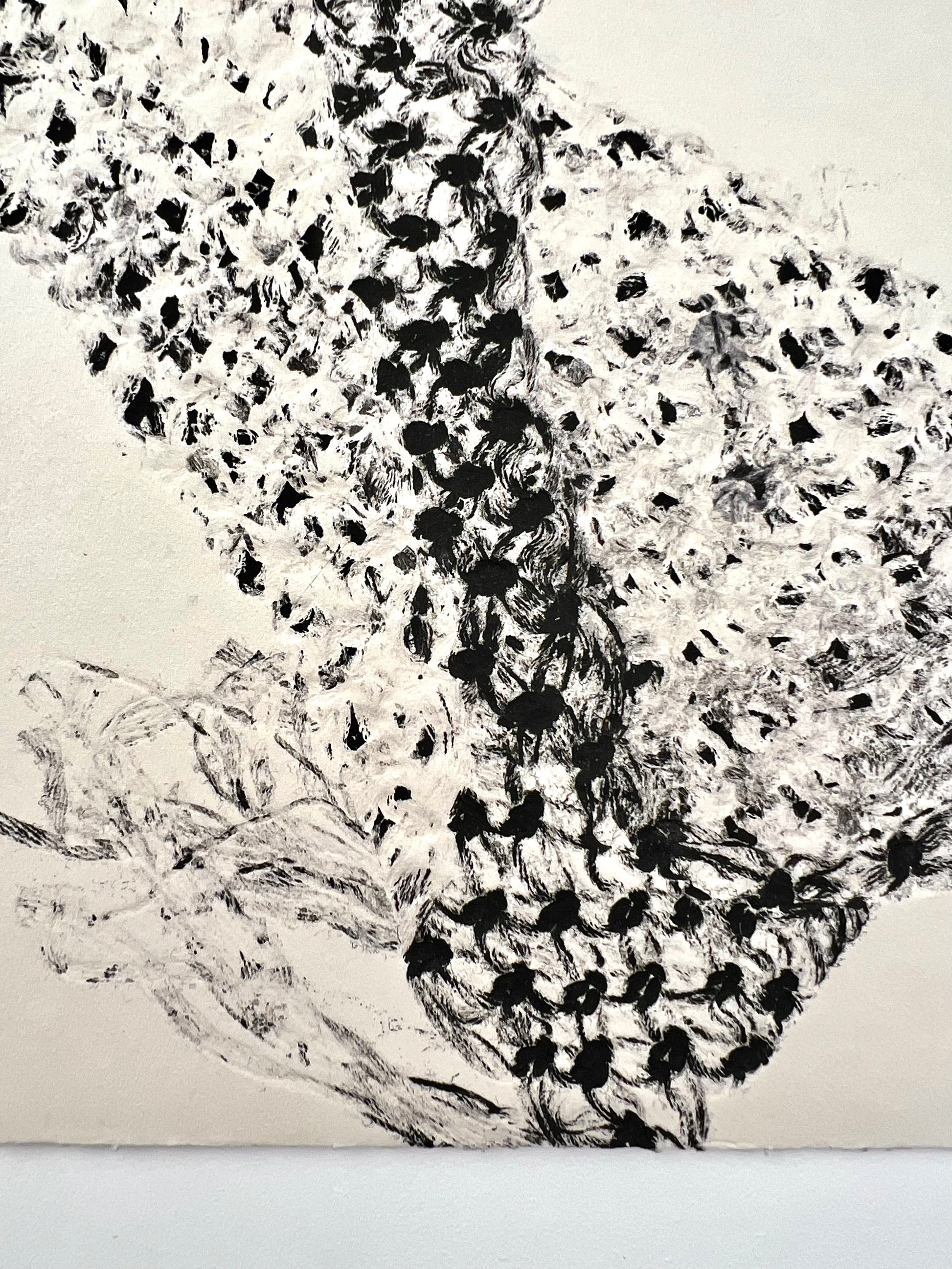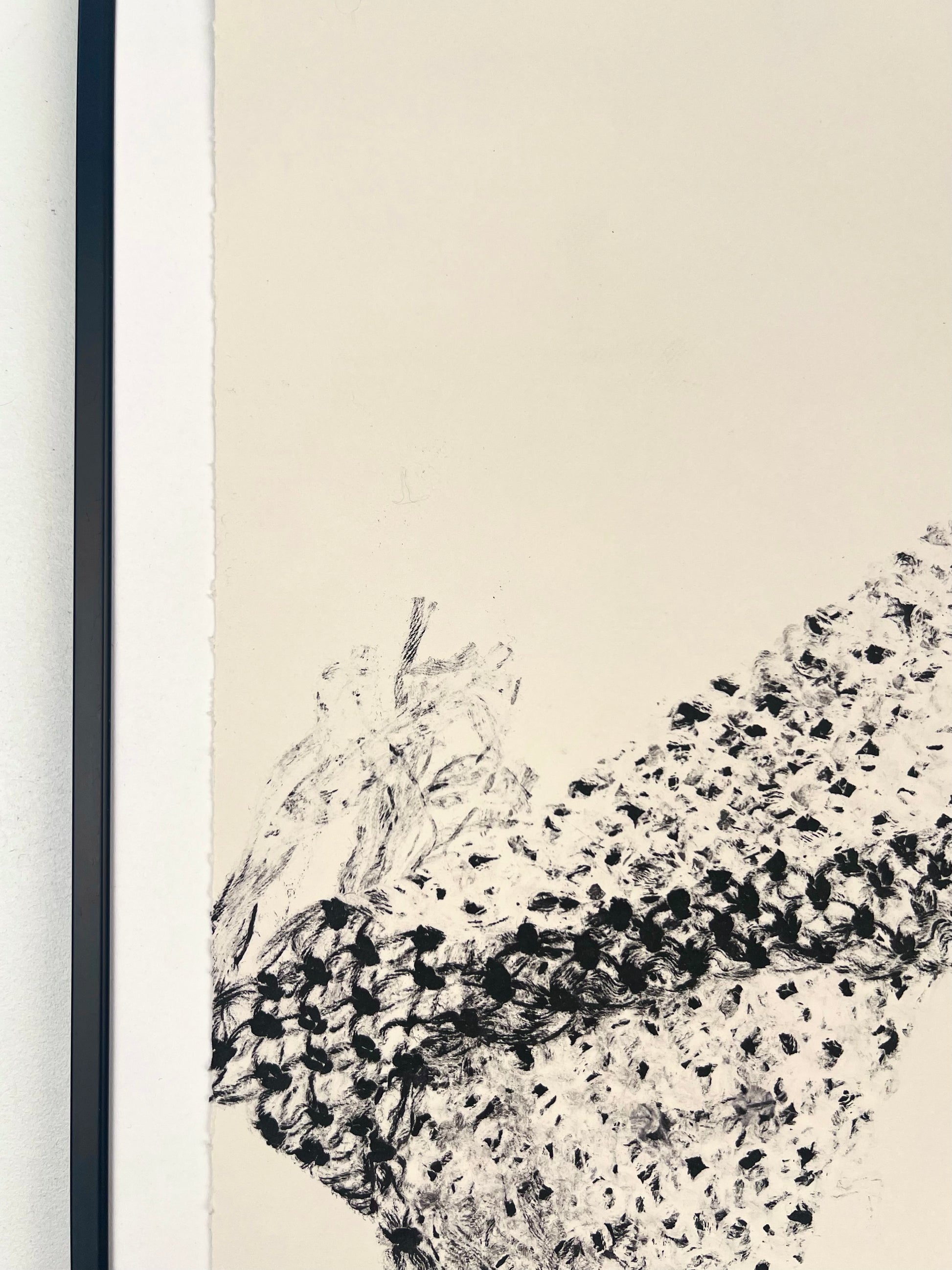 Estampe d'une matrice en fibres de coton nouées enduite d’une encre d’impression (noir carbone) et passée sous presse sur un papier Fabriano Rosaspina de 250g