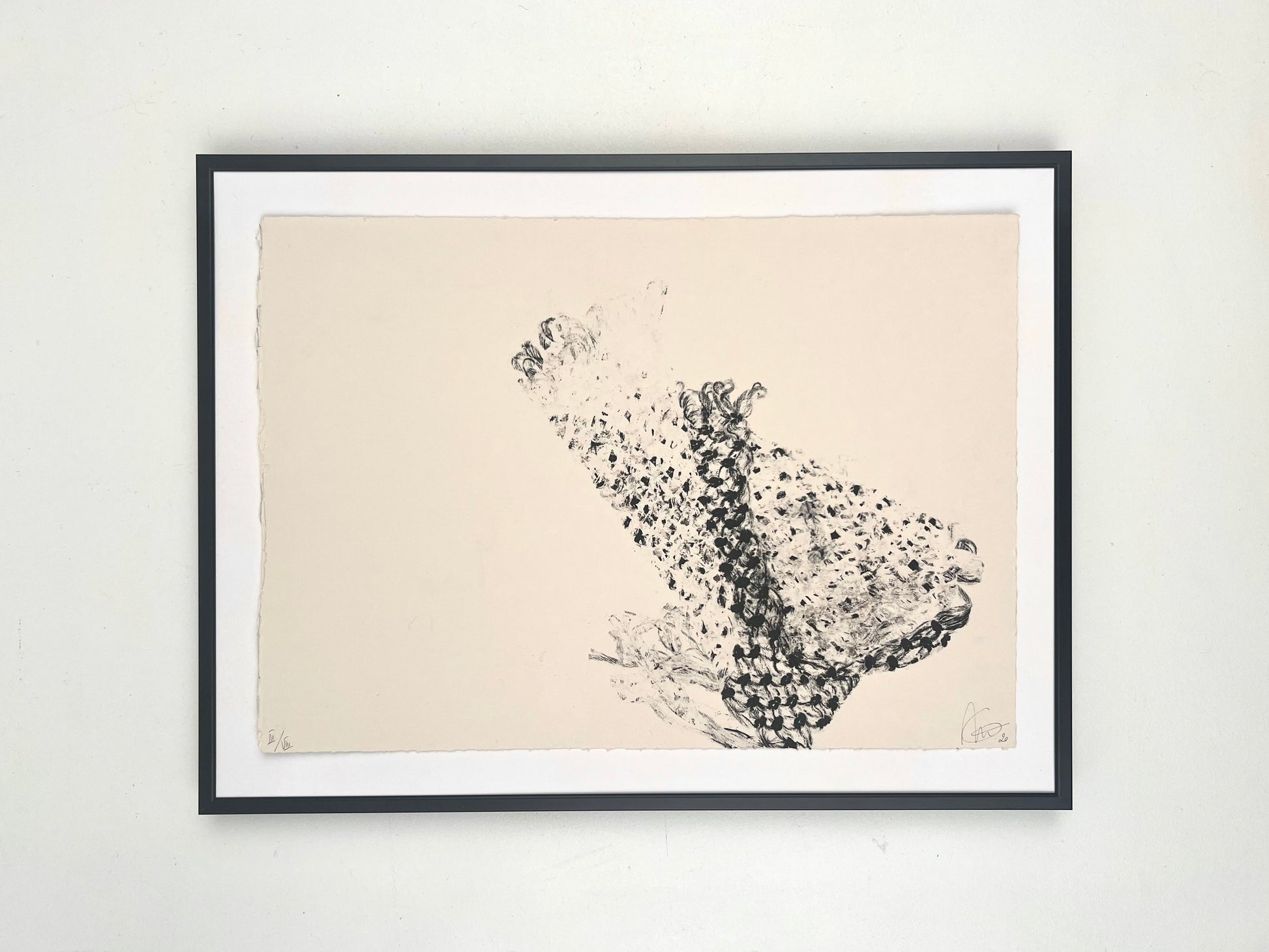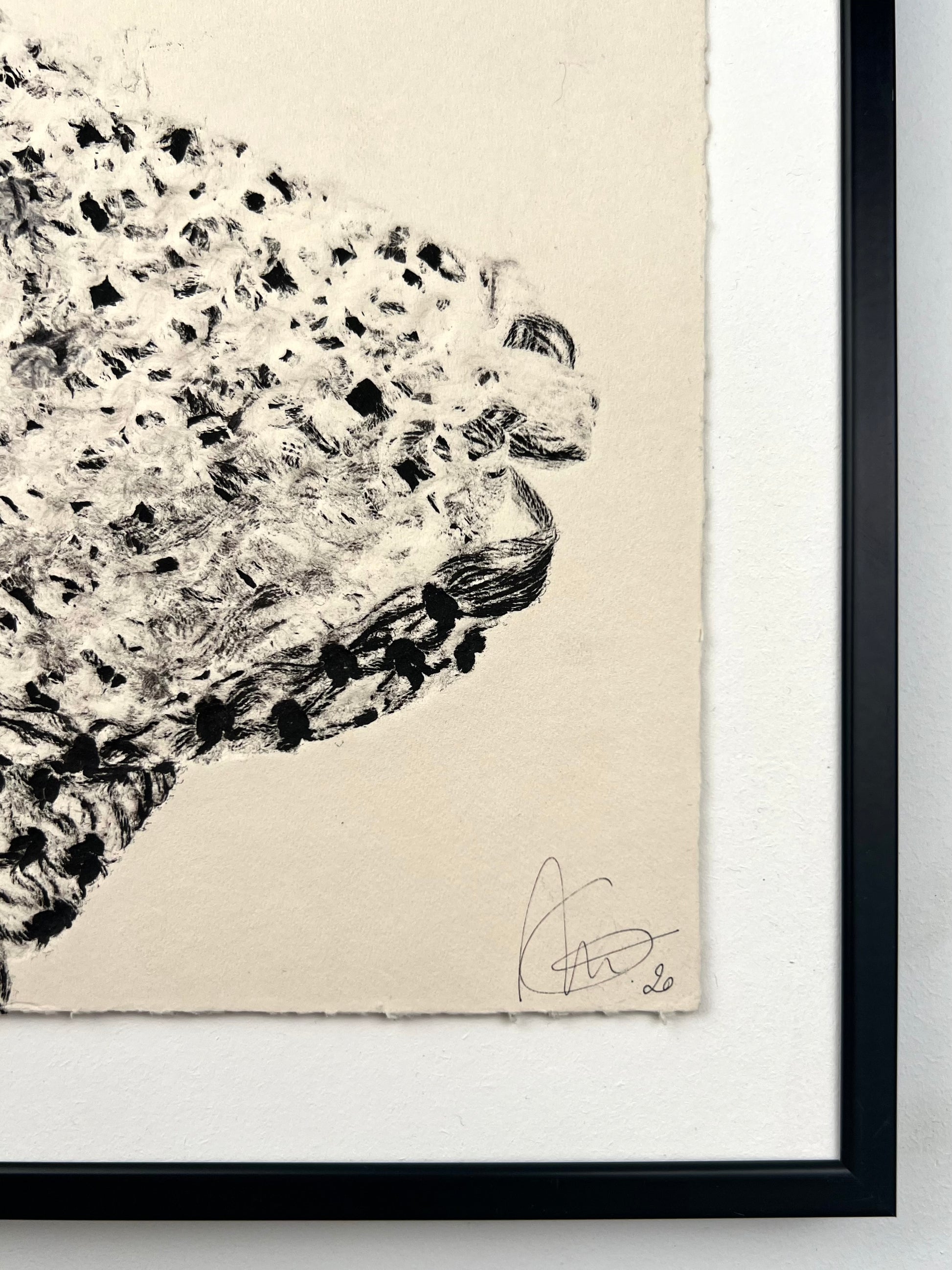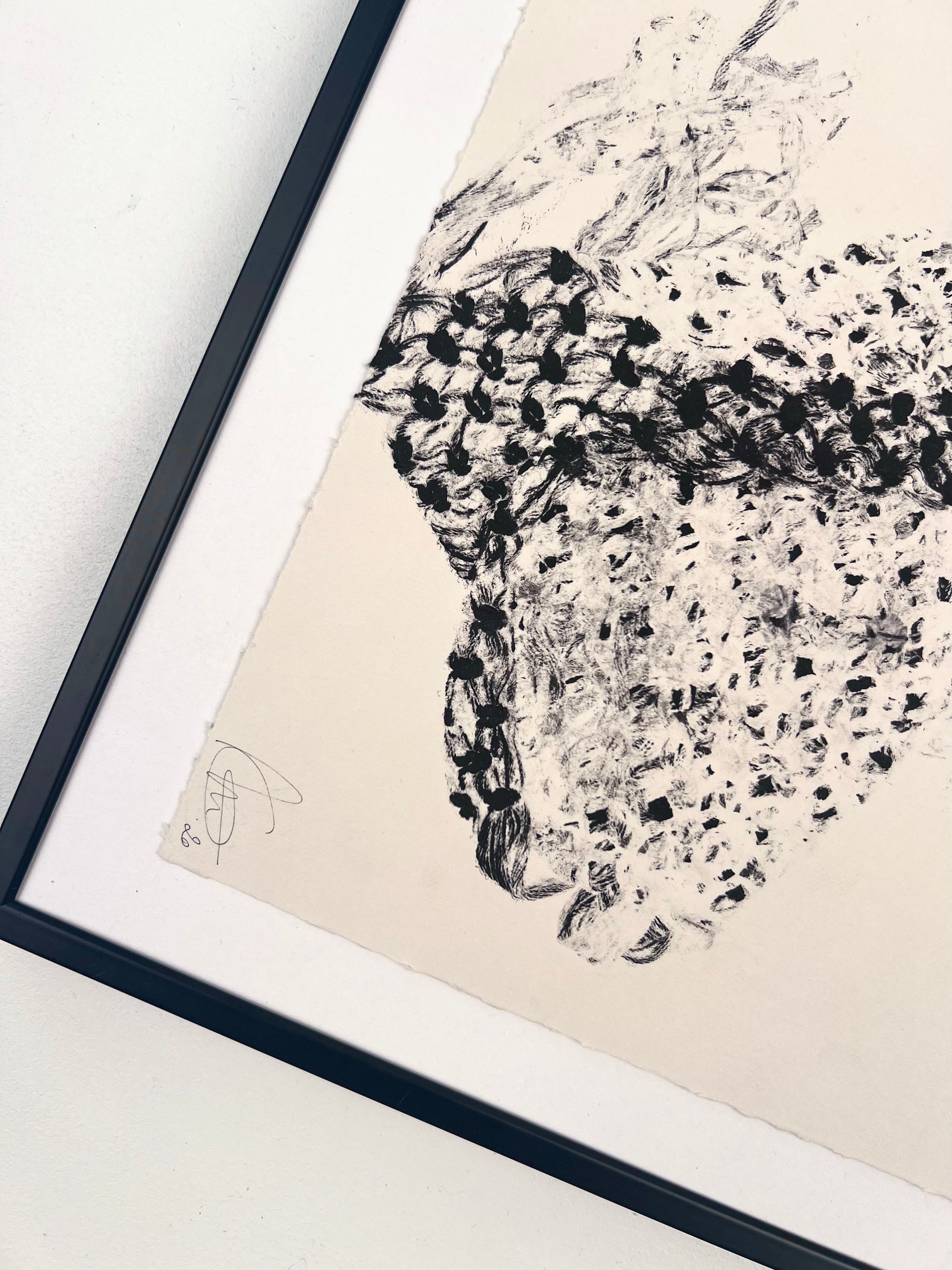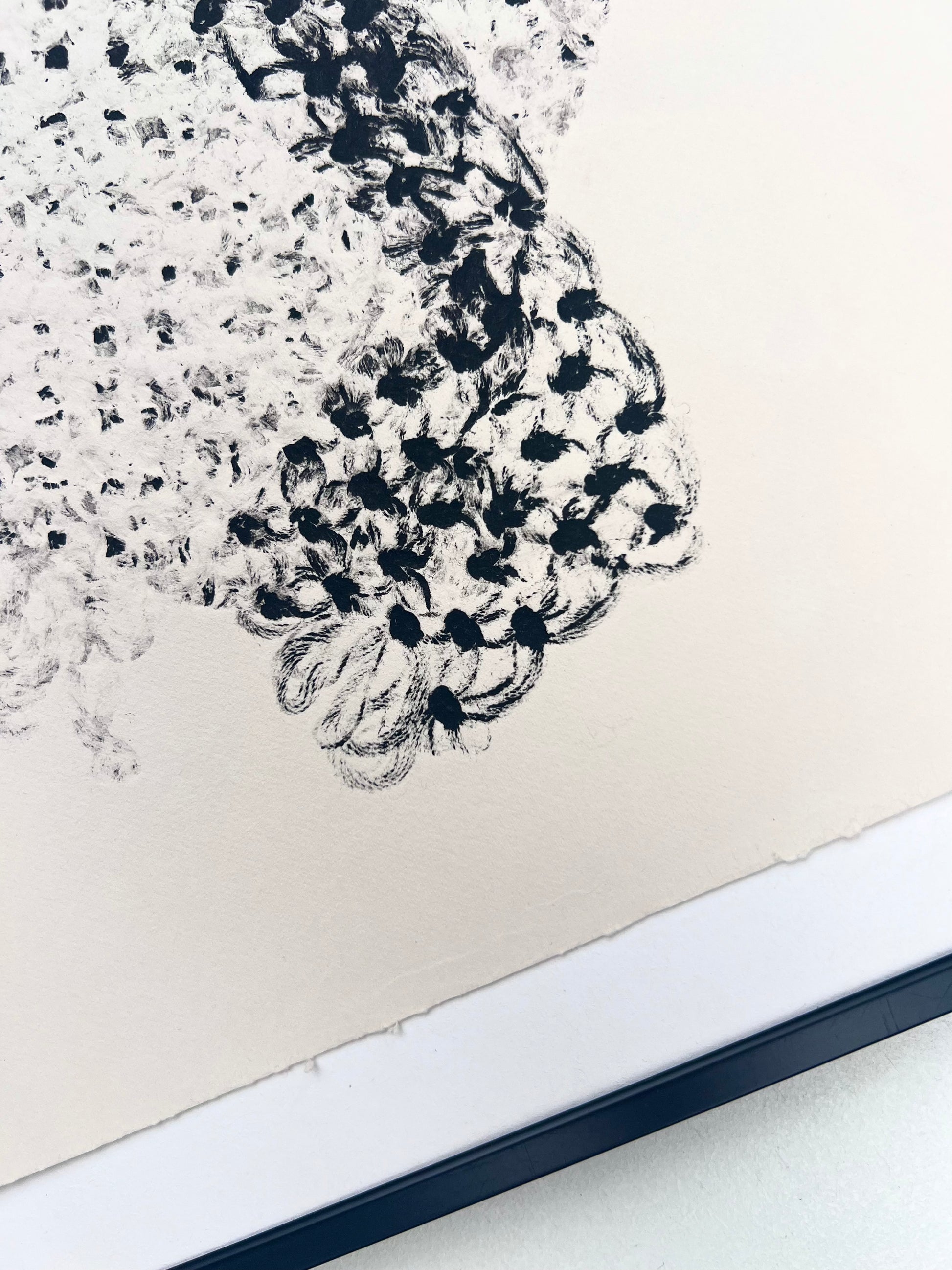 Estampe d'une matrice en fibres de coton nouées enduite d’une encre d’impression (noir carbone) et passée sous presse sur un papier Fabriano Rosaspina de 250g