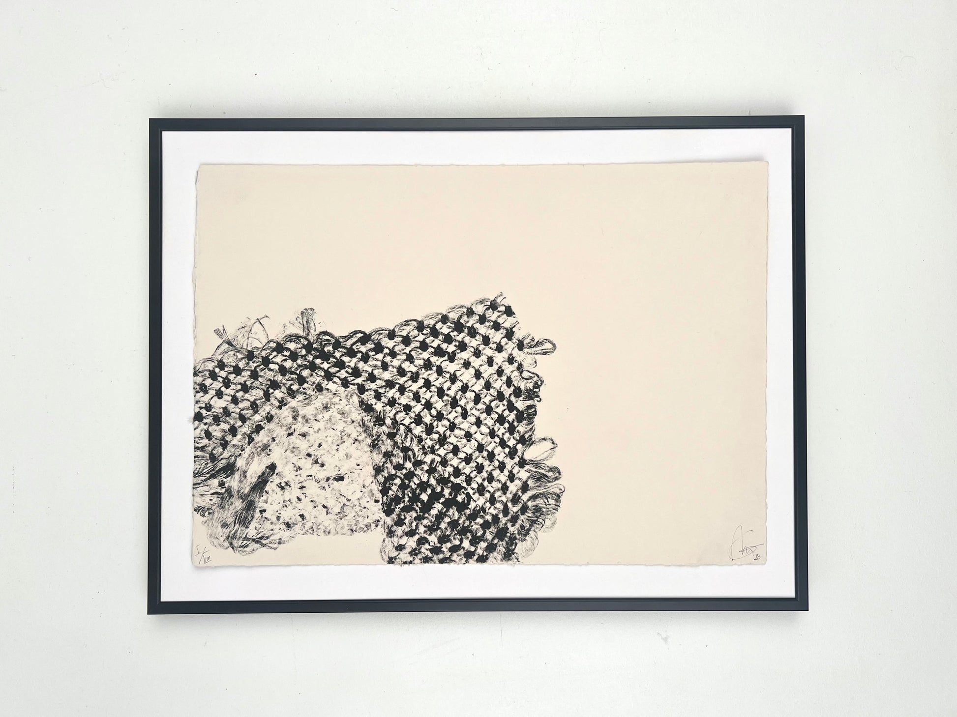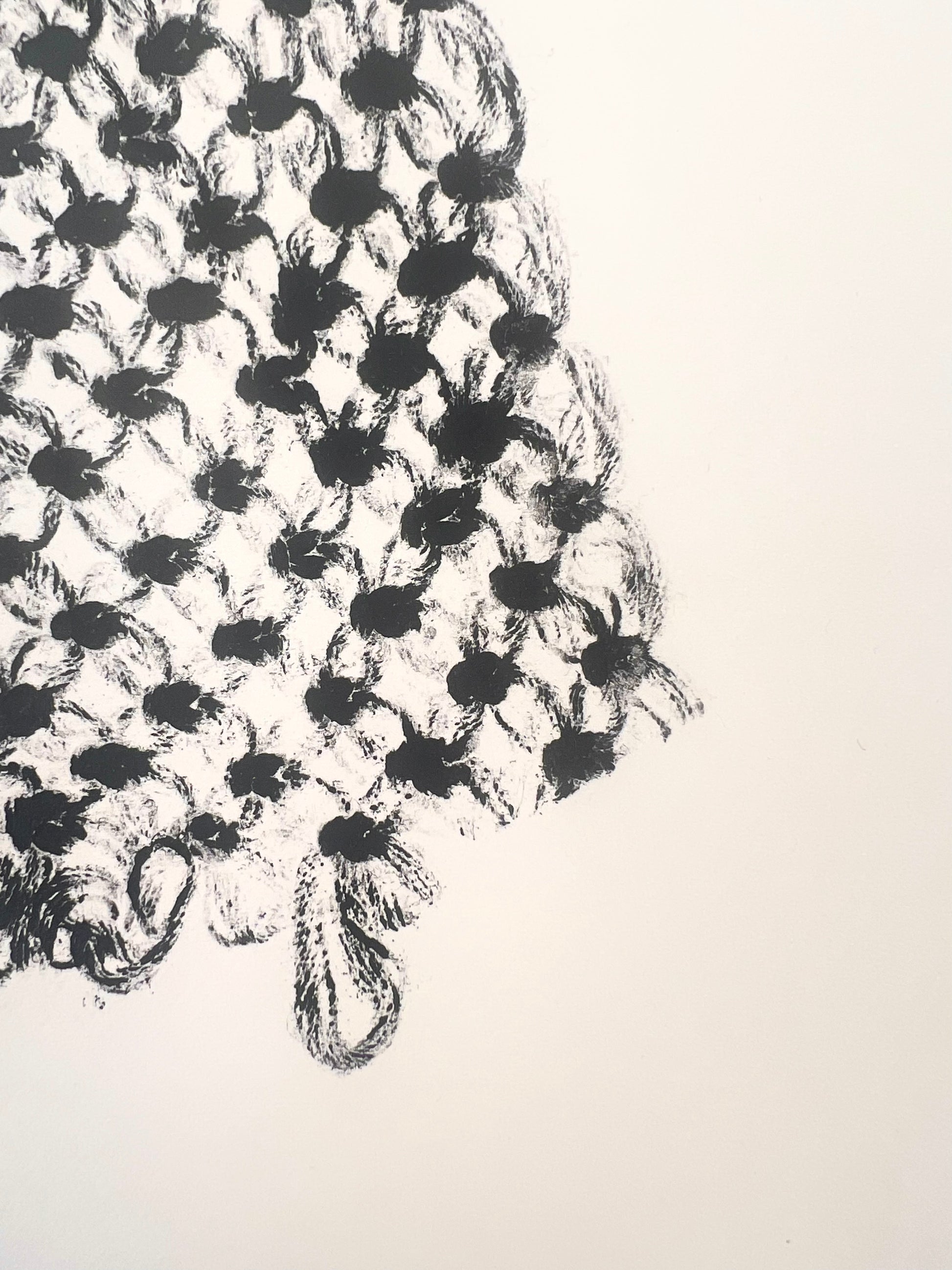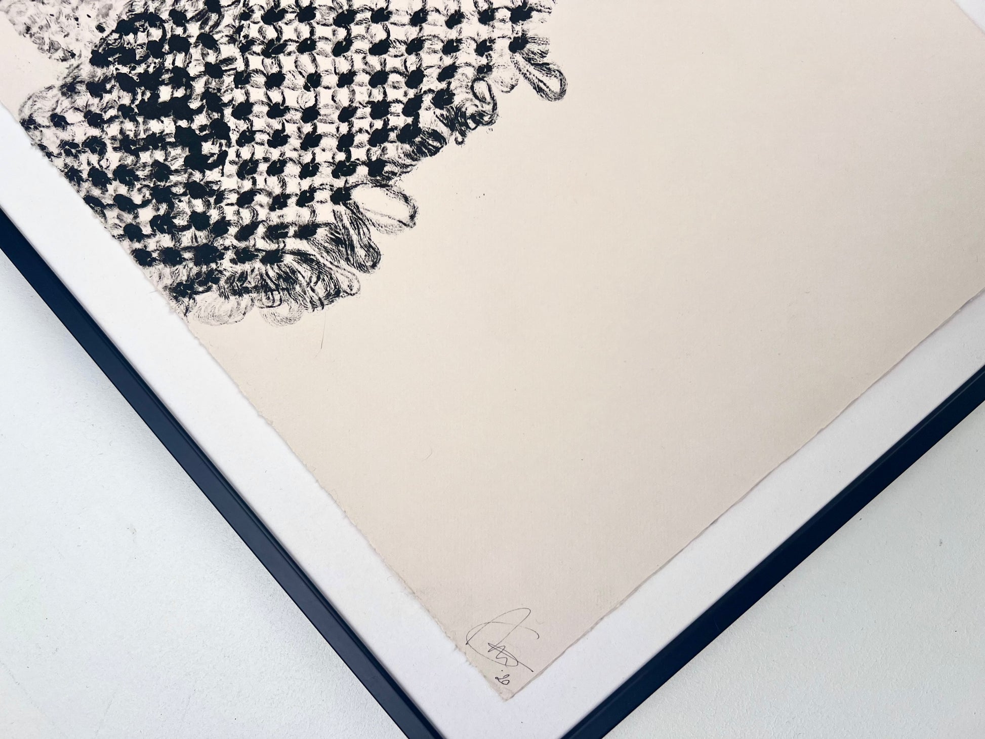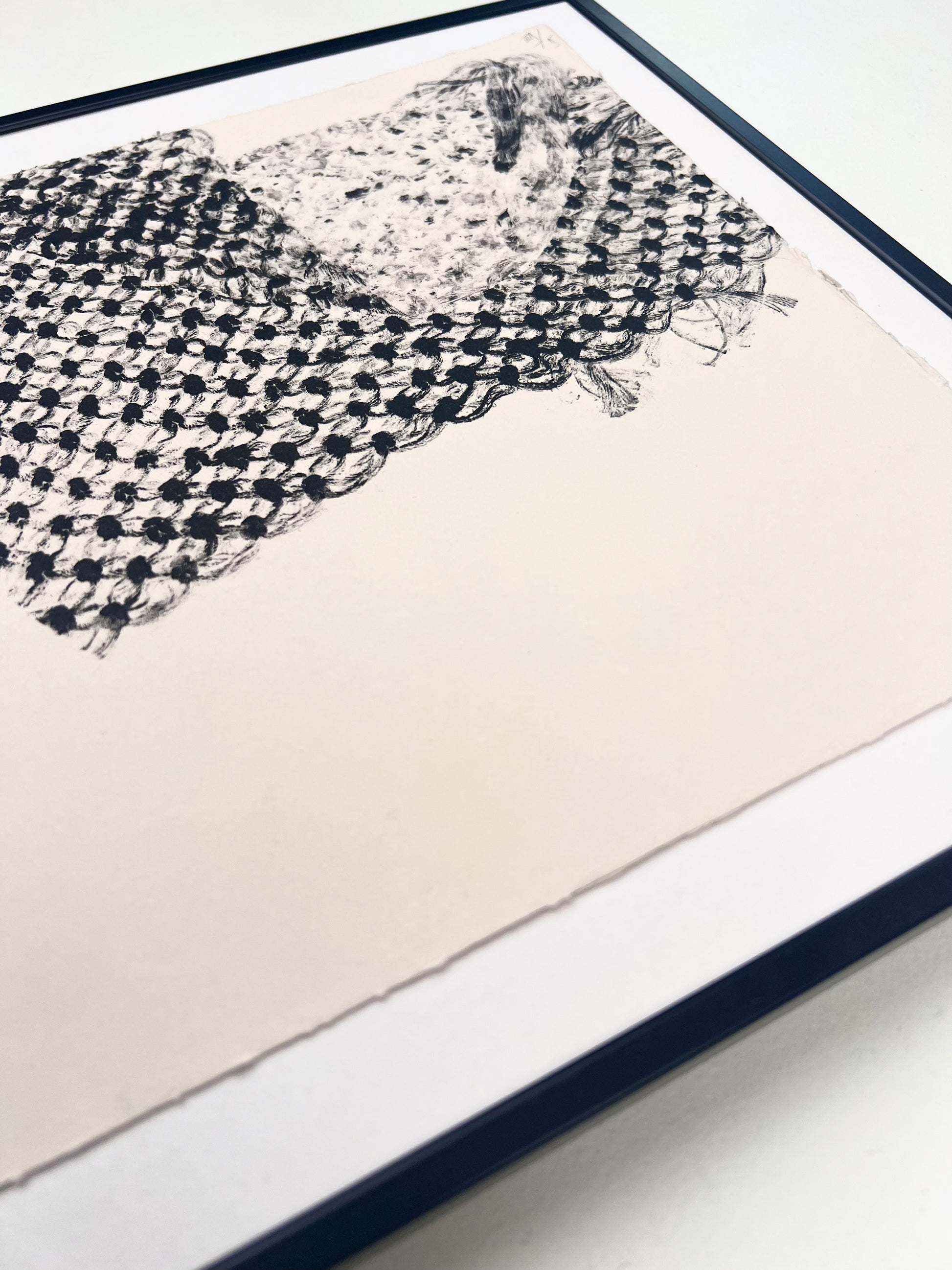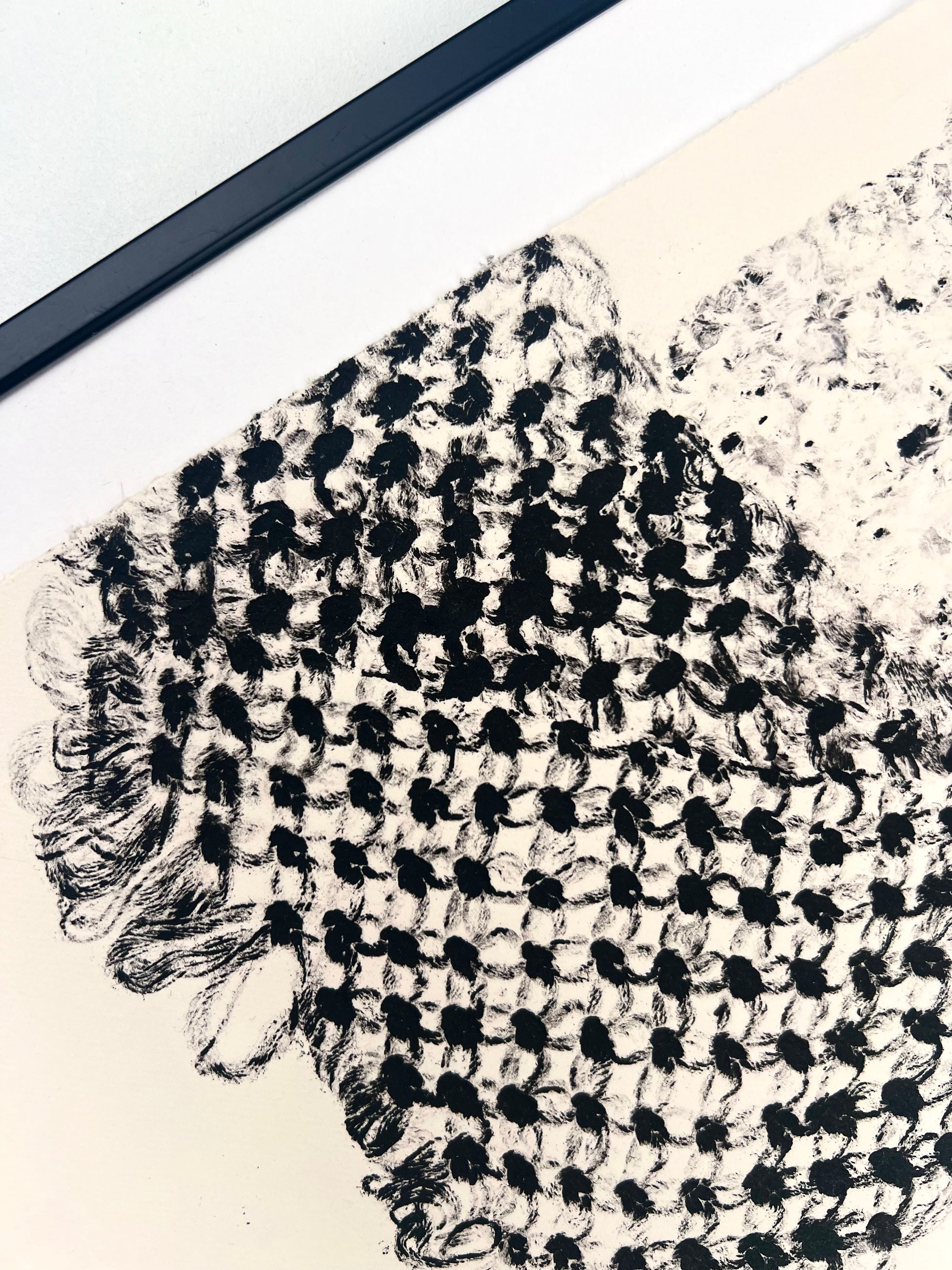 Estampe d'une matrice en fibres de coton nouées enduite d’une encre d’impression (noir carbone) et passée sous presse sur un papier Fabriano Rosaspina de 250g