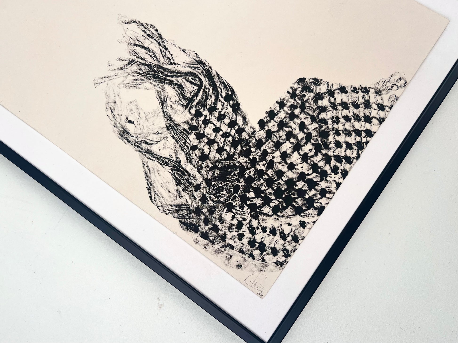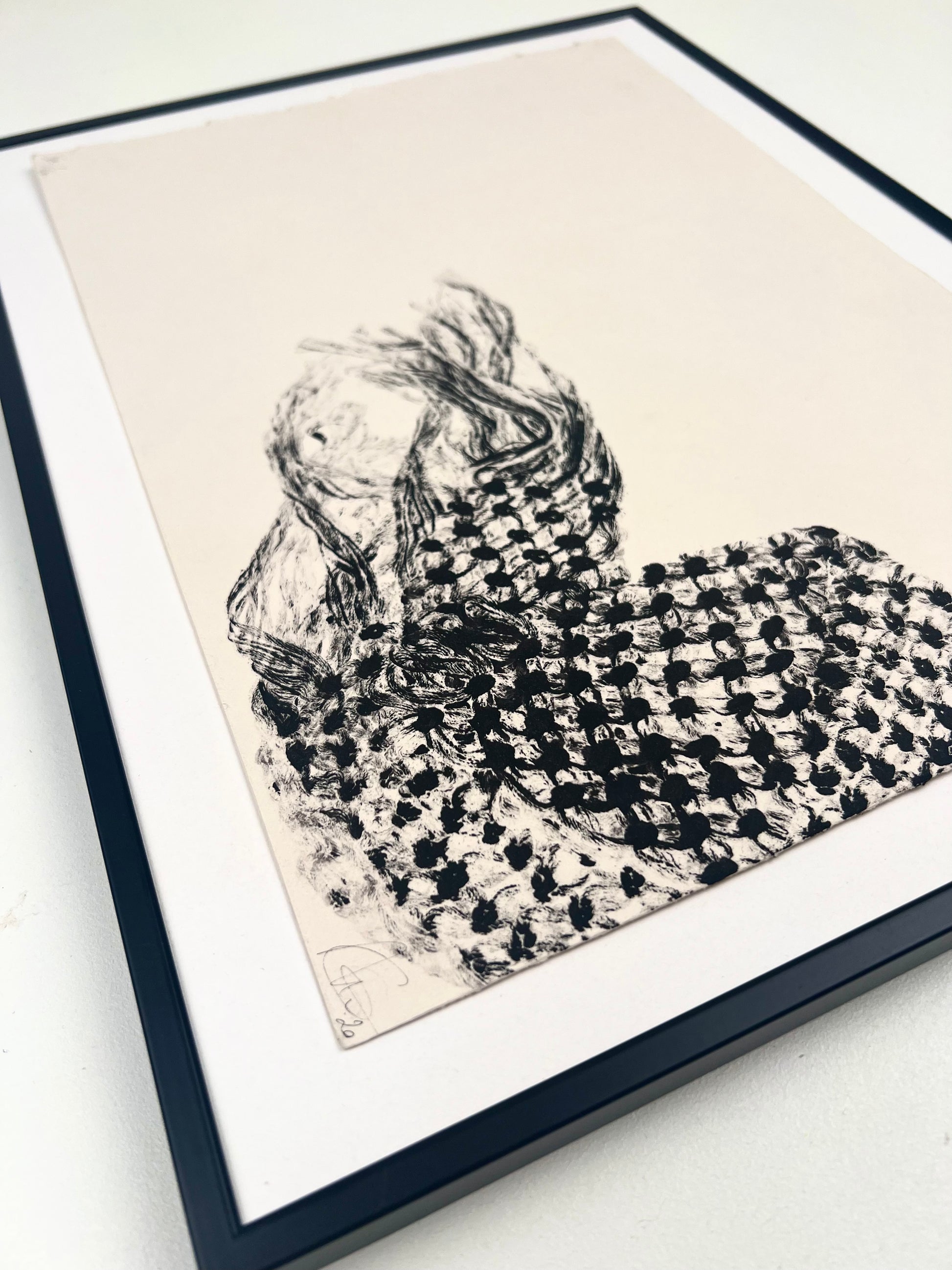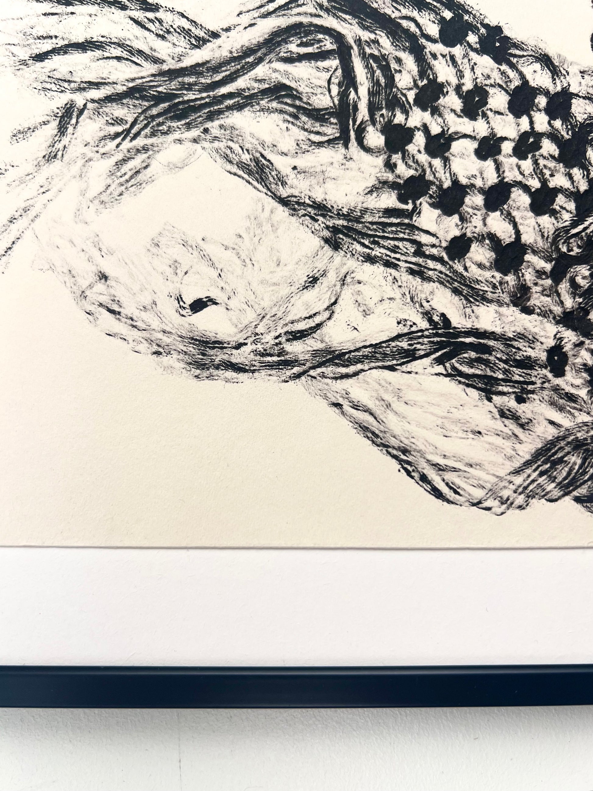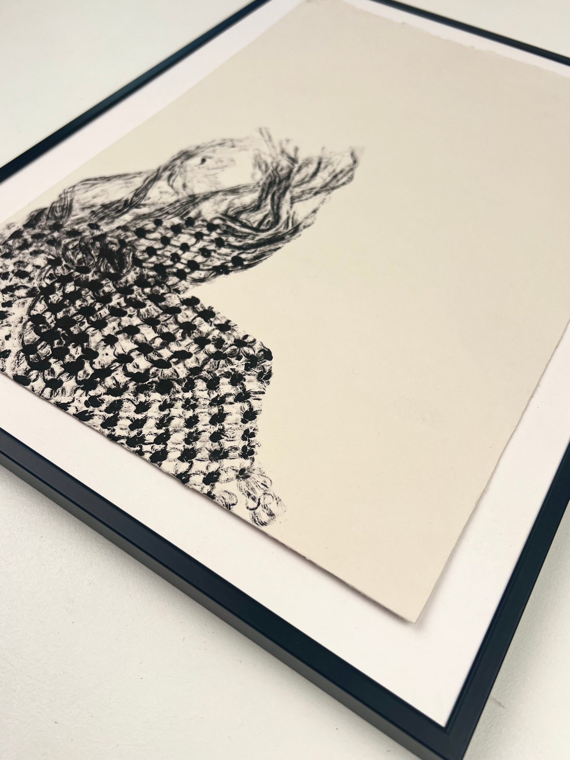 Estampe d'une matrice en fibres de coton nouées enduite d’une encre d’impression (noir carbone) et passée sous presse sur un papier Fabriano Rosaspina de 250g
