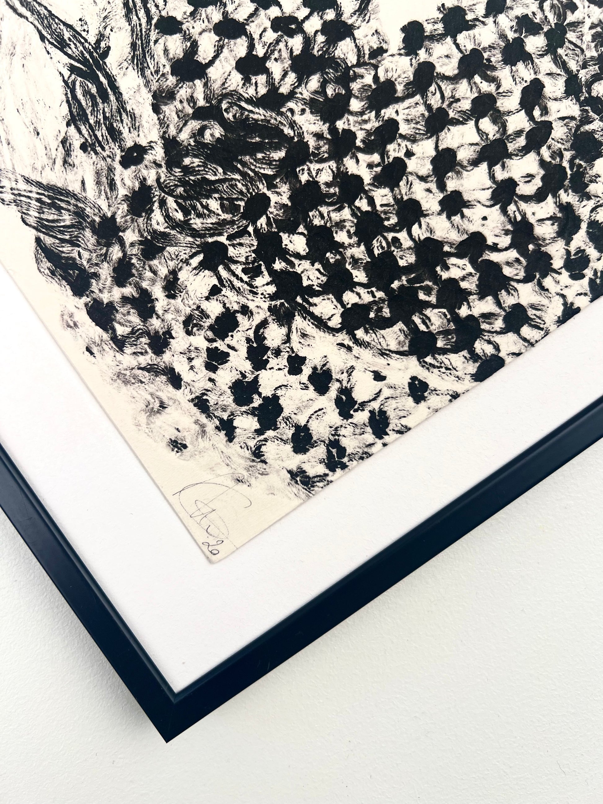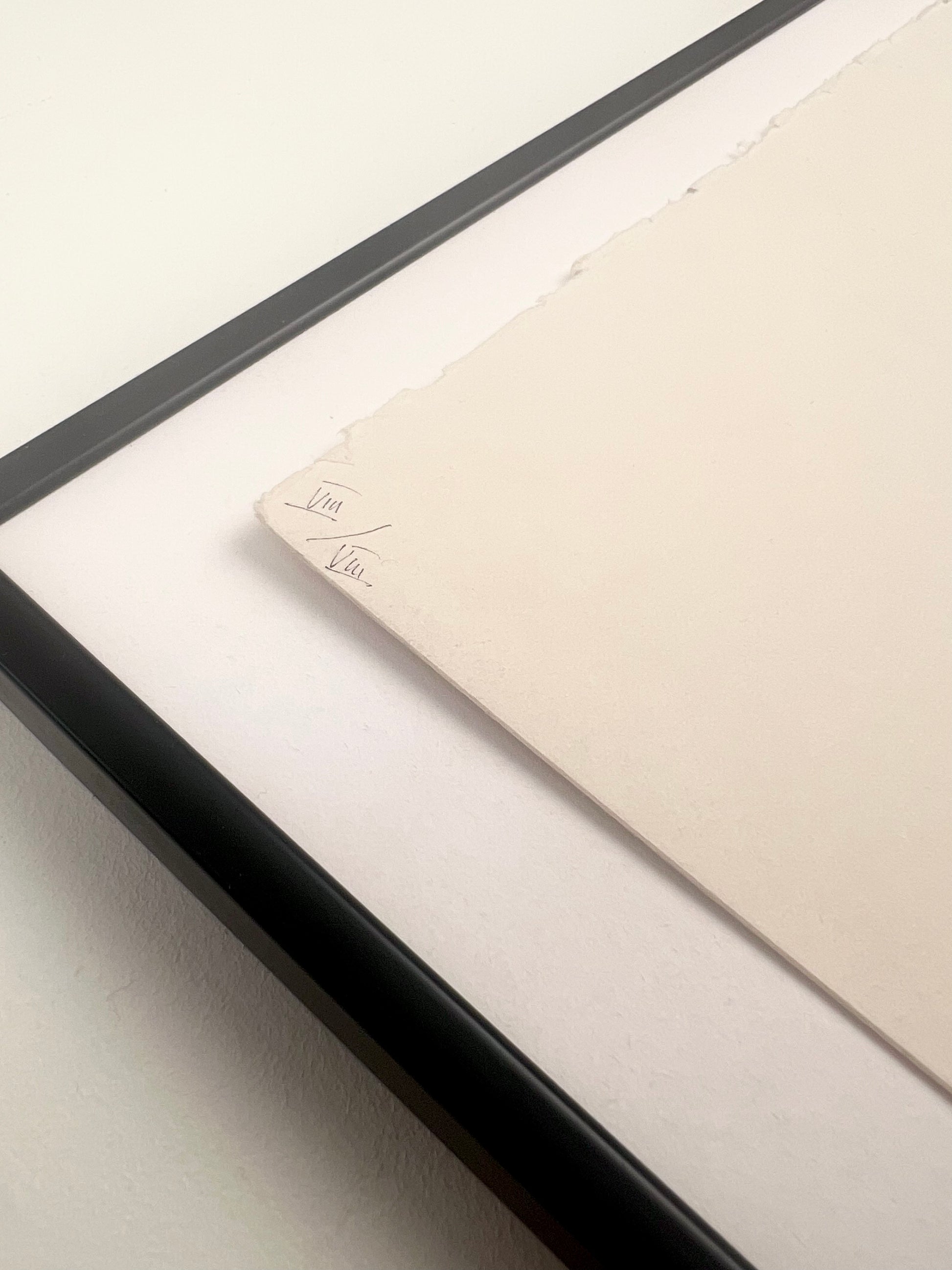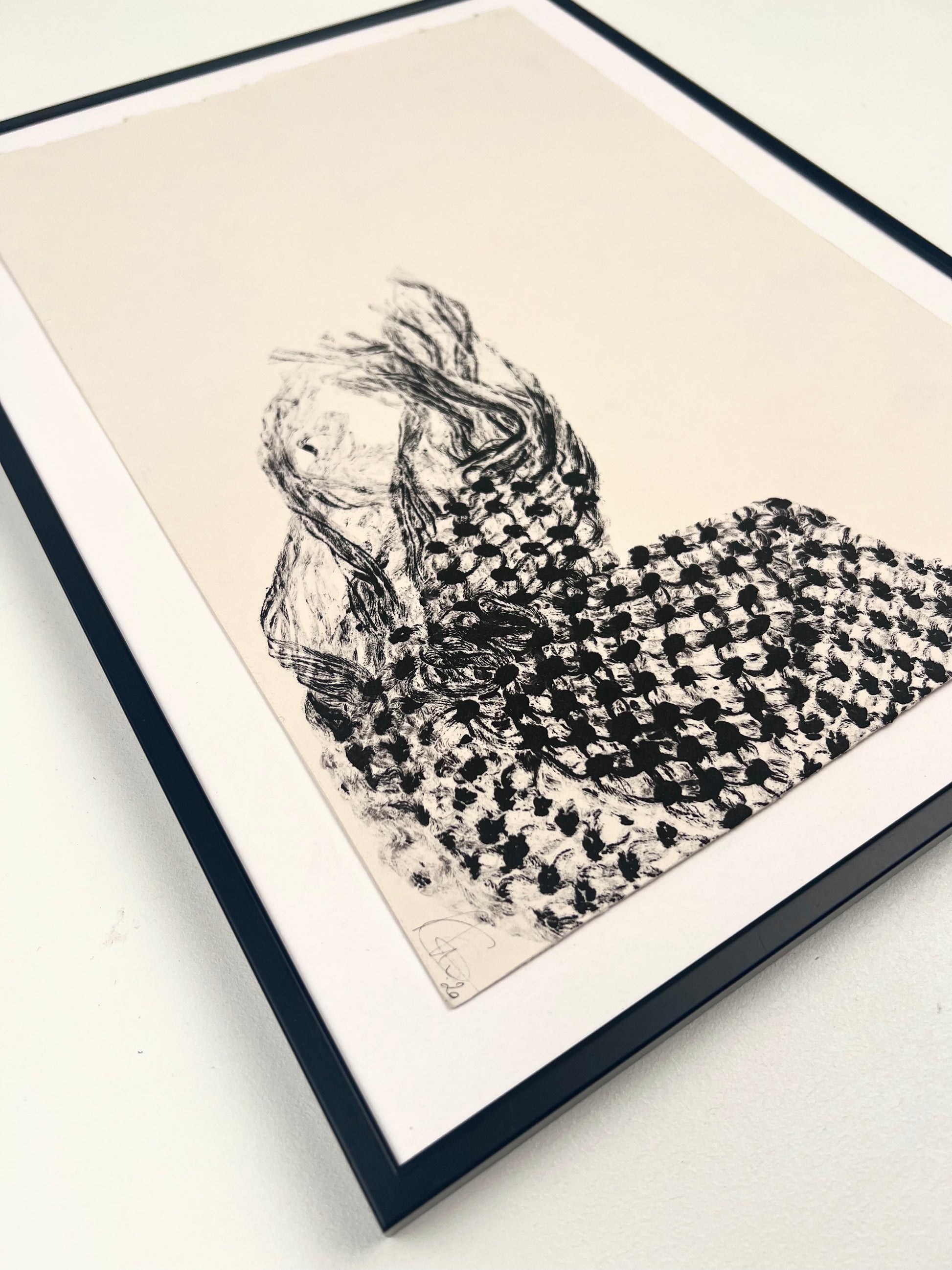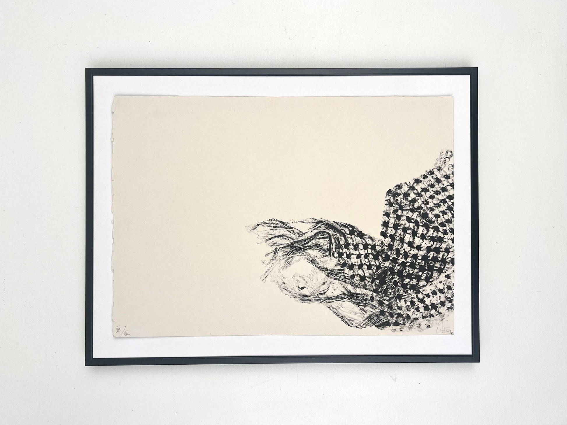 Estampe d'une matrice en fibres de coton nouées enduite d’une encre d’impression (noir carbone) et passée sous presse sur un papier Fabriano Rosaspina de 250g