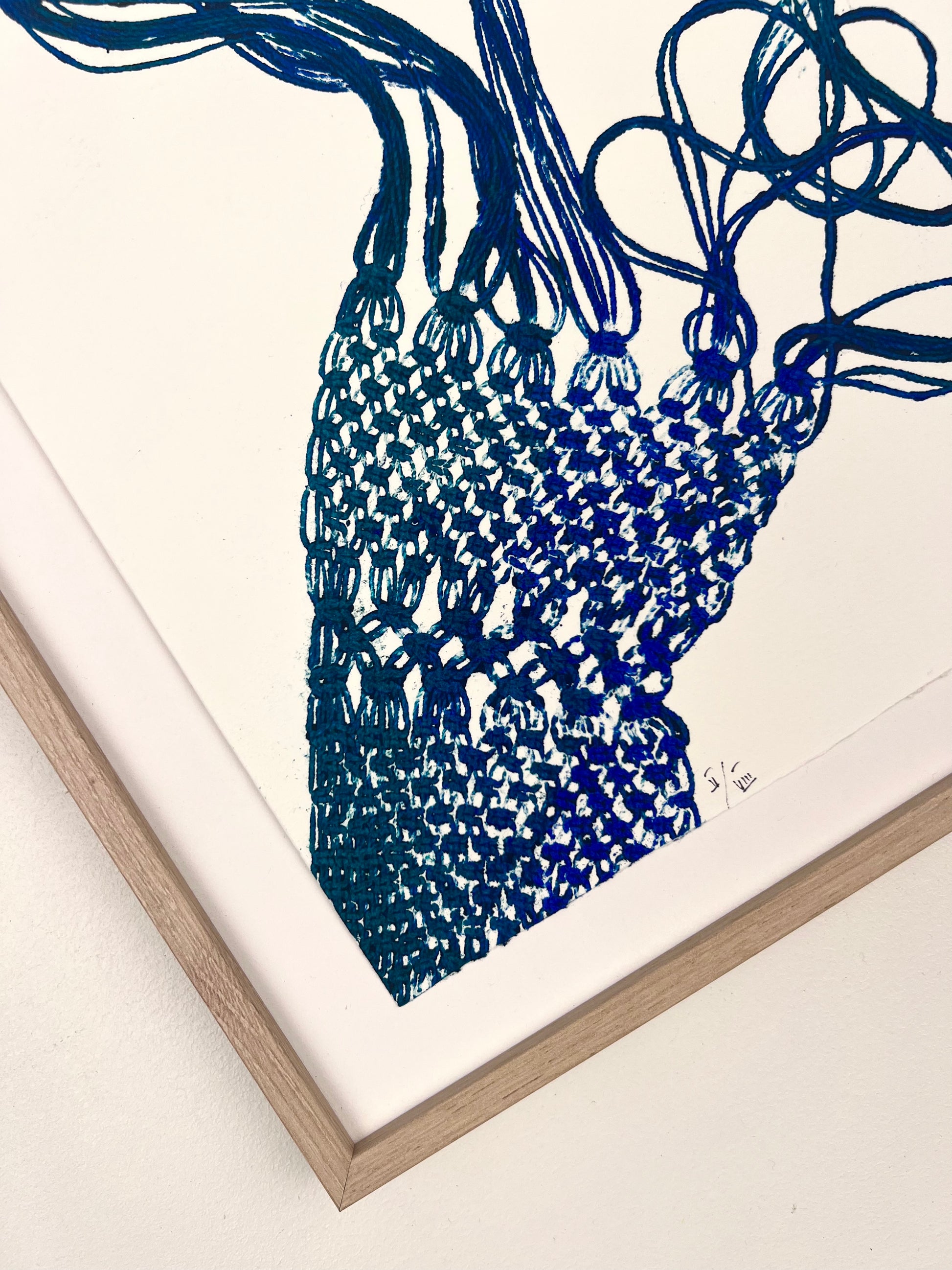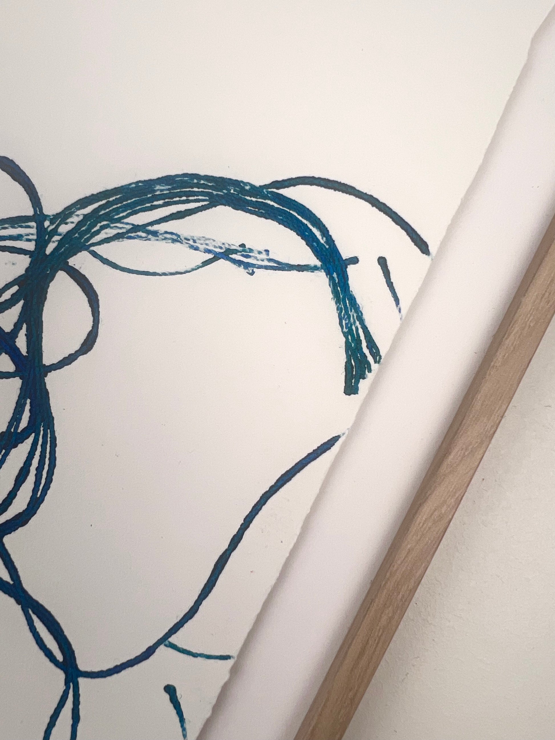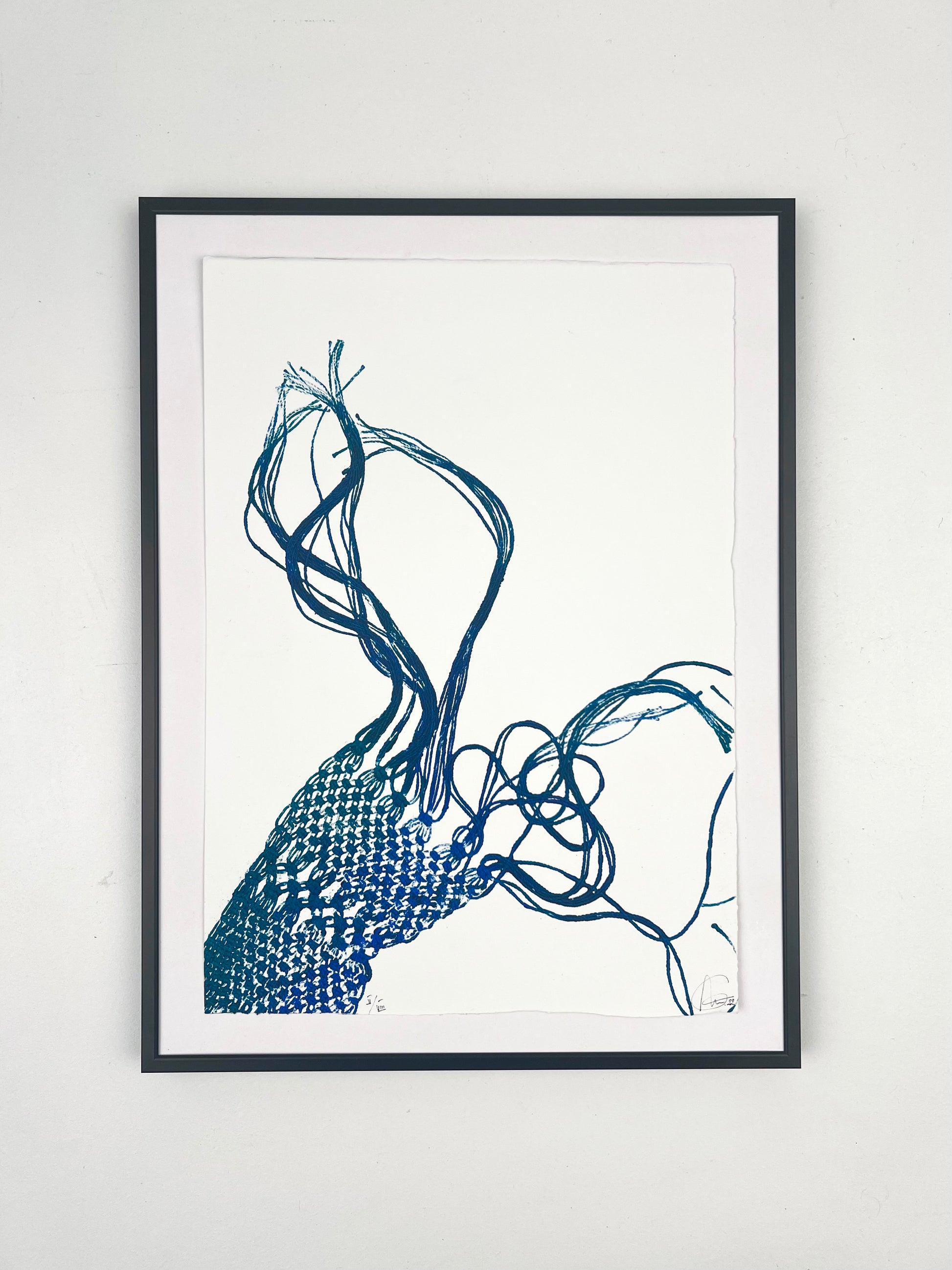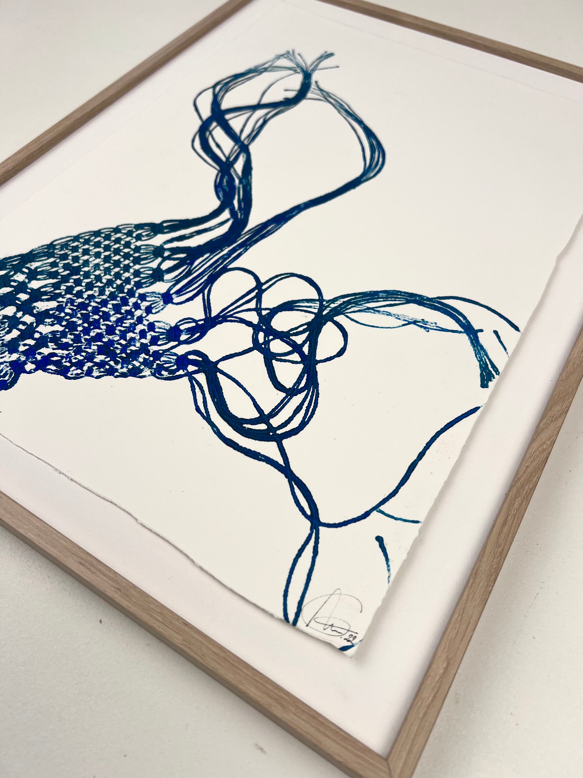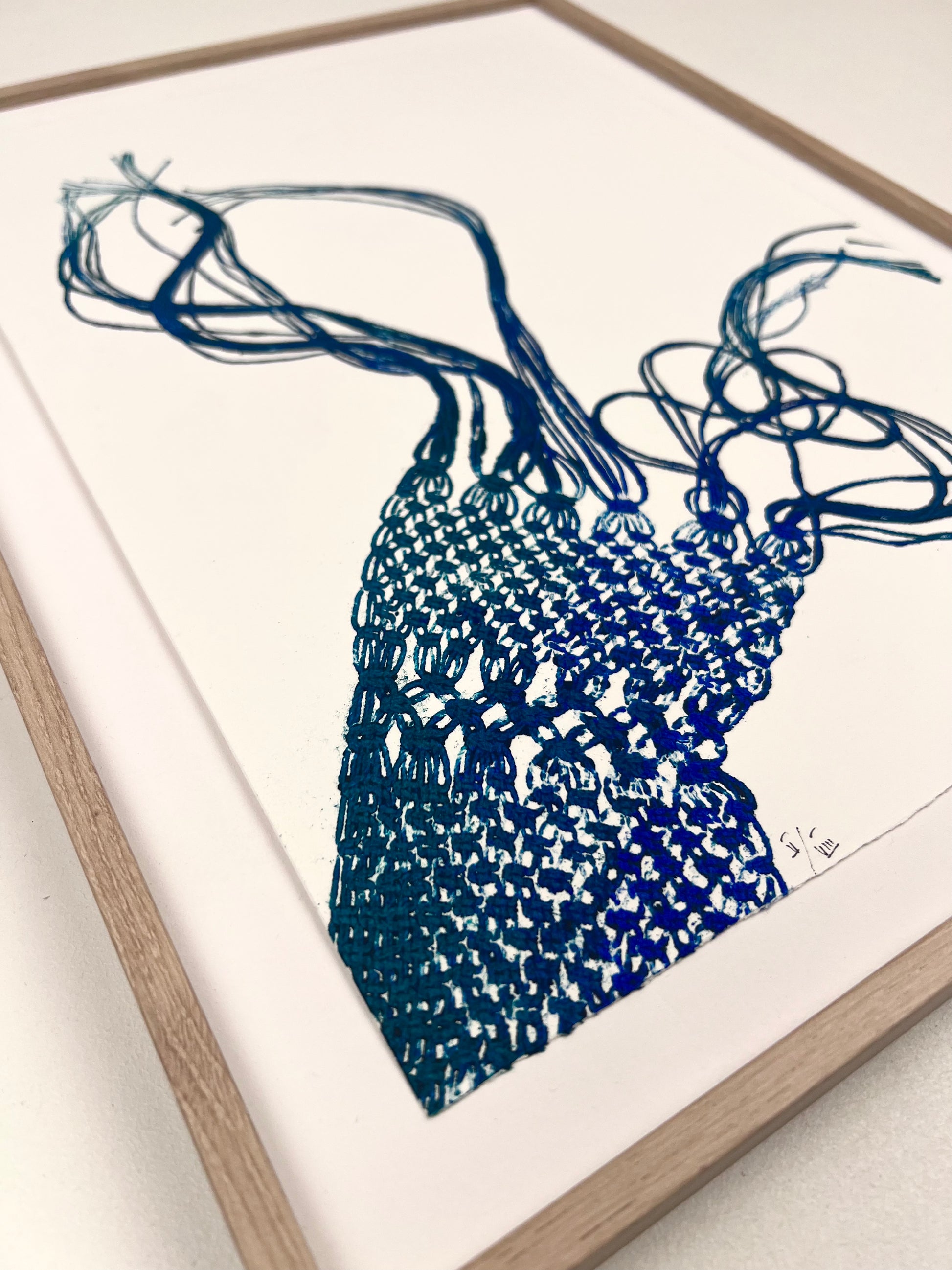 Estampe d'une matrice en fibres de coton nouées enduite de plusieurs encres d’impression et passée sous presse sur un papier Fabriano ivoire de 300g