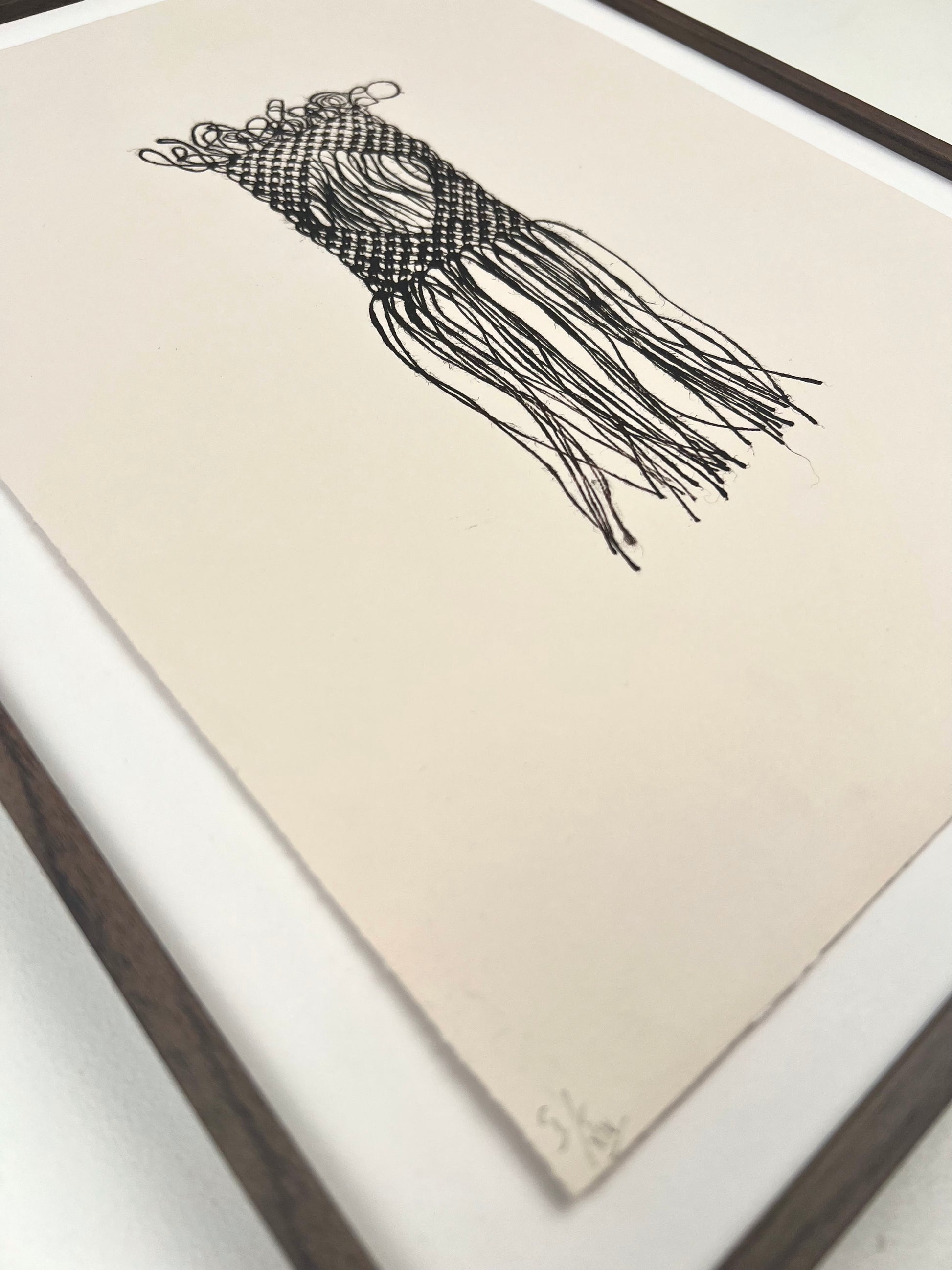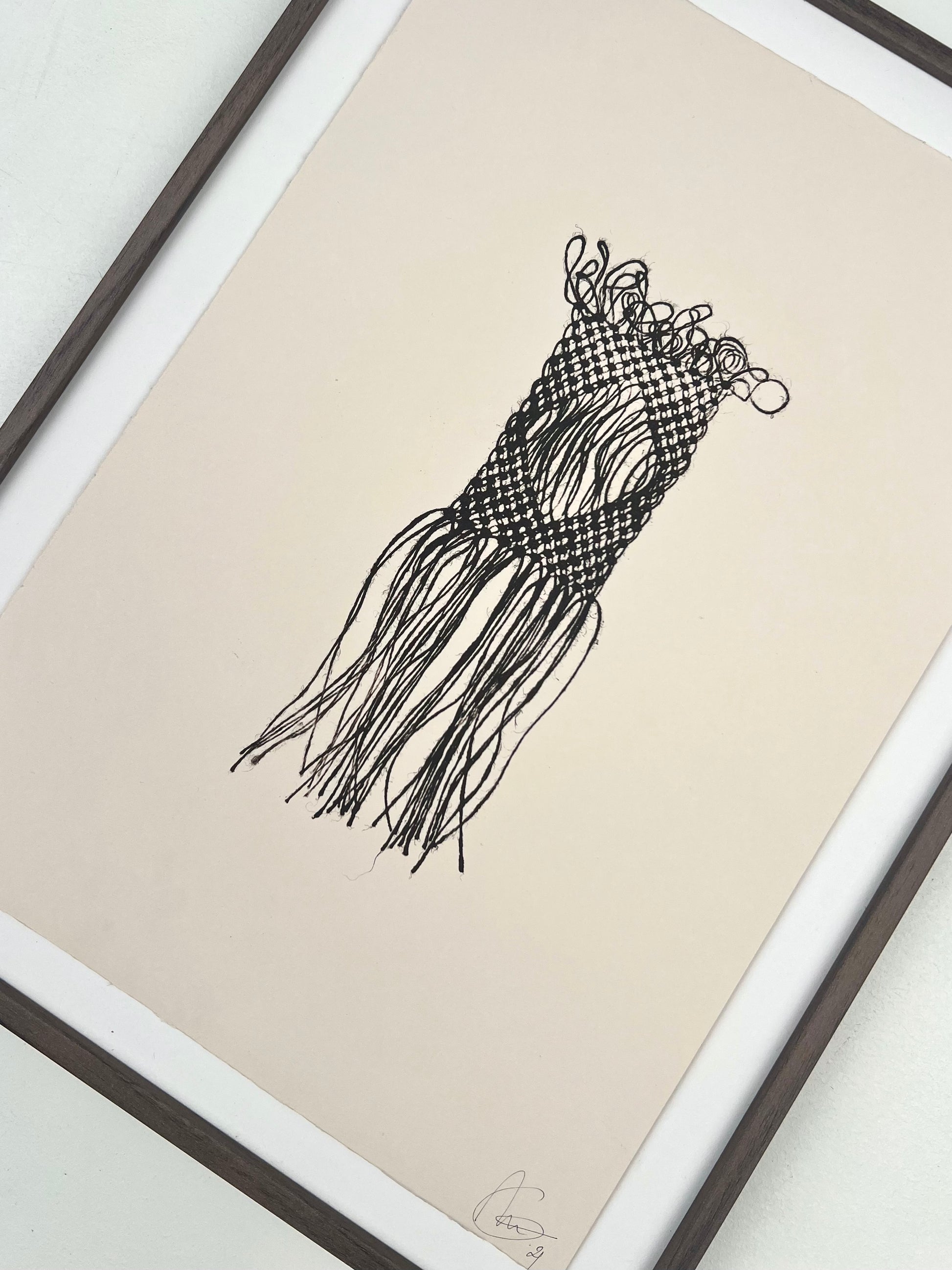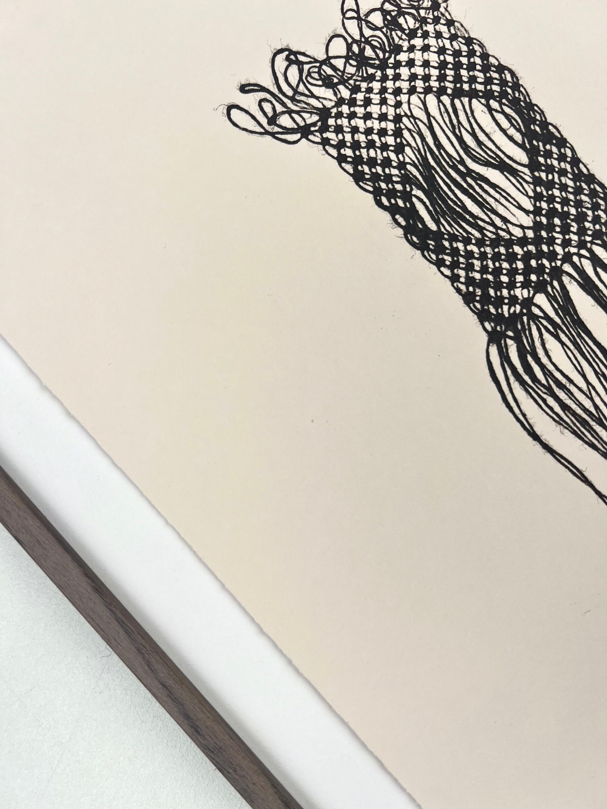 Estampe de trois matrices en fibres de lin nouées enduite de plusieurs encres d’impression et passée sous presse sur un papier Fabriano ivoire de 300g