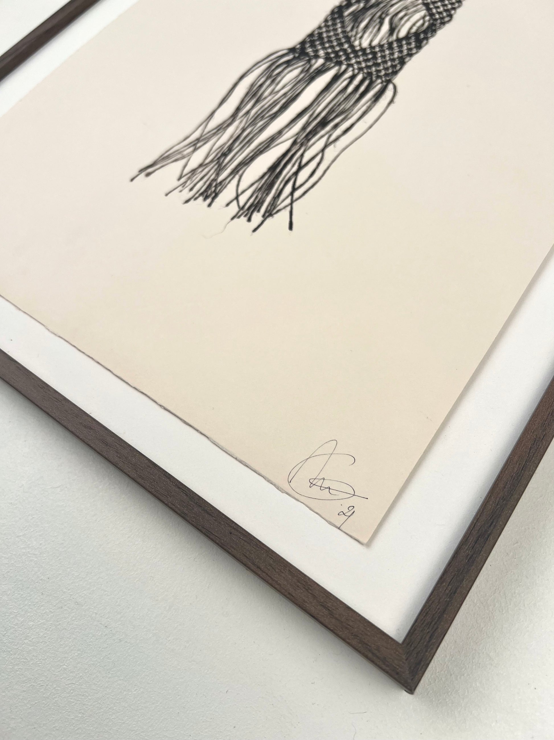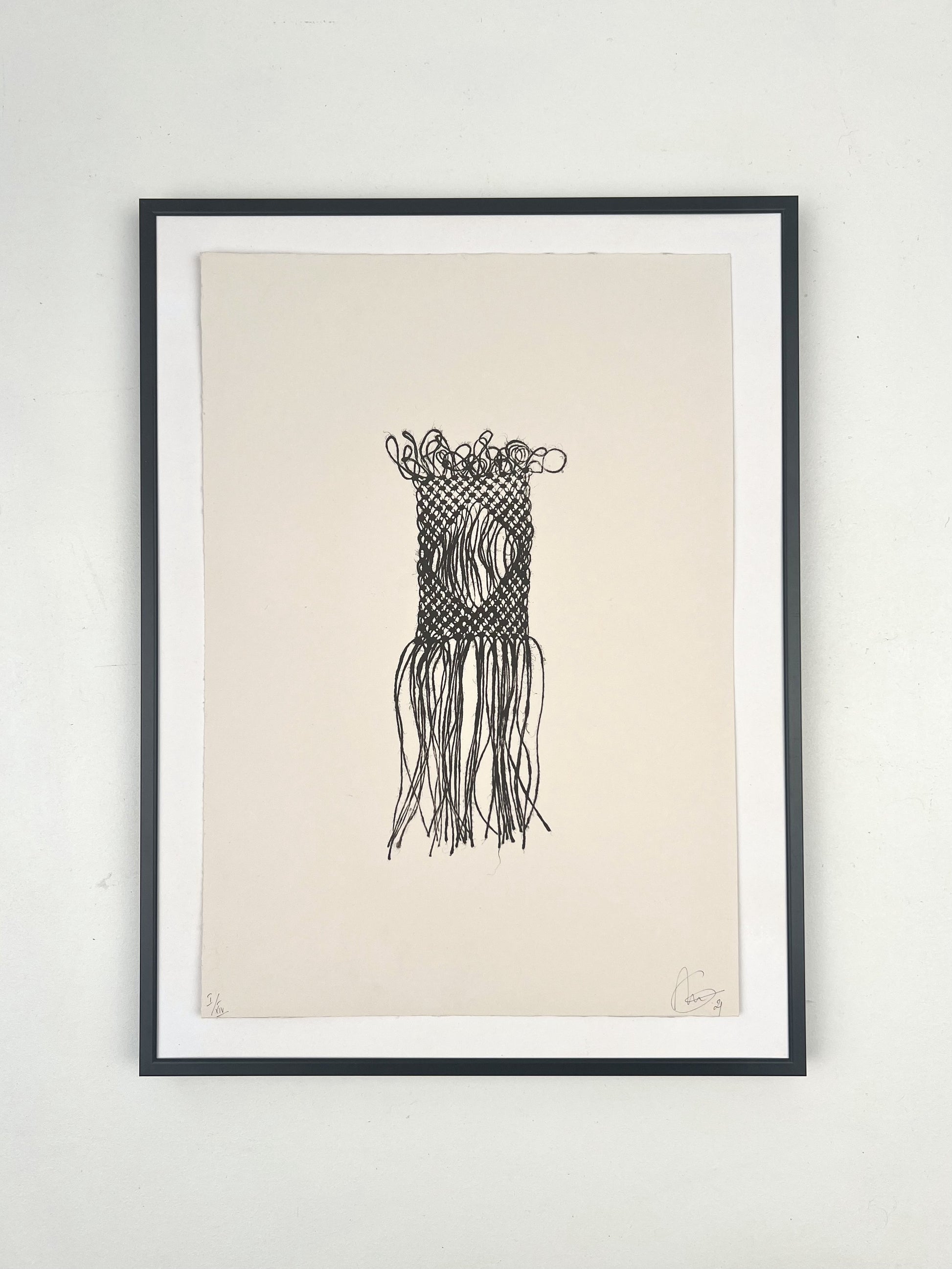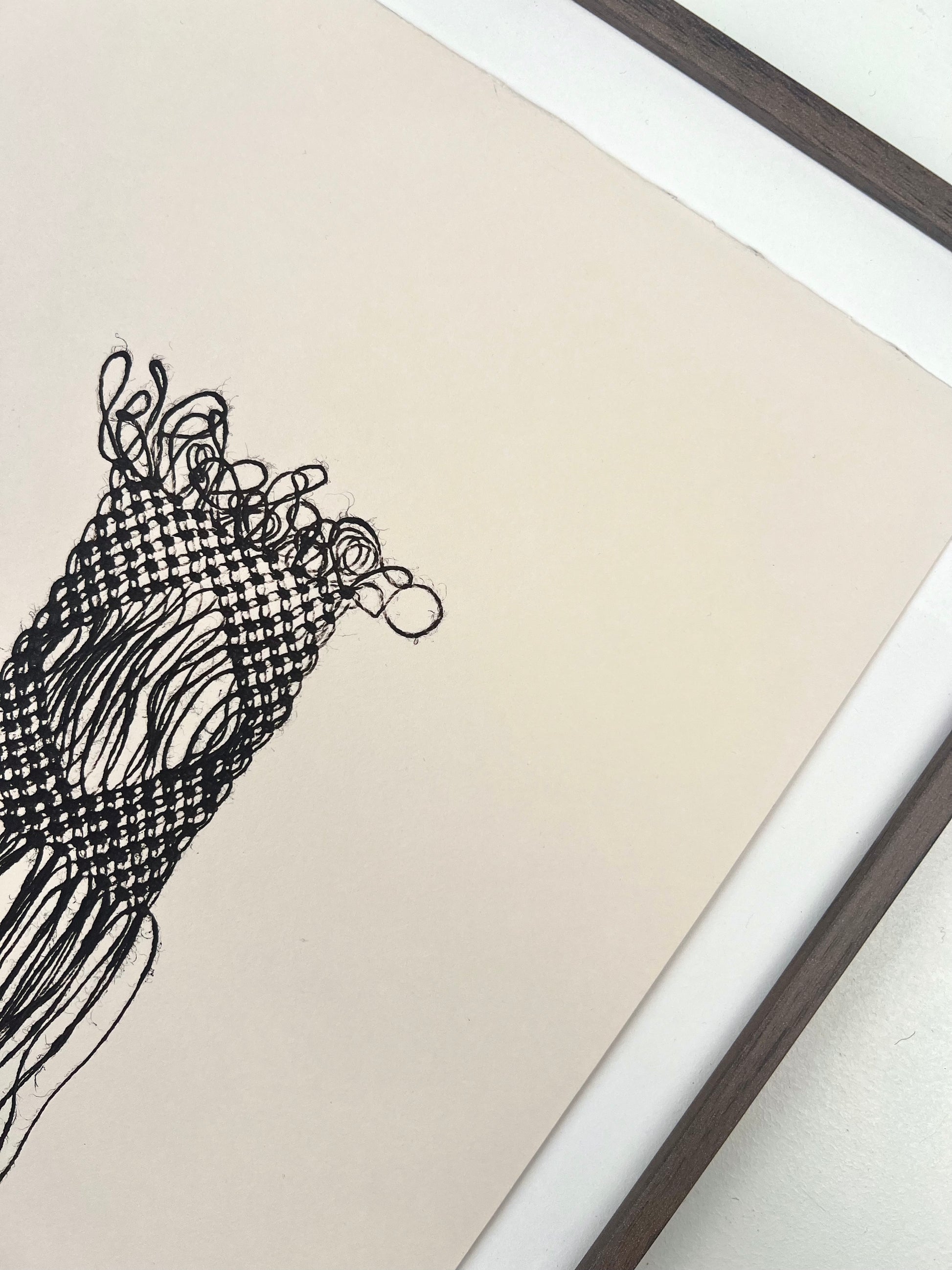 Estampe de trois matrices en fibres de lin nouées enduite de plusieurs encres d’impression et passée sous presse sur un papier Fabriano ivoire de 300g