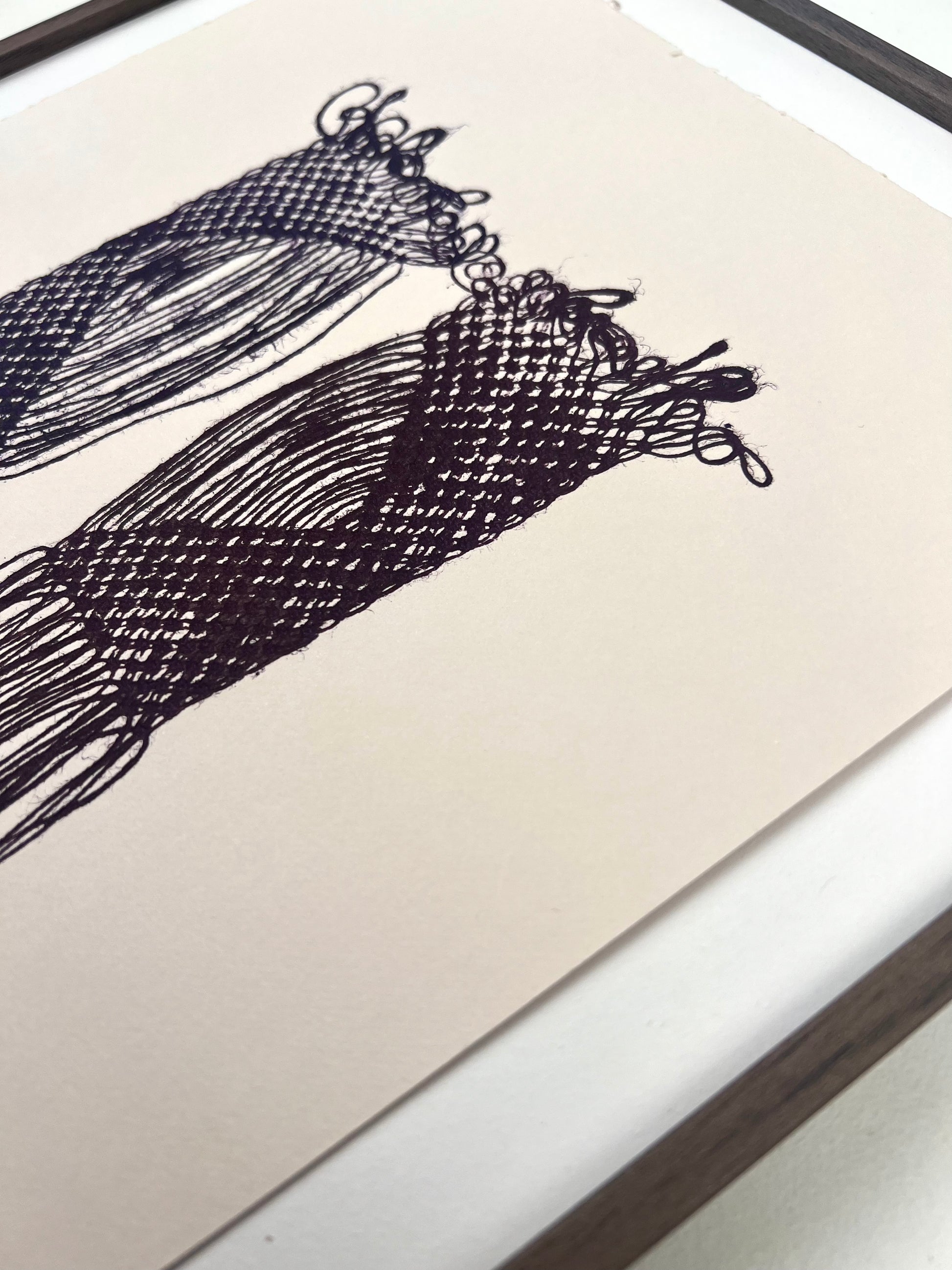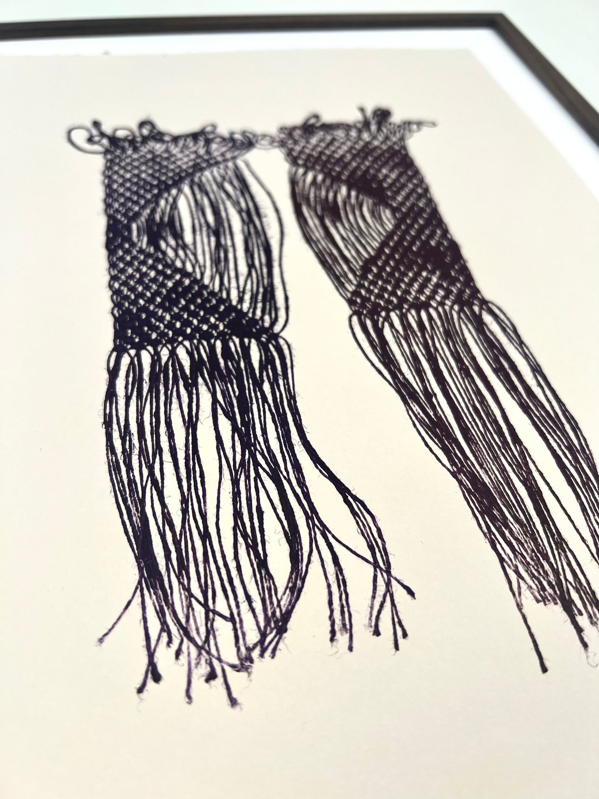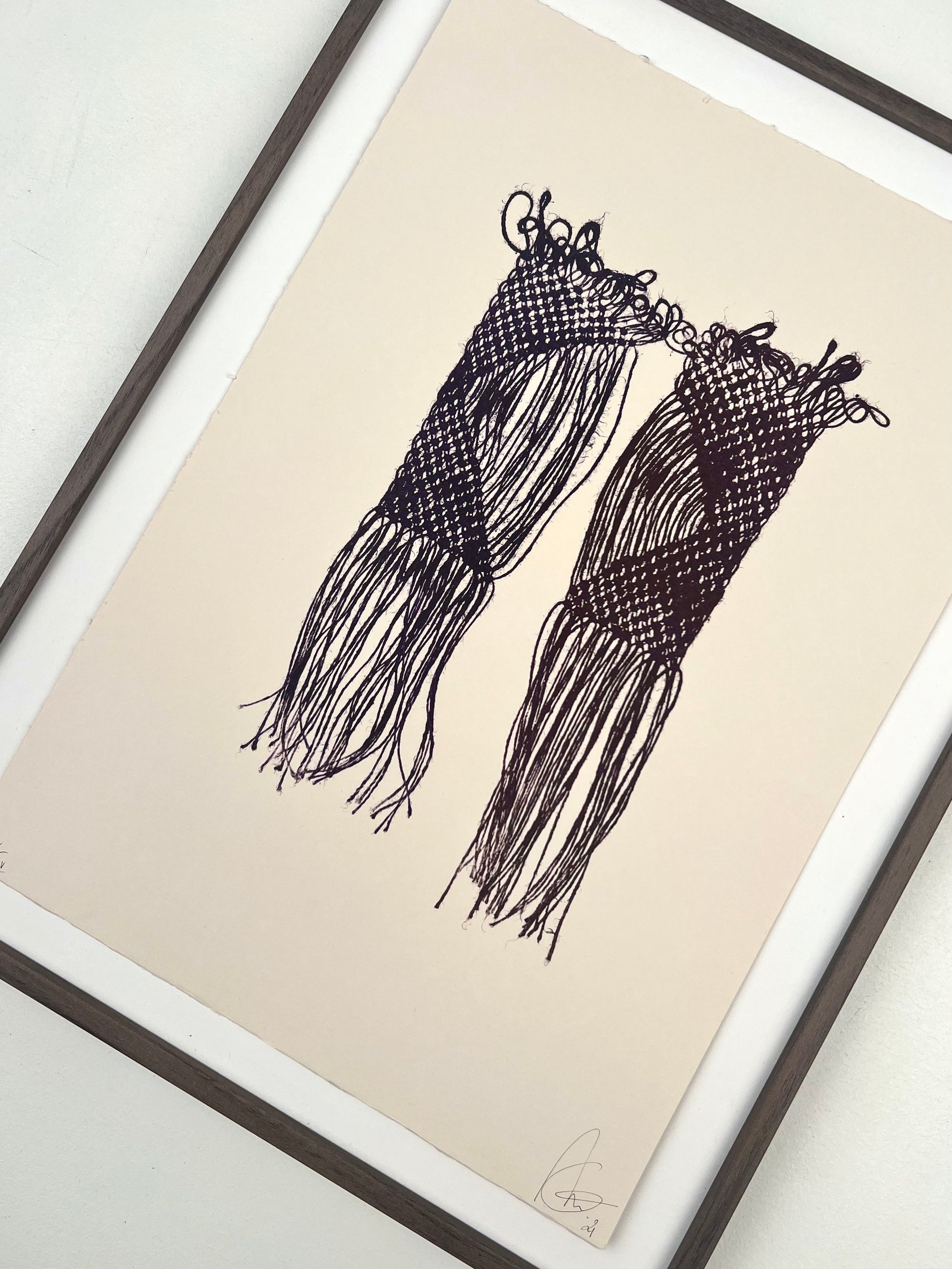 Estampe de trois matrices en fibres de lin nouées enduite de plusieurs encres d’impression et passée sous presse sur un papier Fabriano ivoire de 300g
