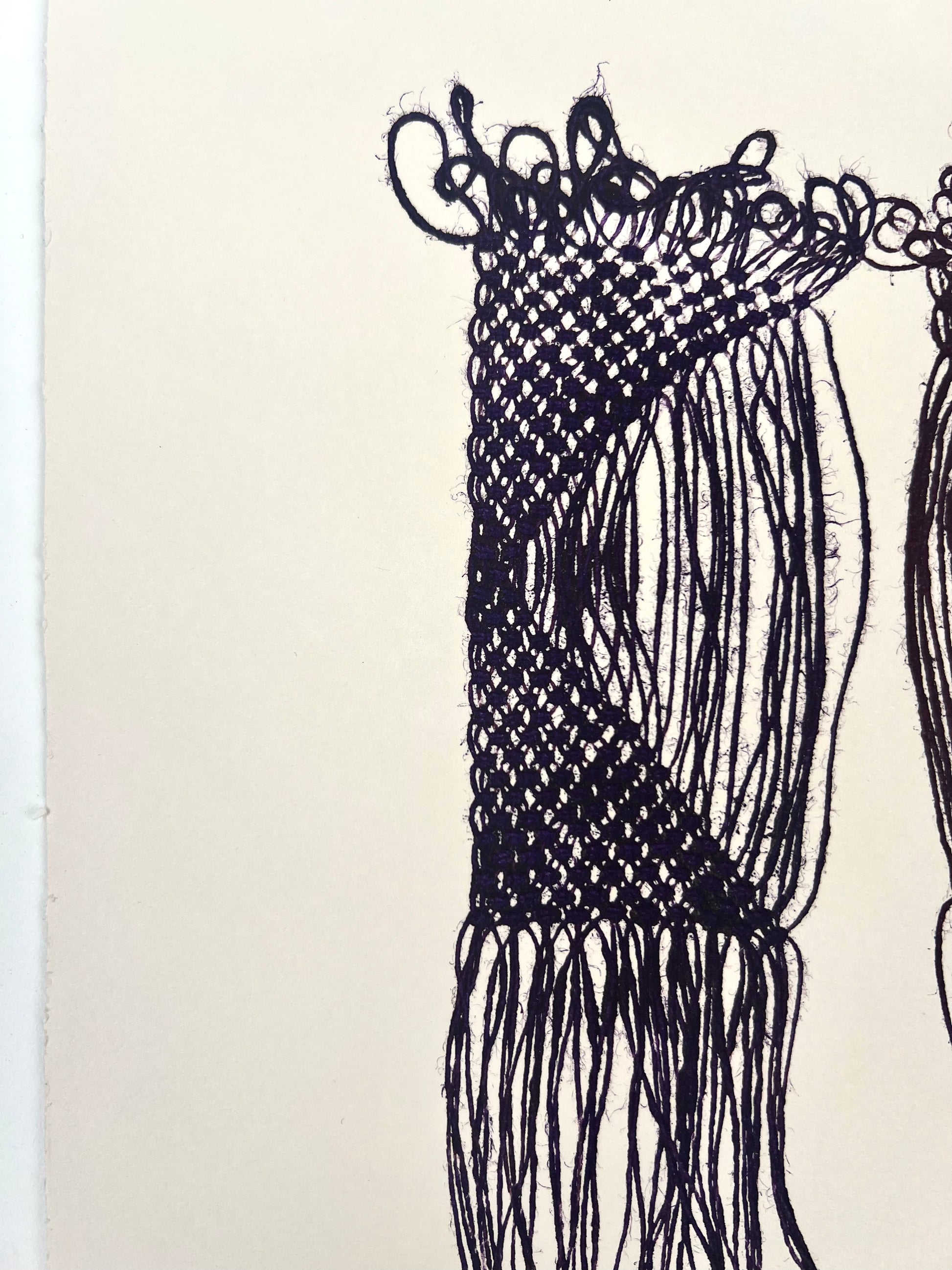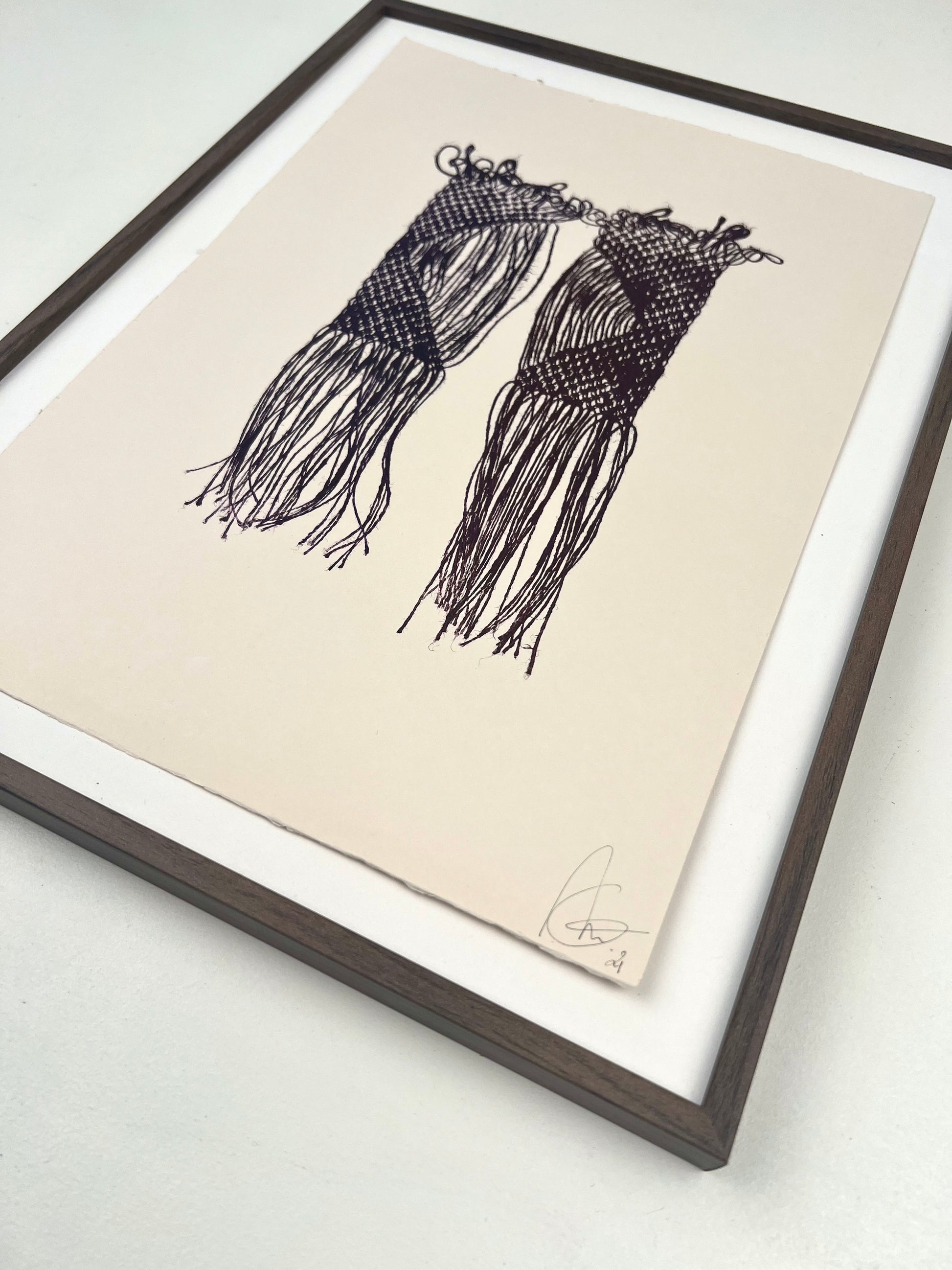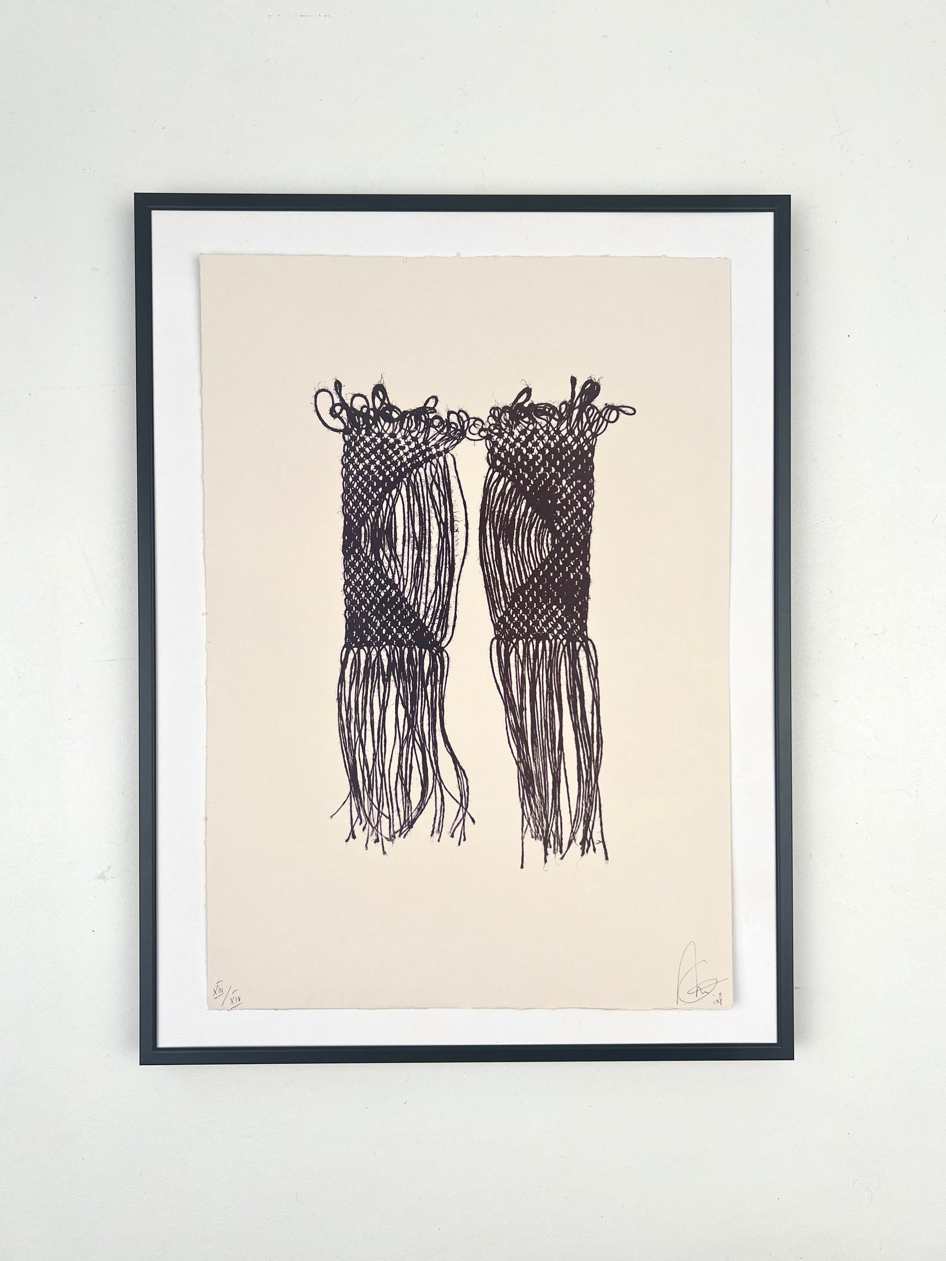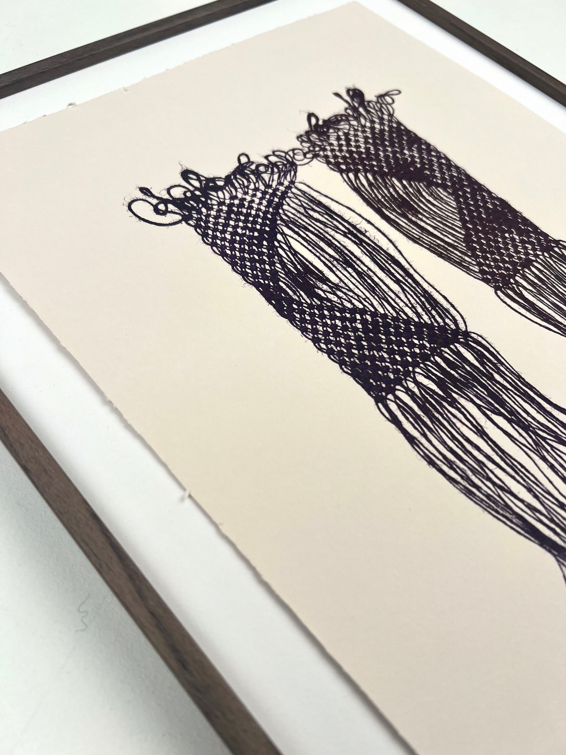 Estampe de trois matrices en fibres de lin nouées enduite de plusieurs encres d’impression et passée sous presse sur un papier Fabriano ivoire de 300g