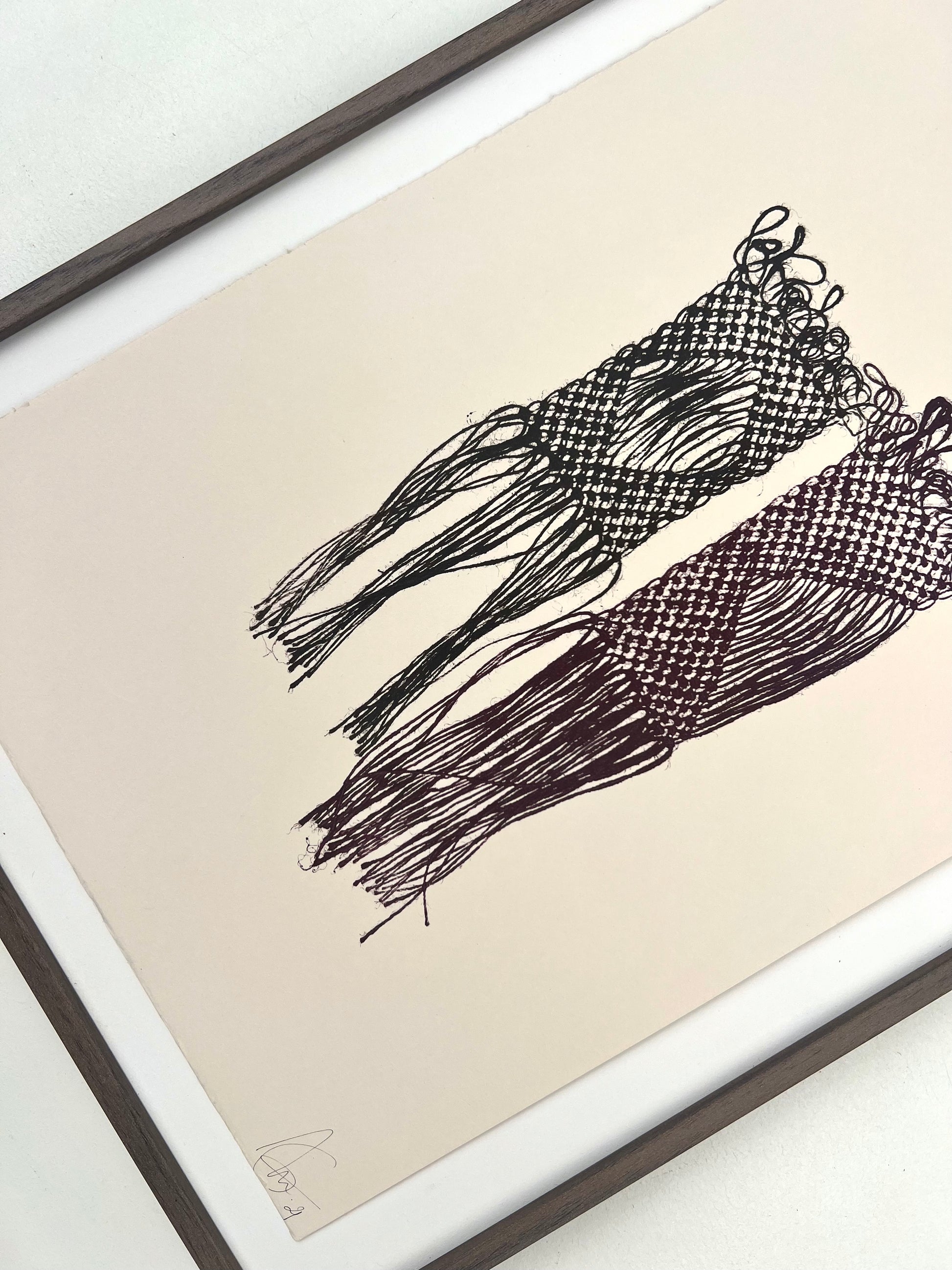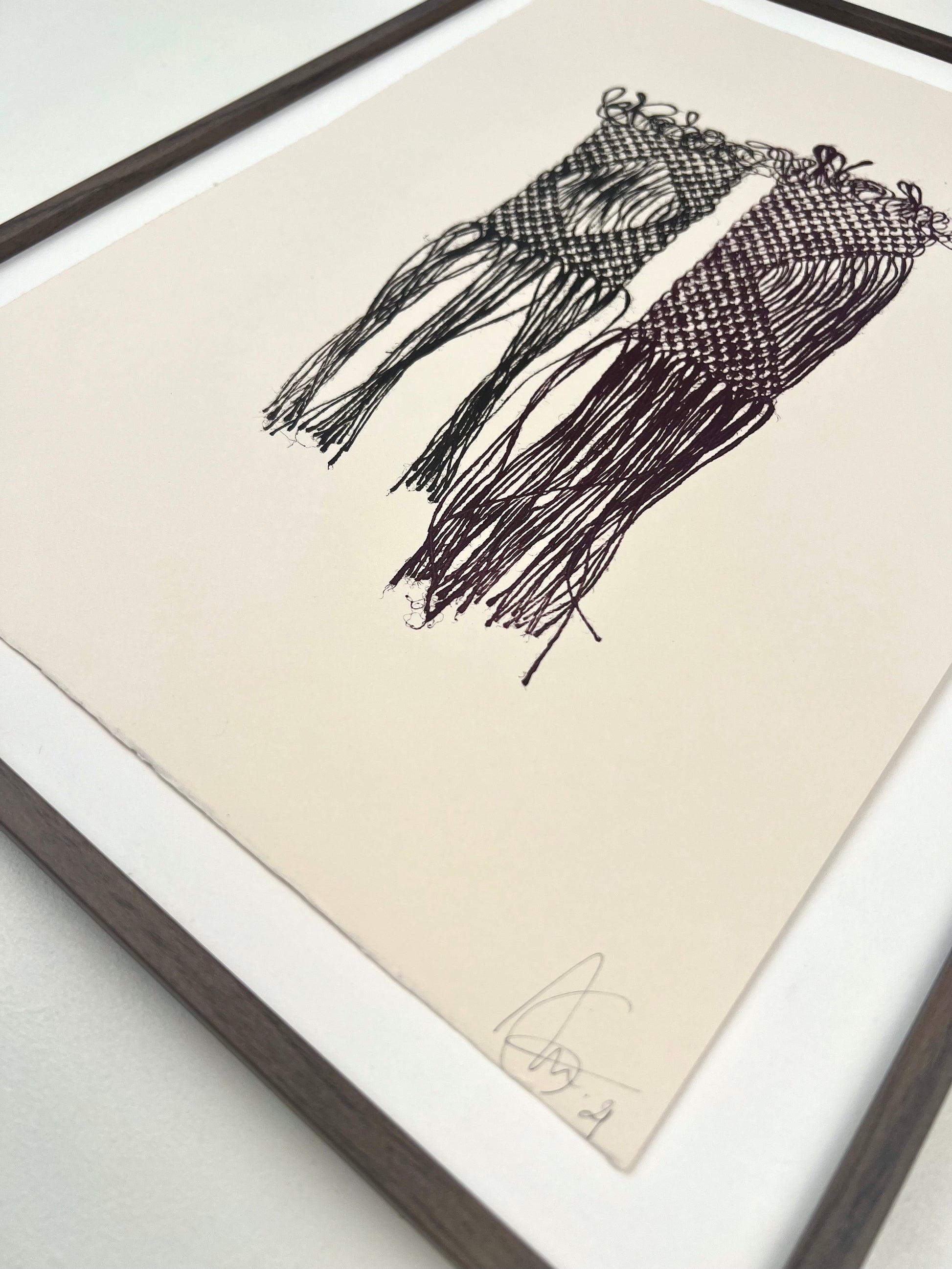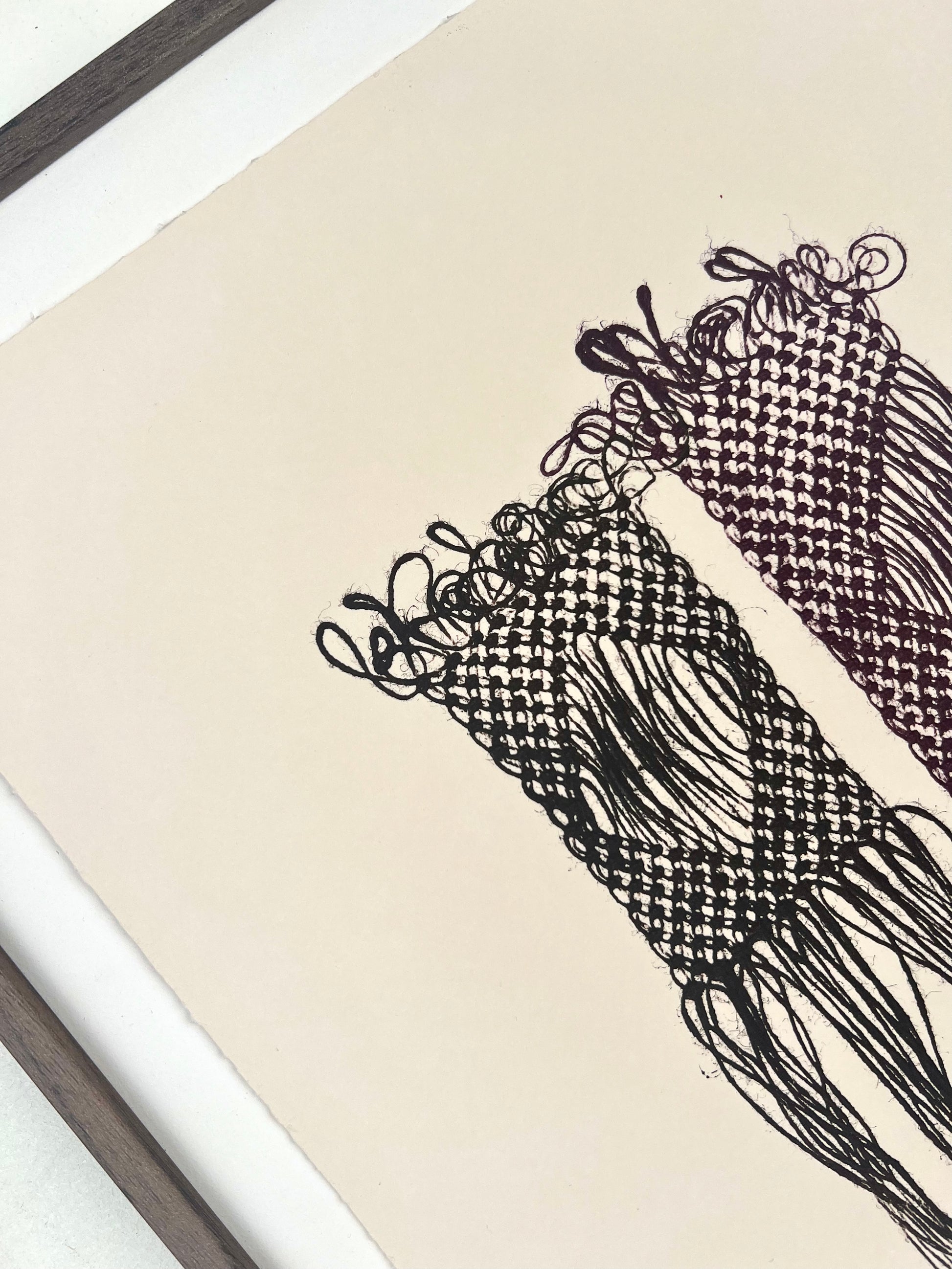 Estampe de trois matrices en fibres de lin nouées enduite de plusieurs encres d’impression et passée sous presse sur un papier Fabriano ivoire de 300g