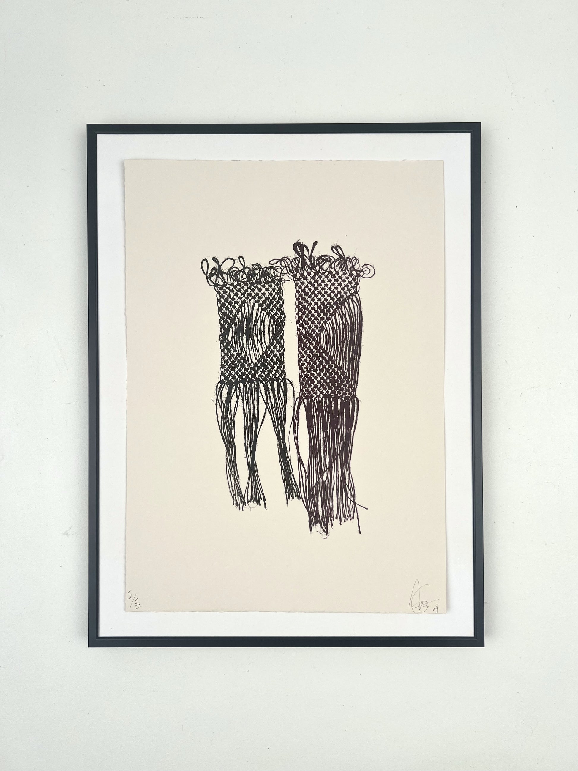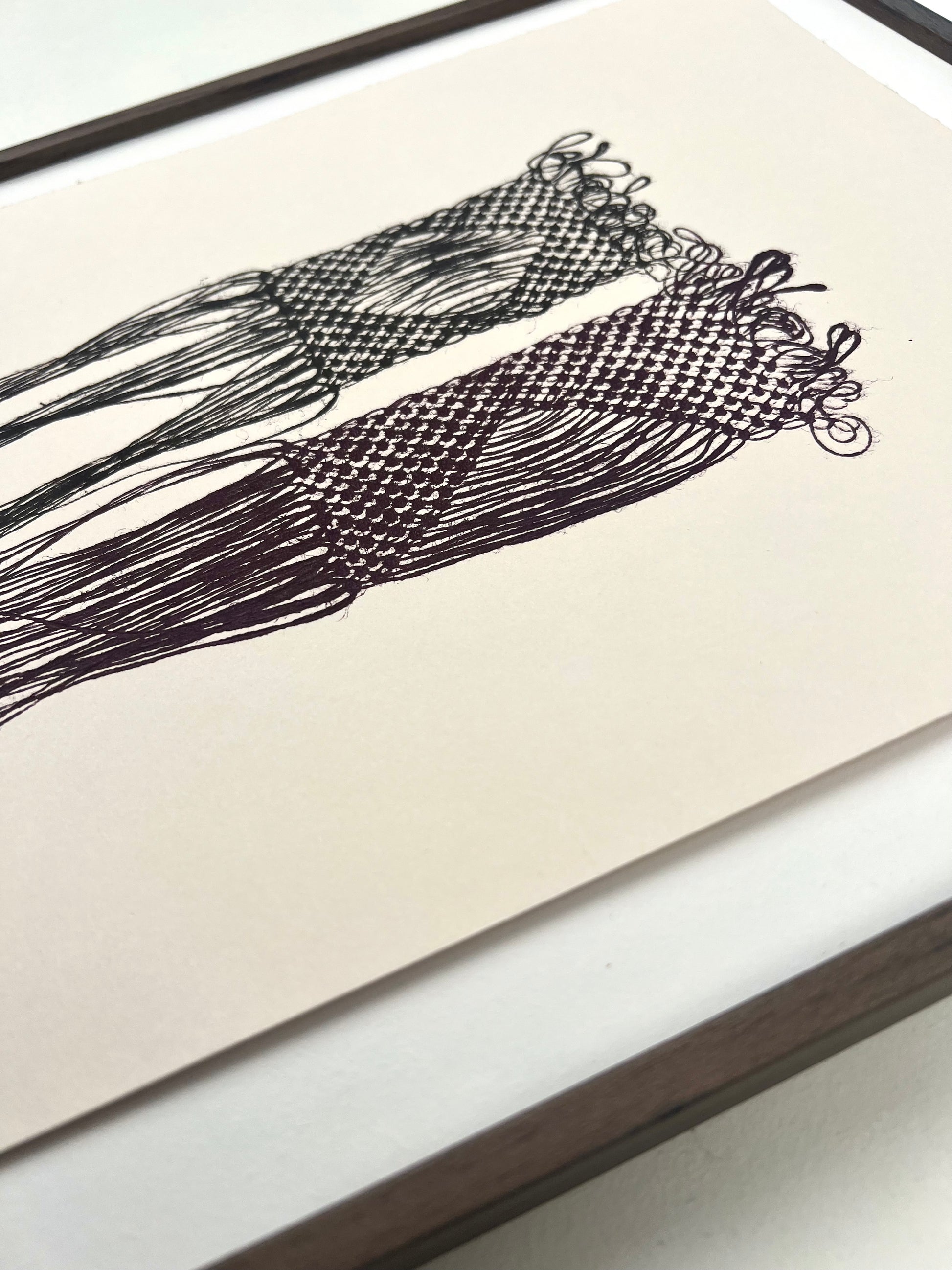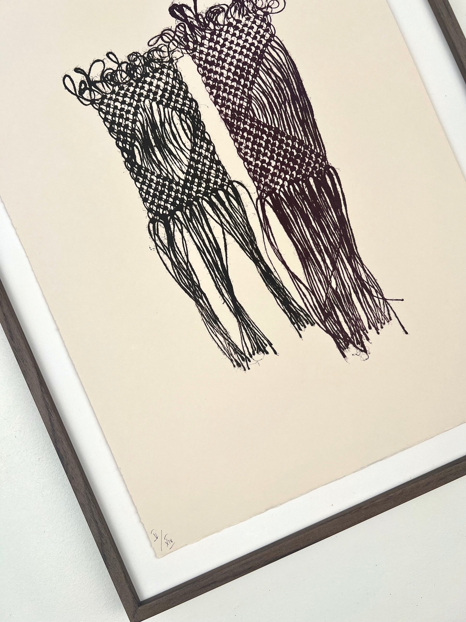 Estampe de trois matrices en fibres de lin nouées enduite de plusieurs encres d’impression et passée sous presse sur un papier Fabriano ivoire de 300g