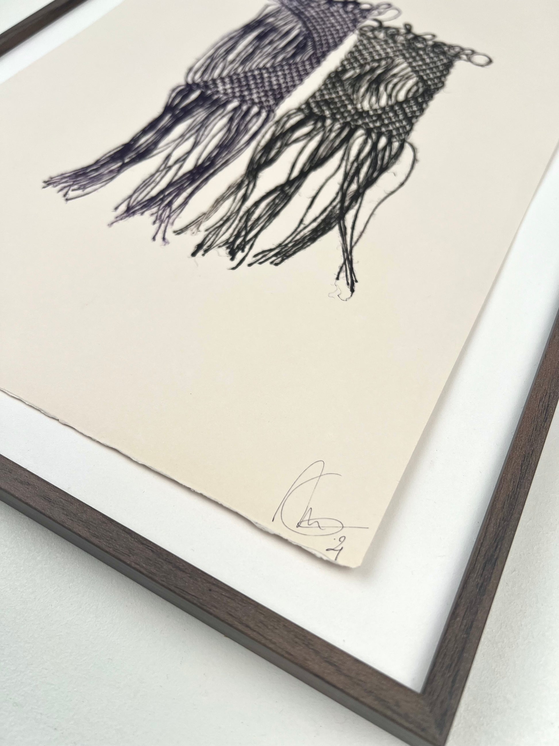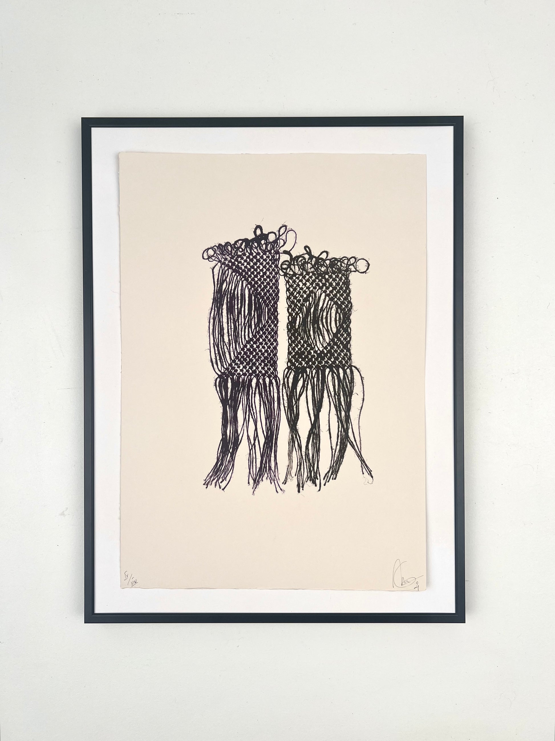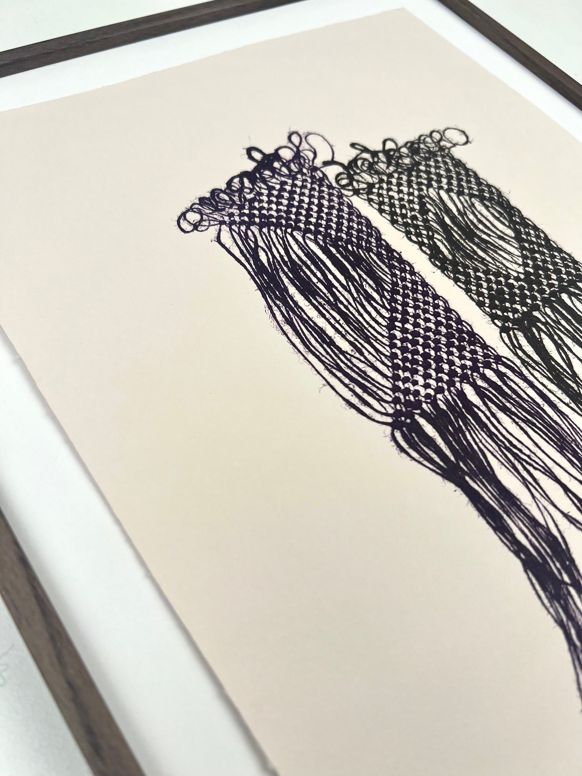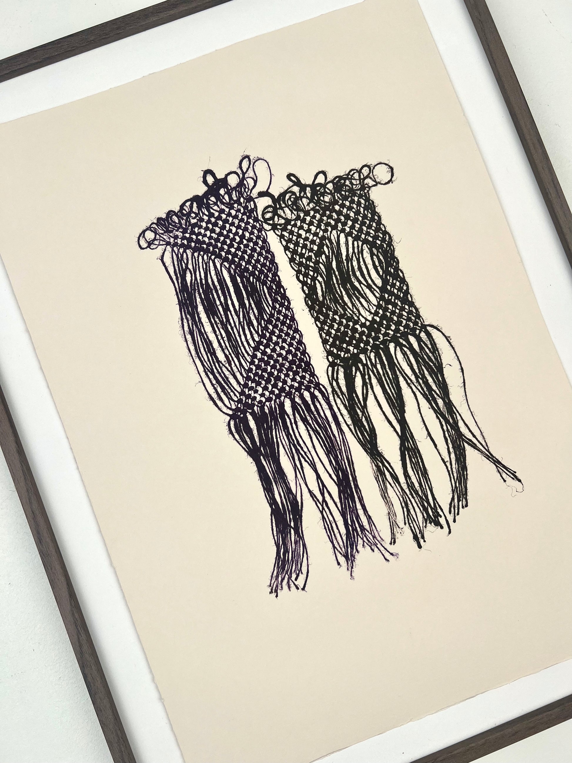 Estampe de trois matrices en fibres de lin nouées enduite de plusieurs encres d’impression et passée sous presse sur un papier Fabriano ivoire de 300g