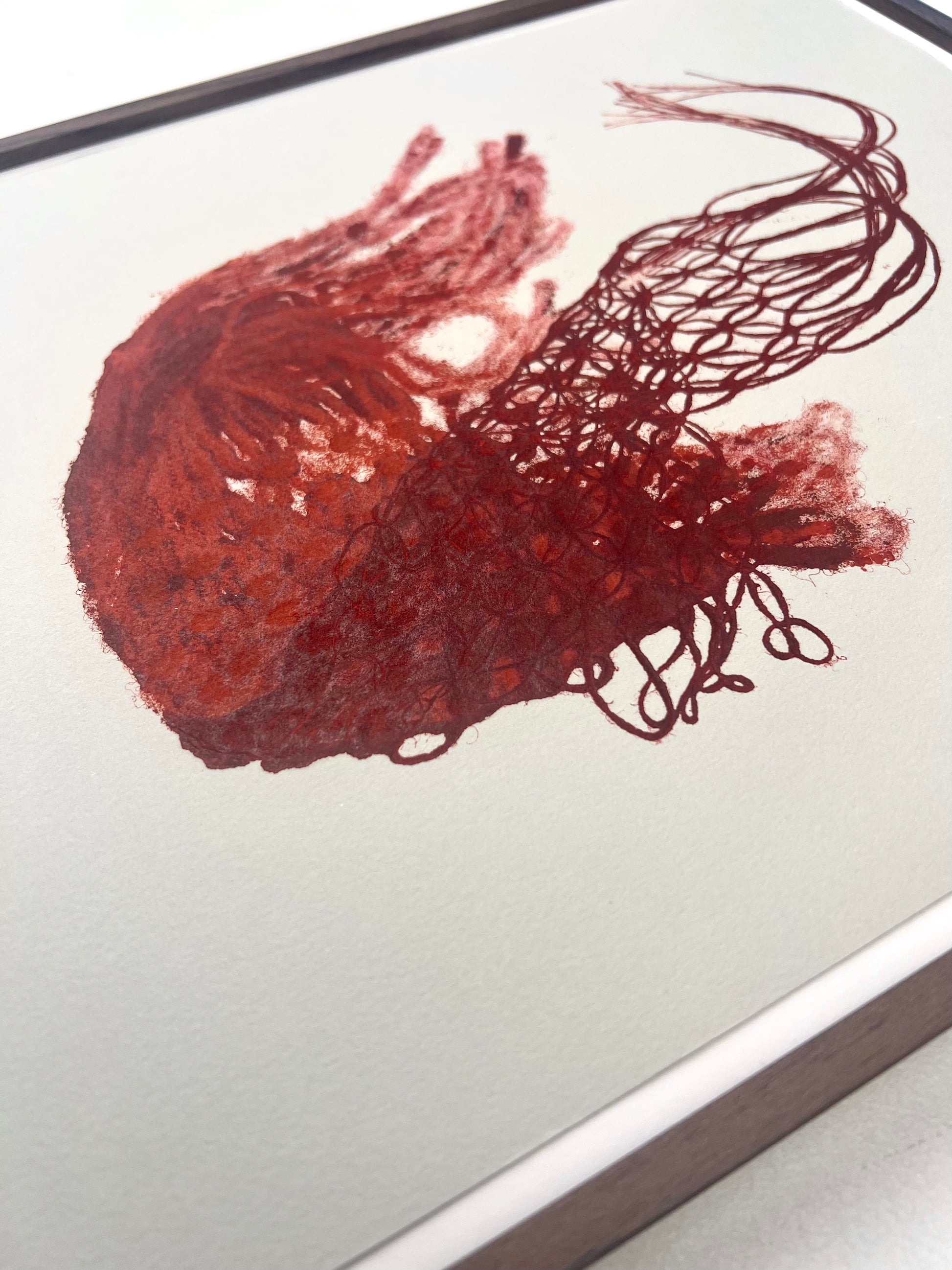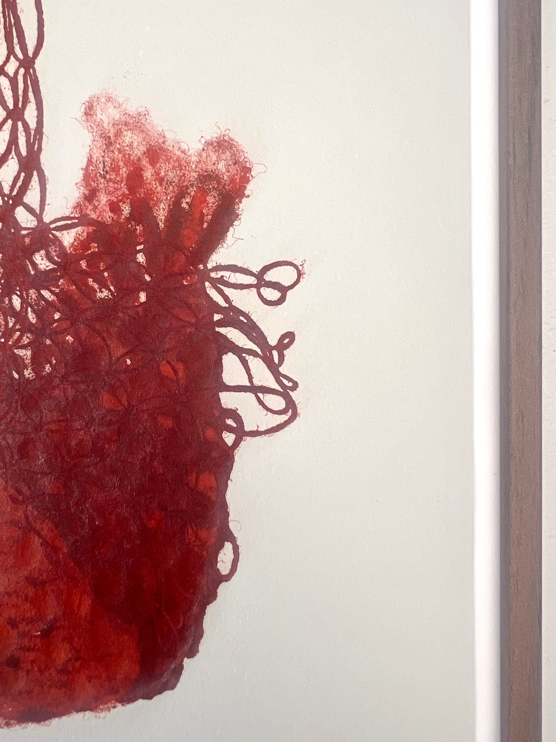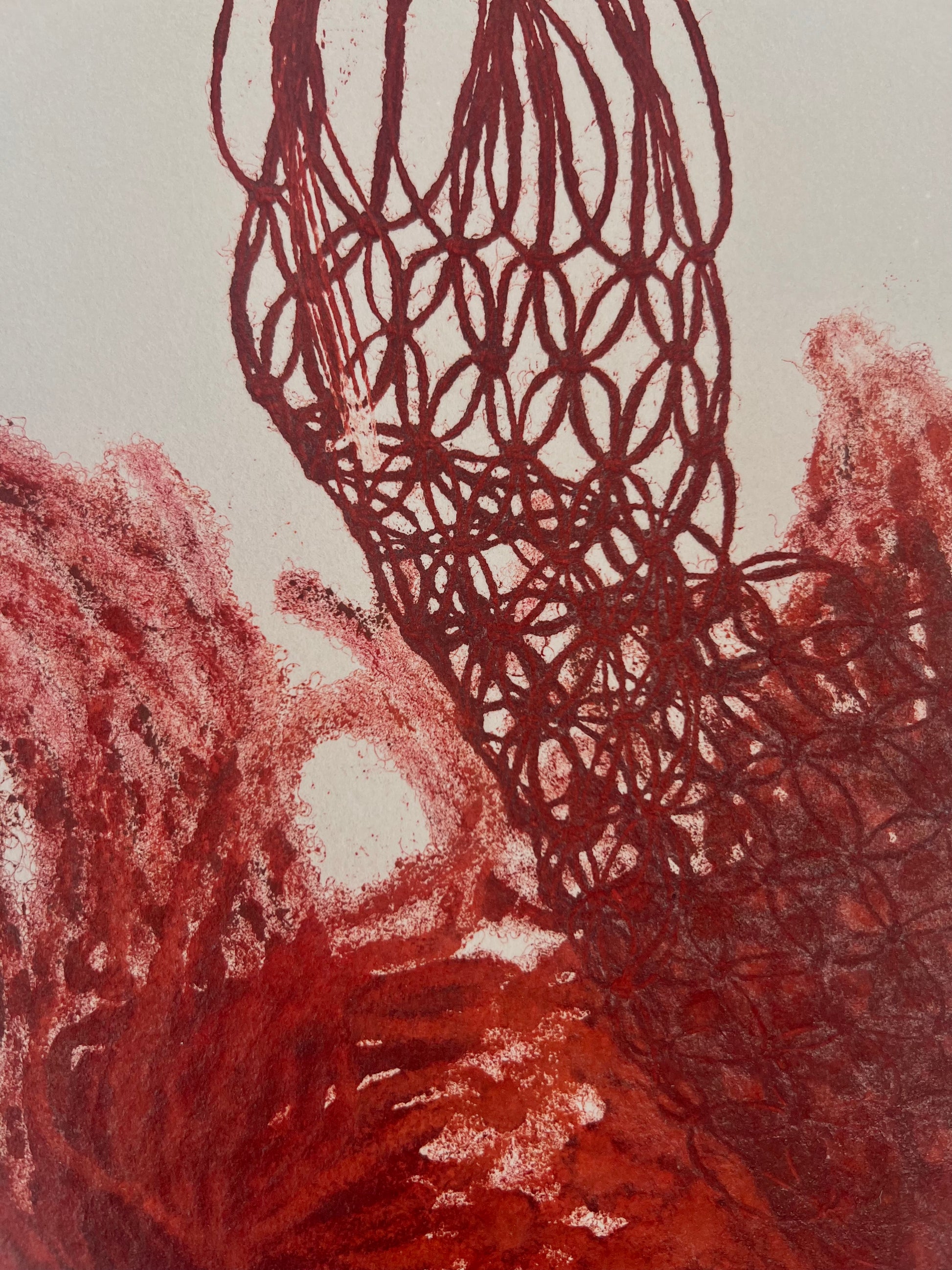 Estampe d'une matrice en fibres de coton et de lin nouées enduite de plusieurs encres d’impression et passée sous presse sur un papier Velin BFK Rives France de 280g