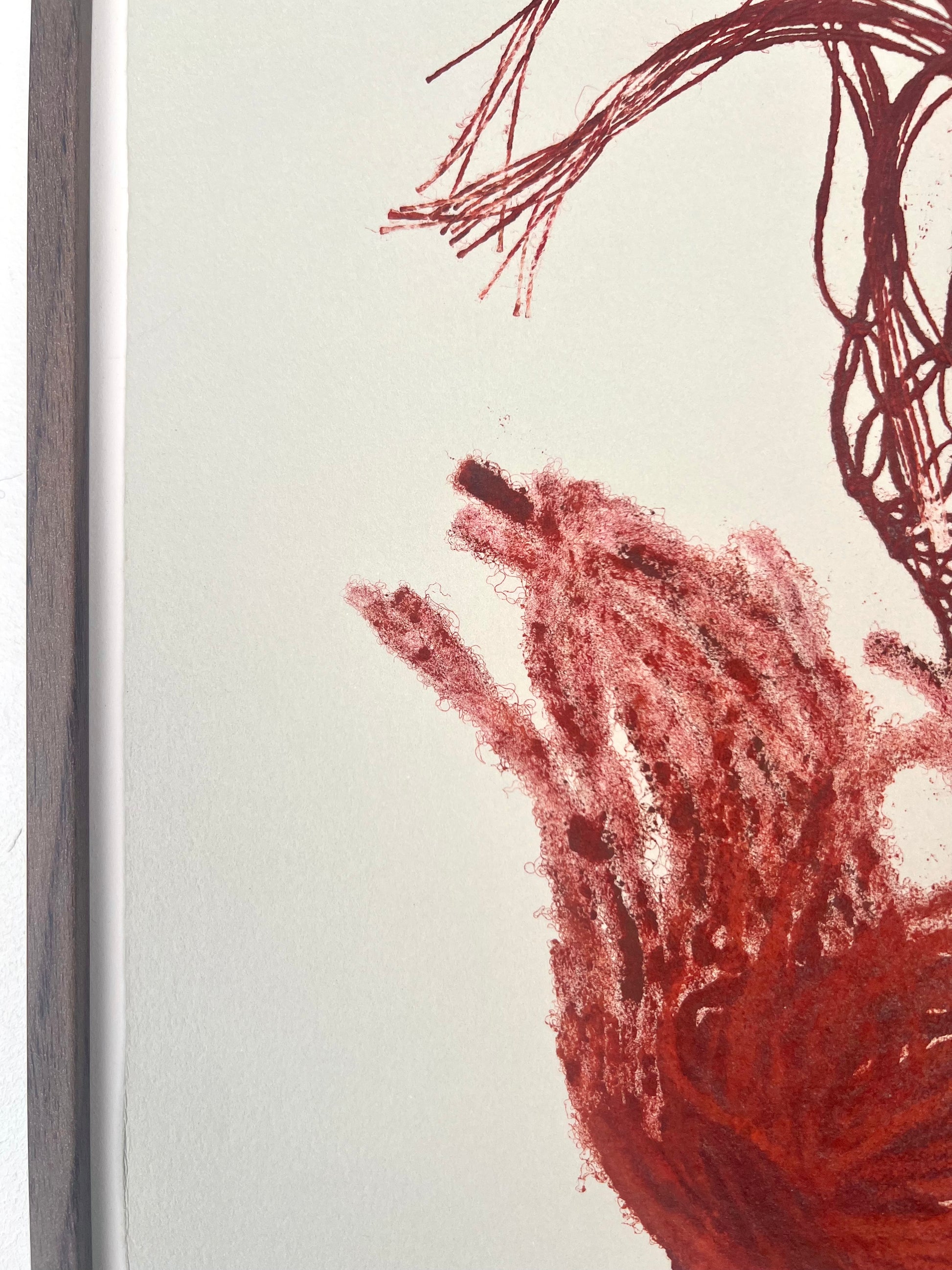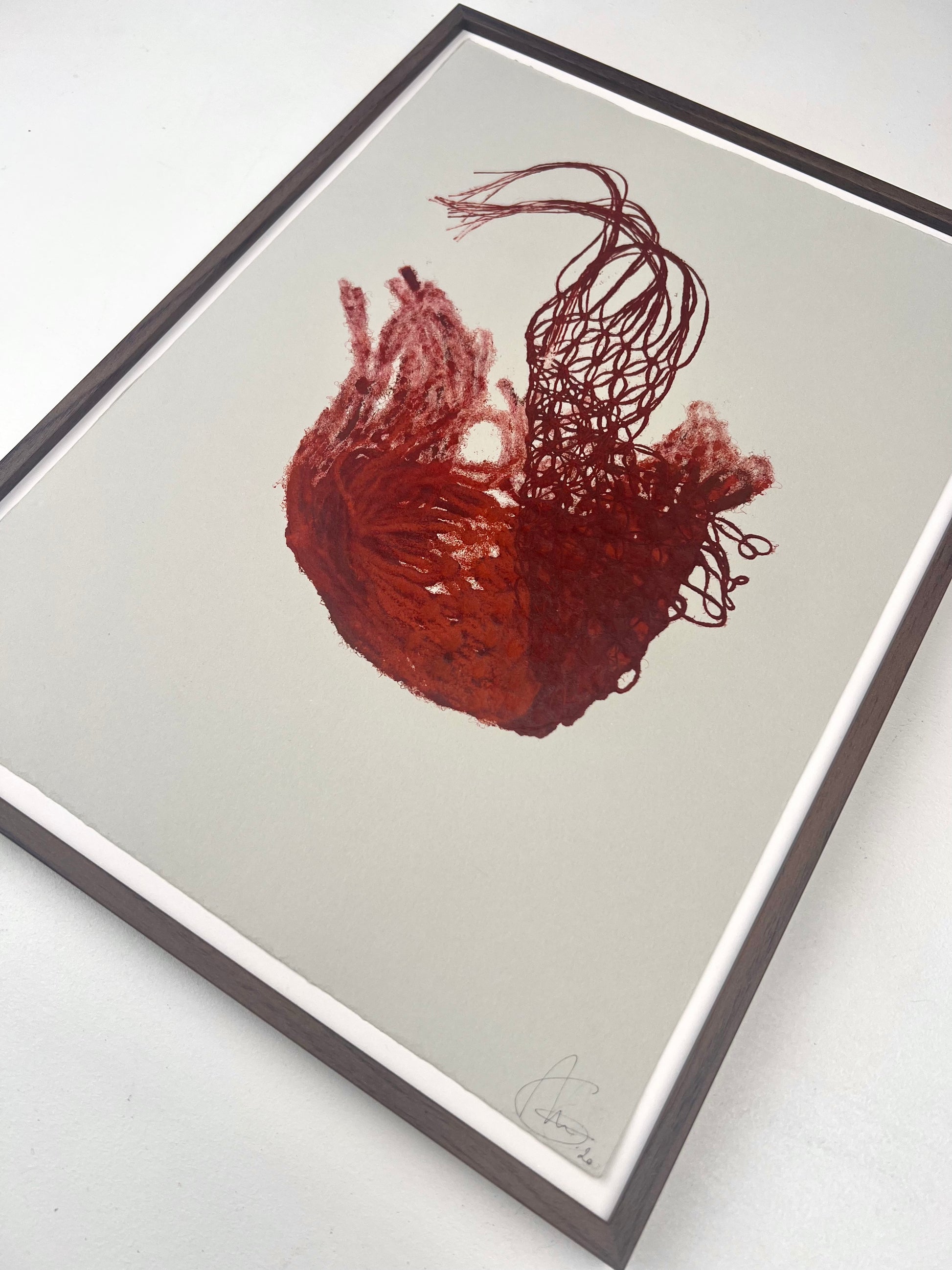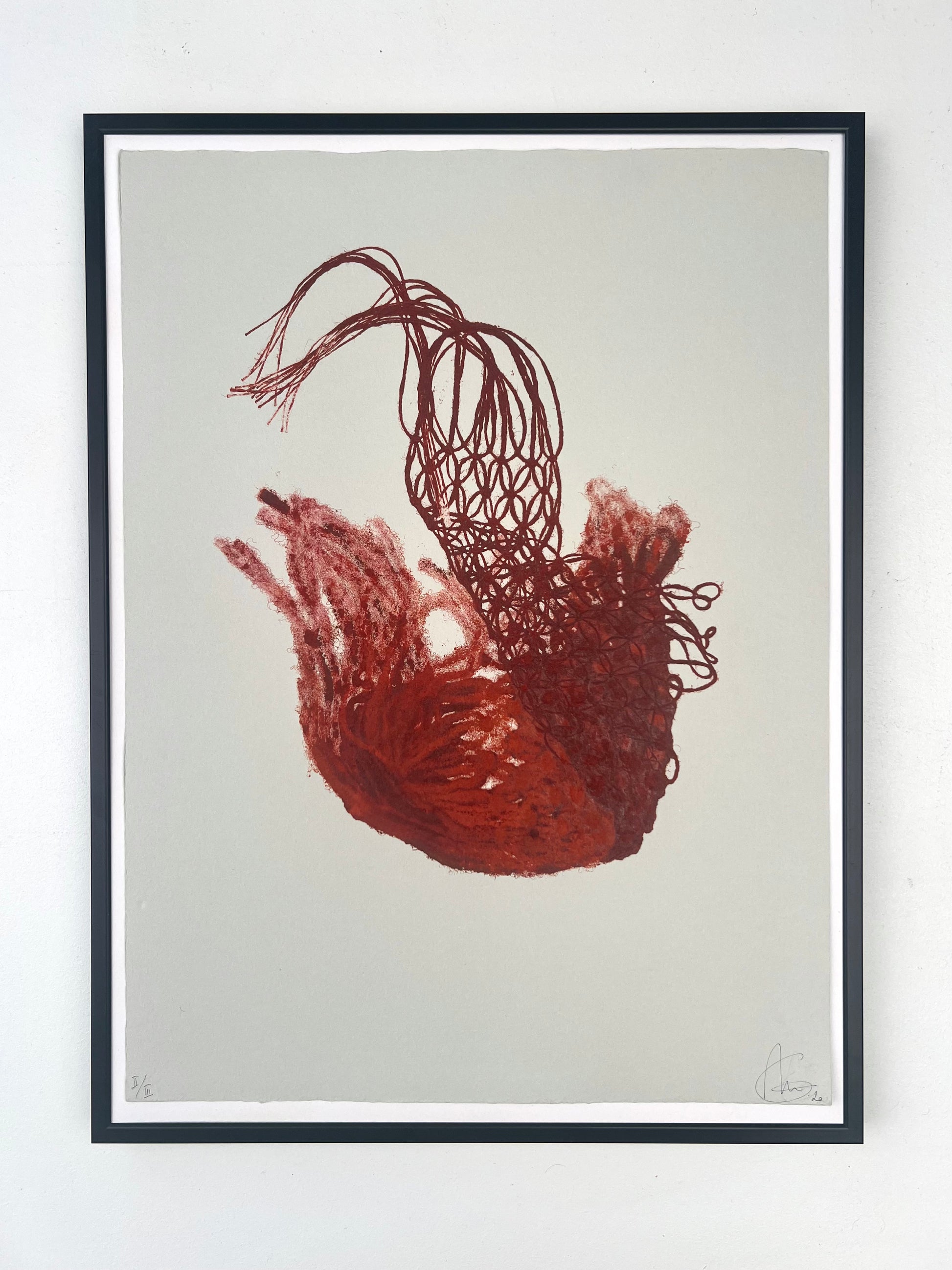 Estampe d'une matrice en fibres de coton et de lin nouées enduite de plusieurs encres d’impression et passée sous presse sur un papier Velin BFK Rives France de 280g