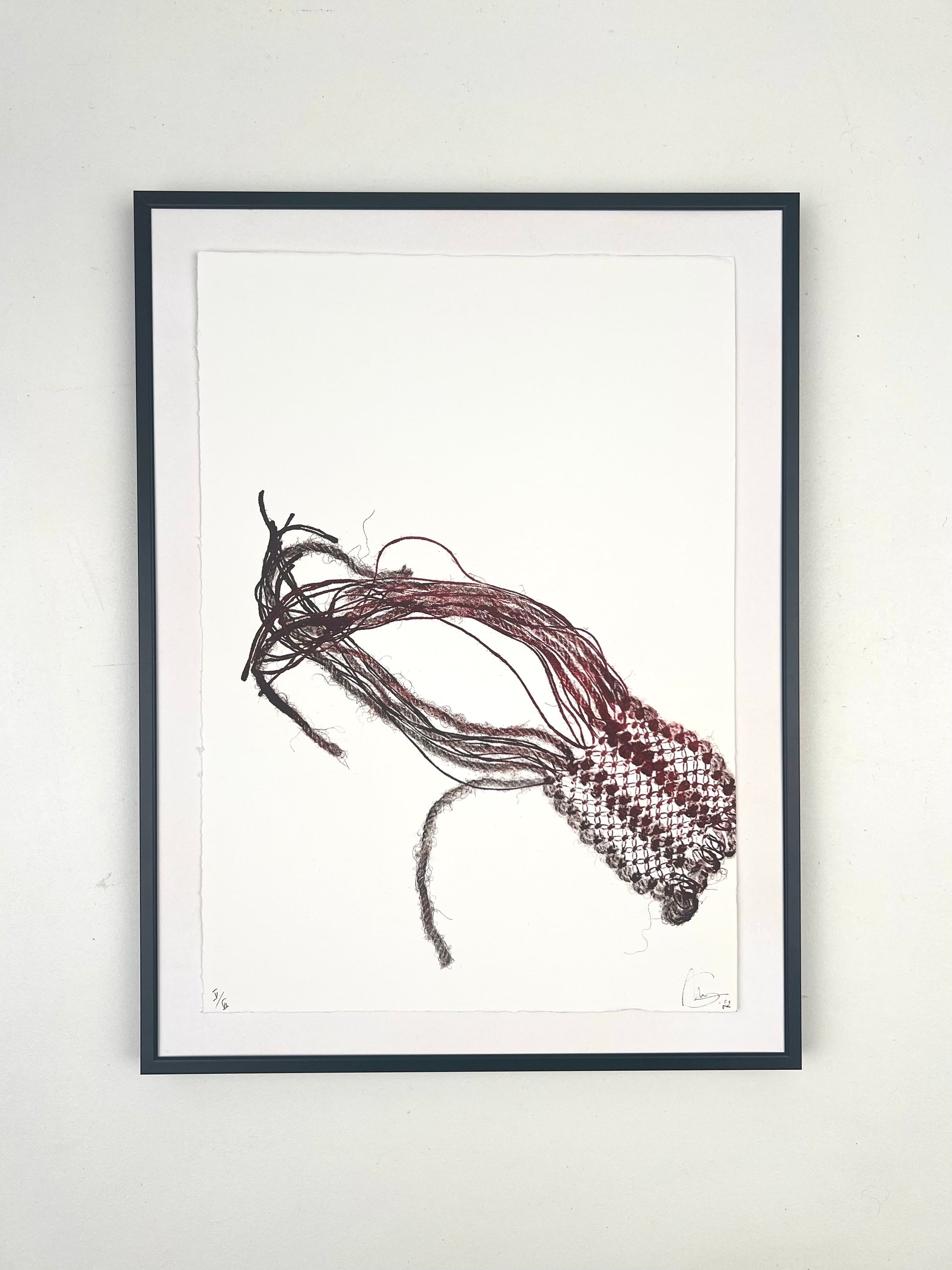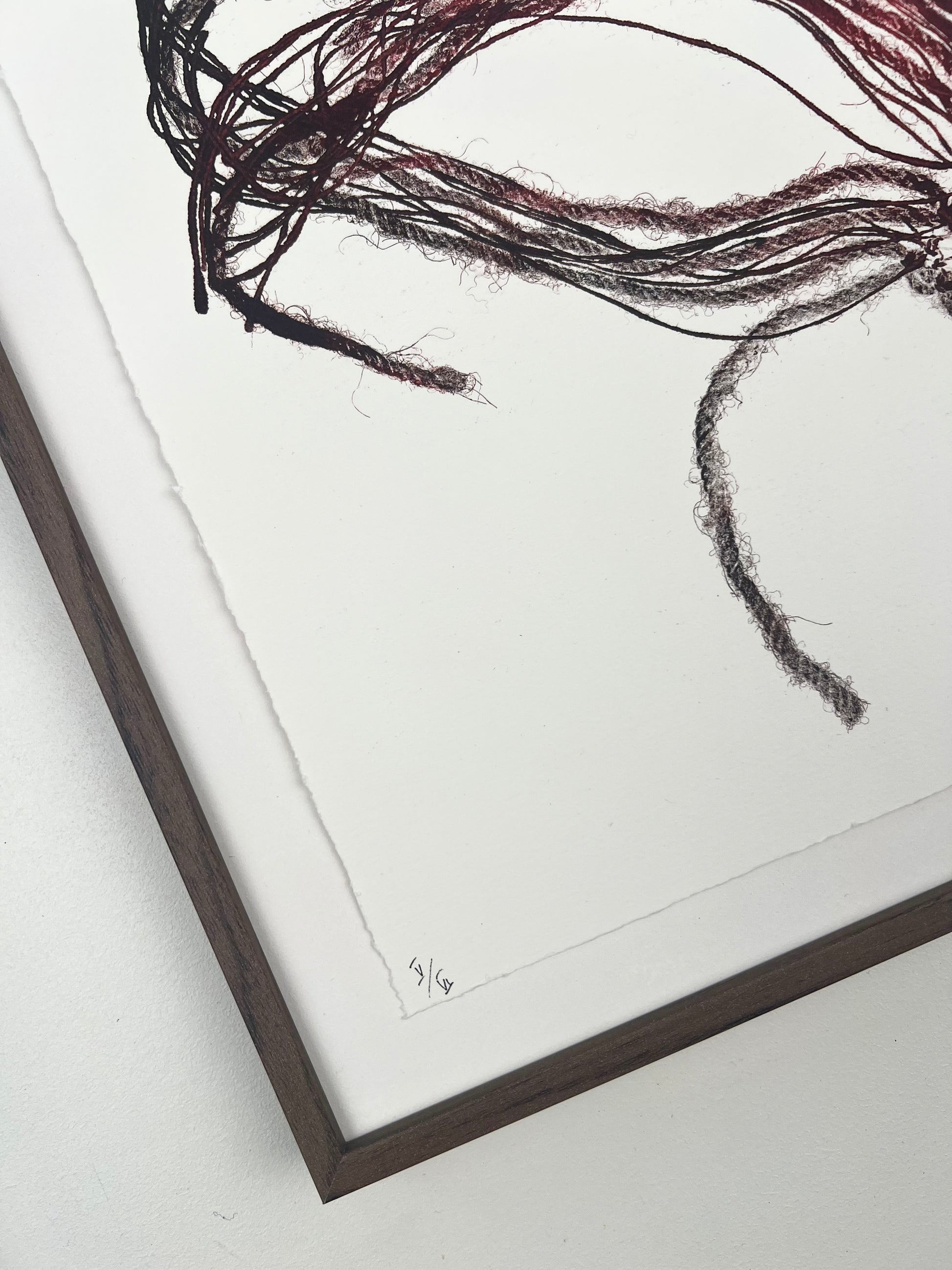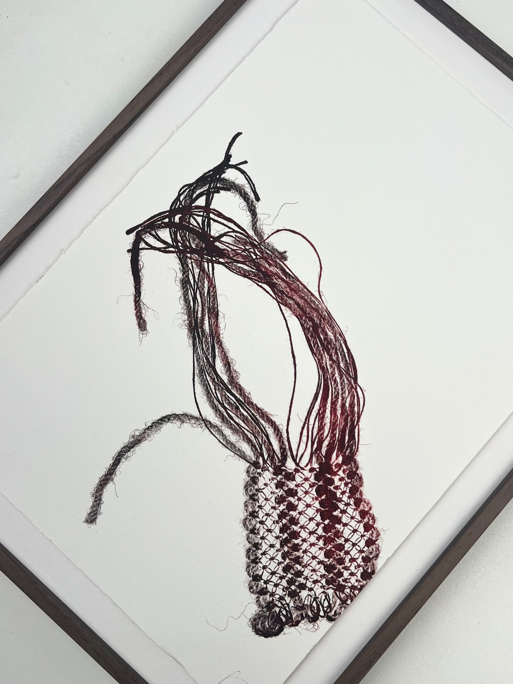 Estampes d'une matrice en fibres de lin nouées enduite de plusieurs encres d’impression et passée sous presse sur un papier Velin d’Arche ivoire de 300g