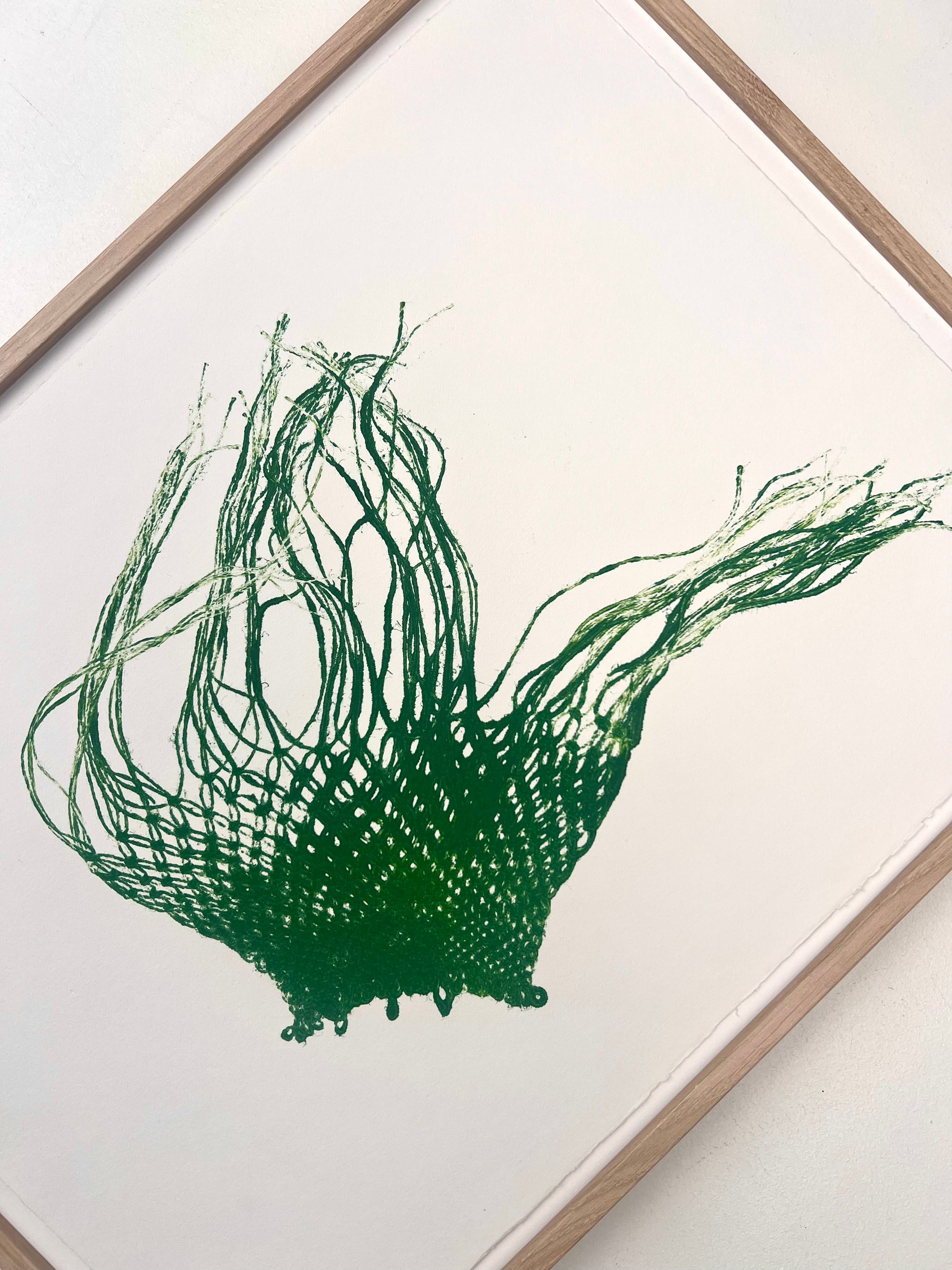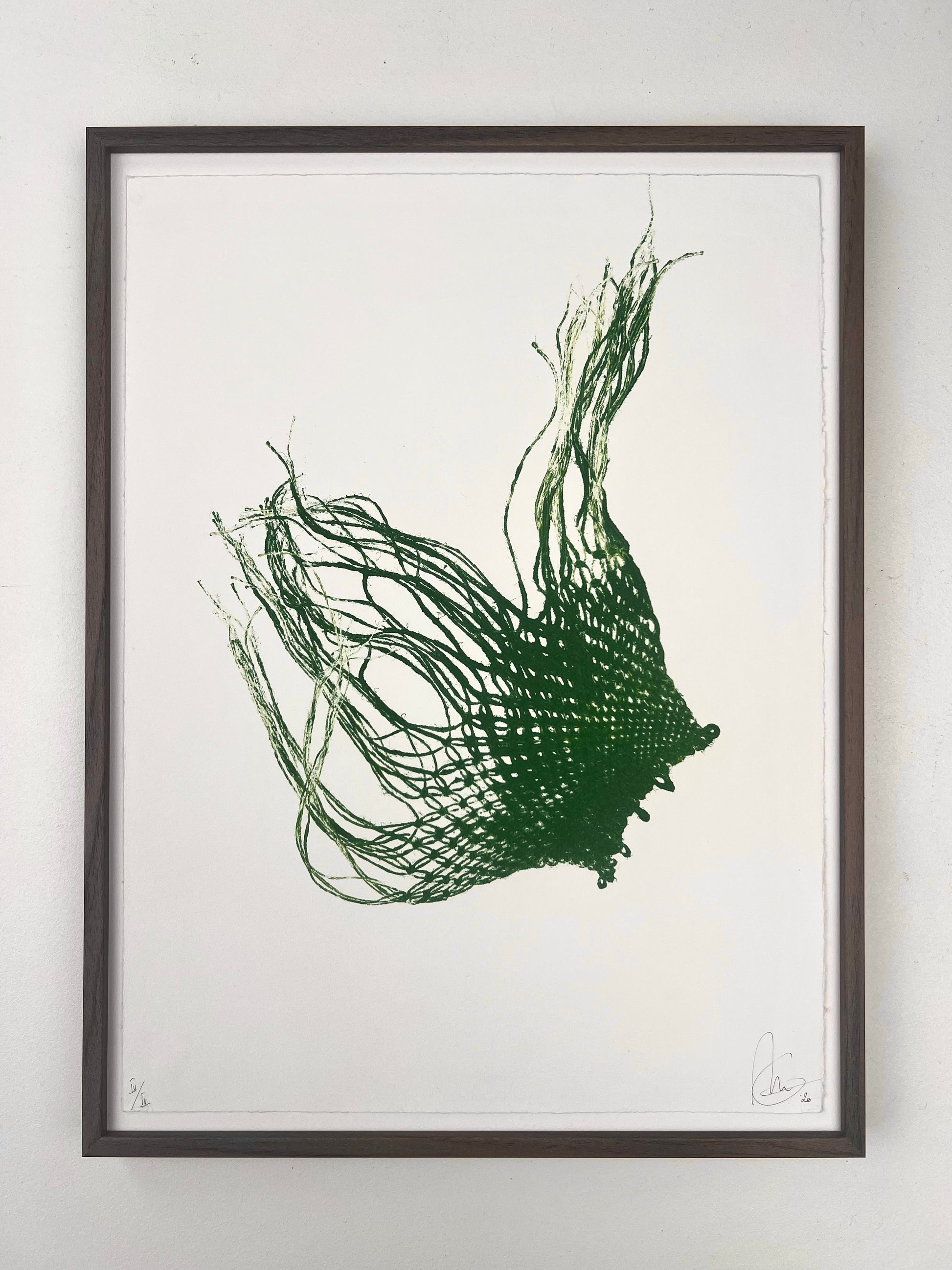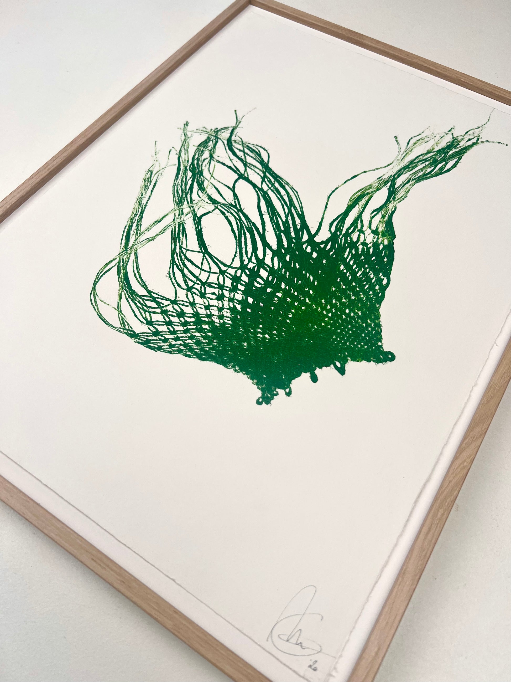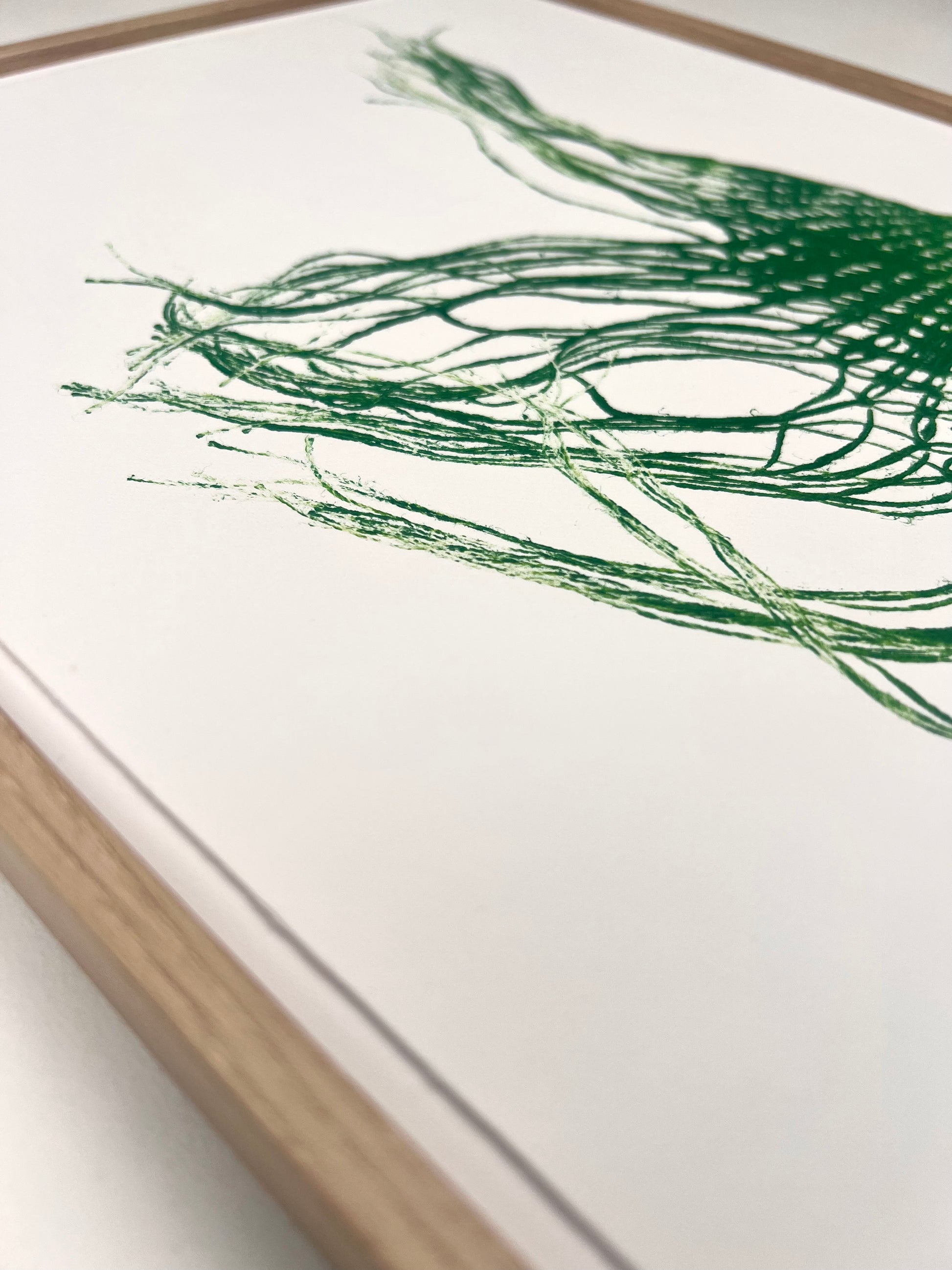 Estampe d'une matrice en fibres de lin nouées enduite de plusieurs encres d’impression et passée sous presse sur un papier Velin d’Arche ivoire de 300g
