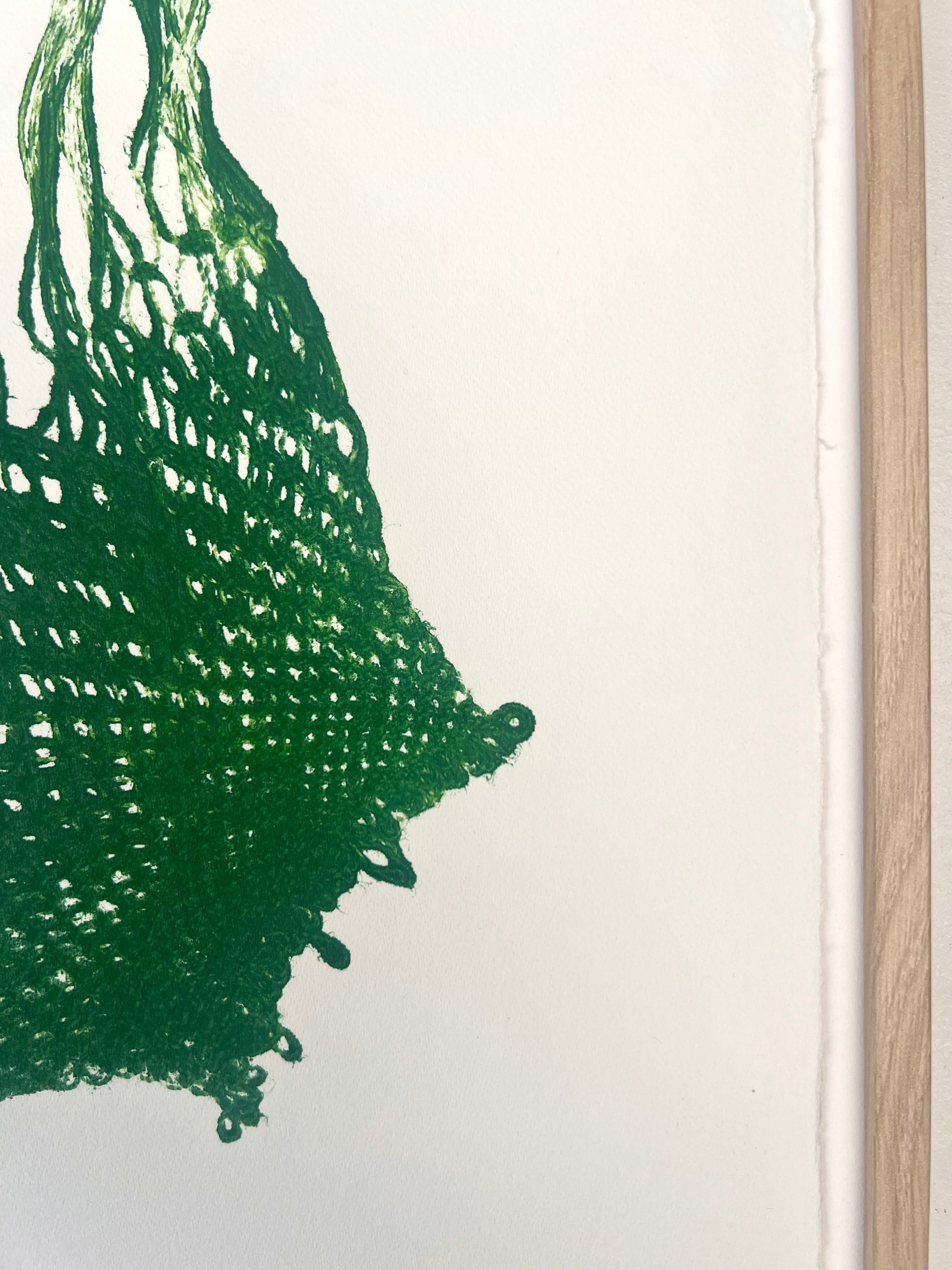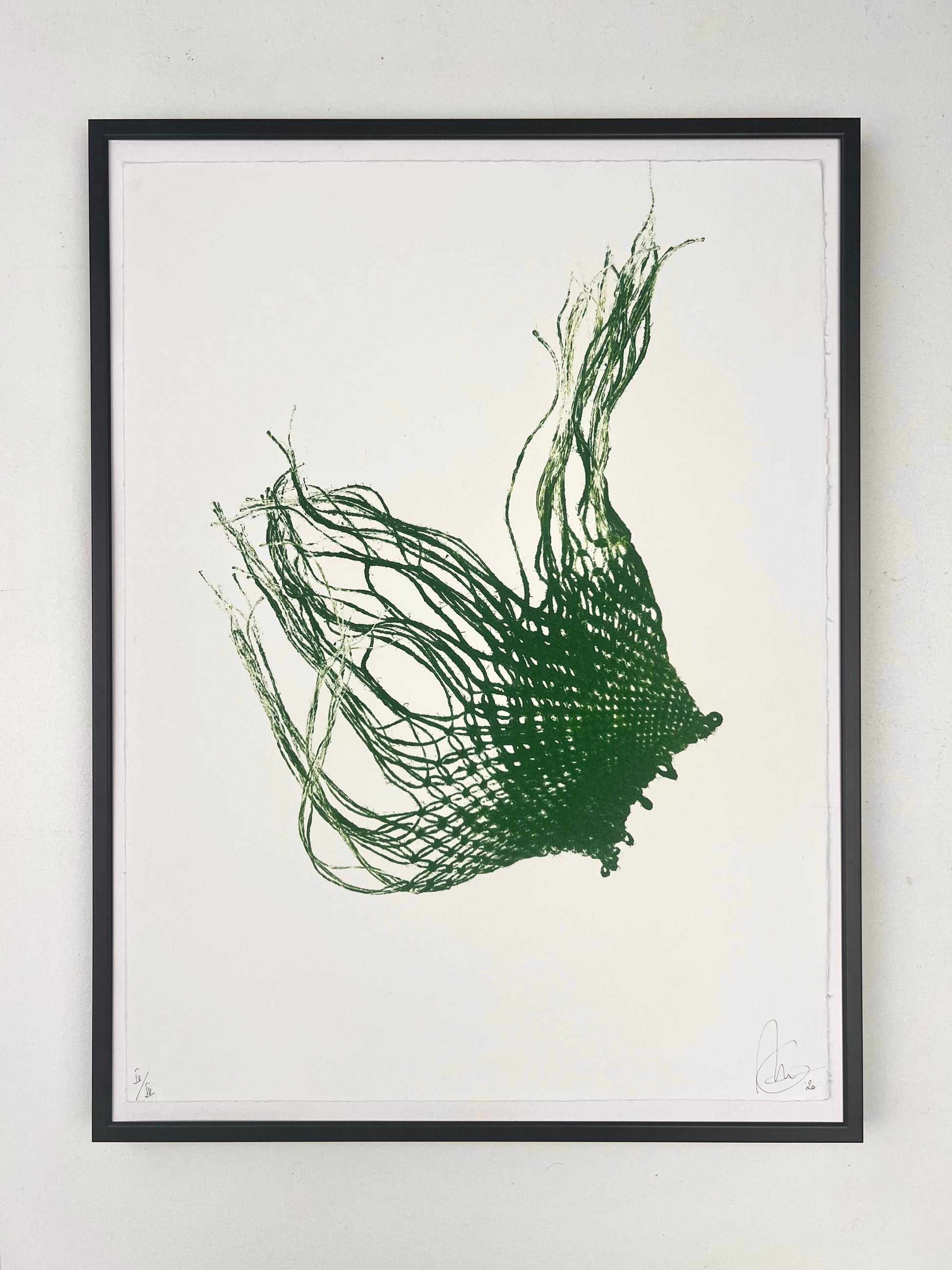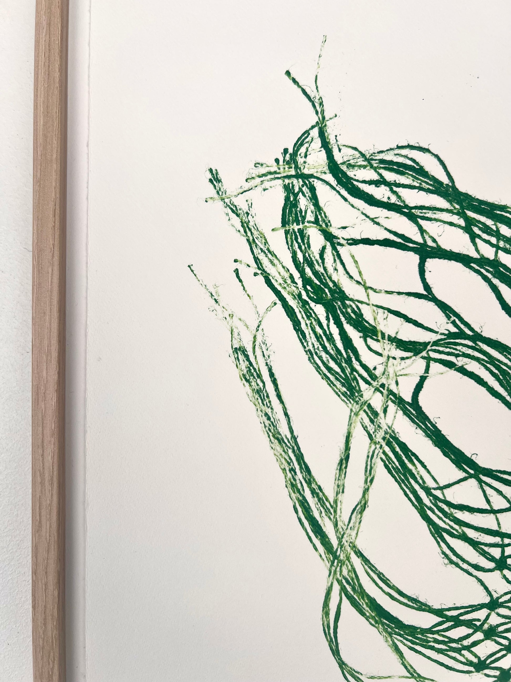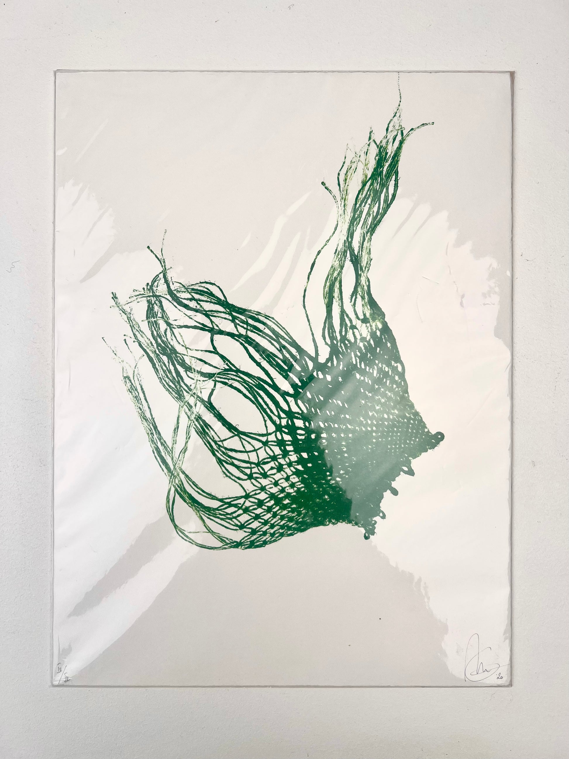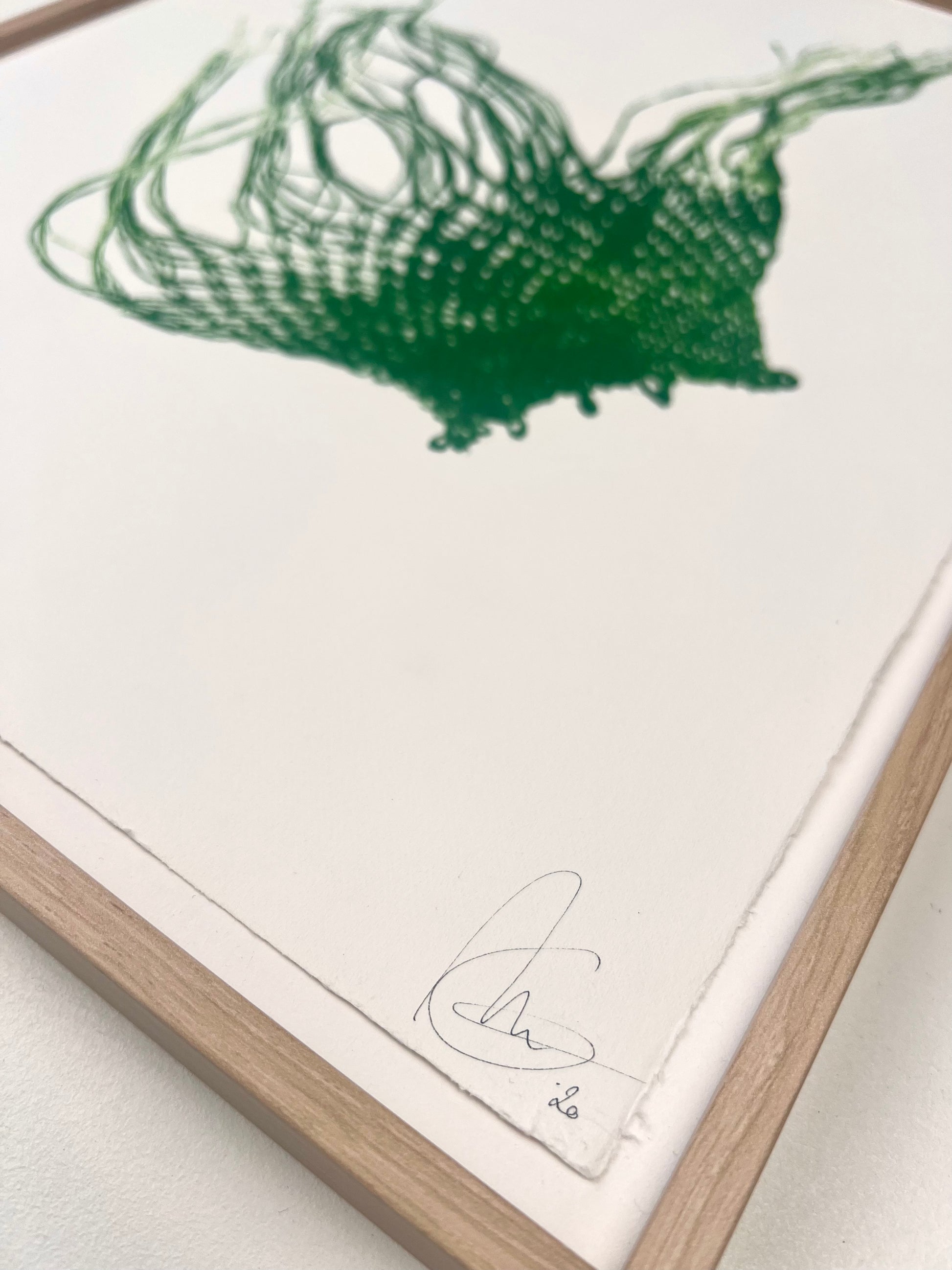 Estampe d'une matrice en fibres de lin nouées enduite de plusieurs encres d’impression et passée sous presse sur un papier Velin d’Arche ivoire de 300g