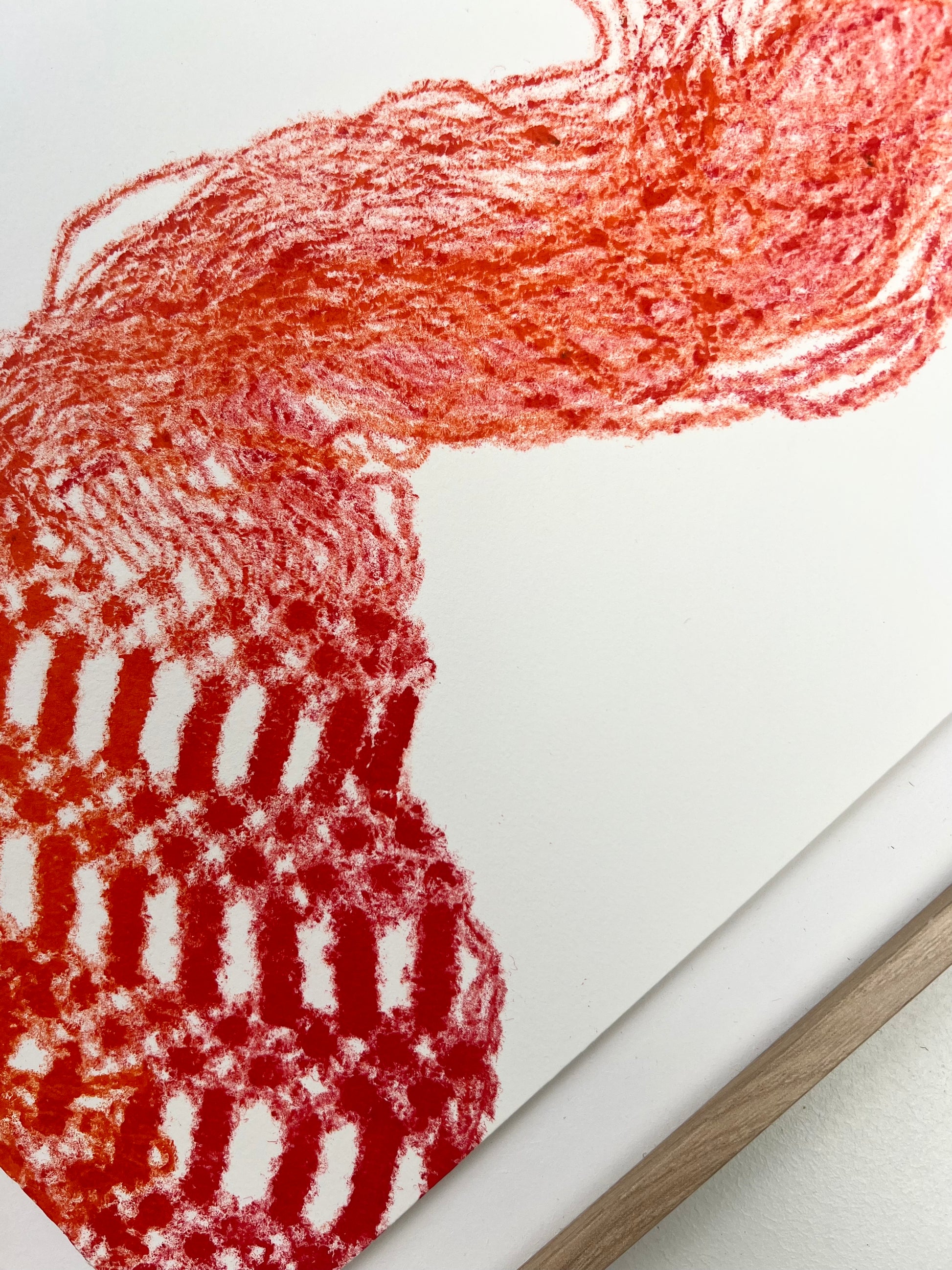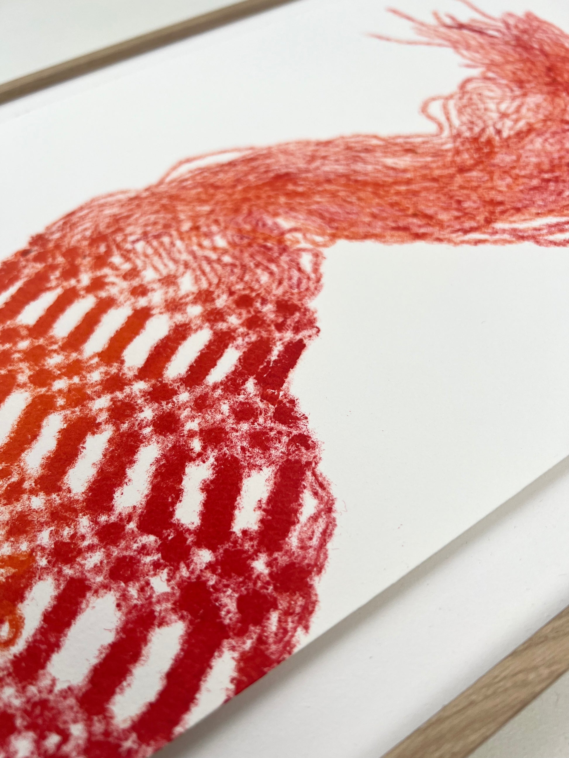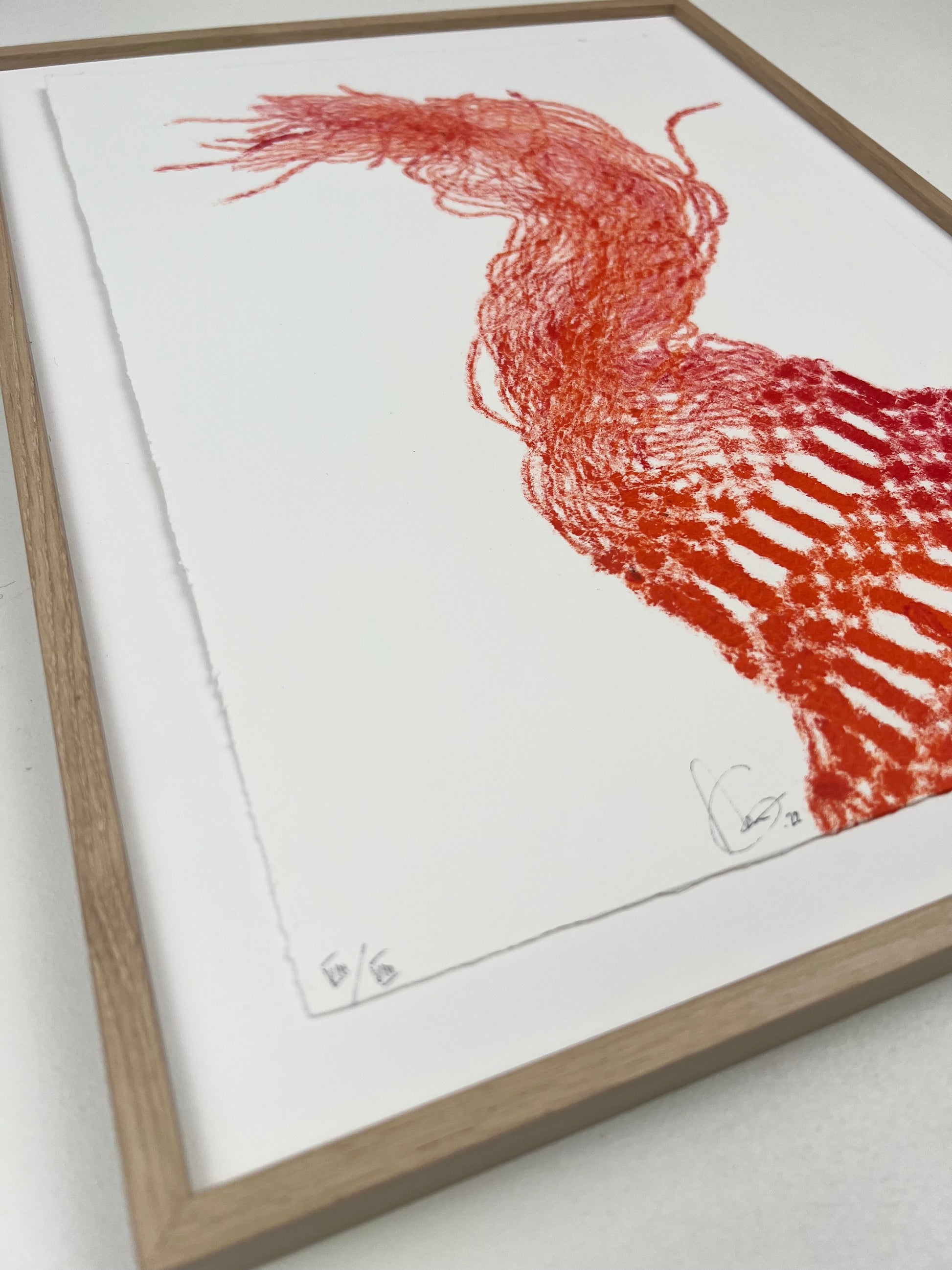 Estampe d'une matrice en fibres de laine nouées enduite de plusieurs encres d’impression et passée sous presse sur un papier Fabriano ivoire de 300g