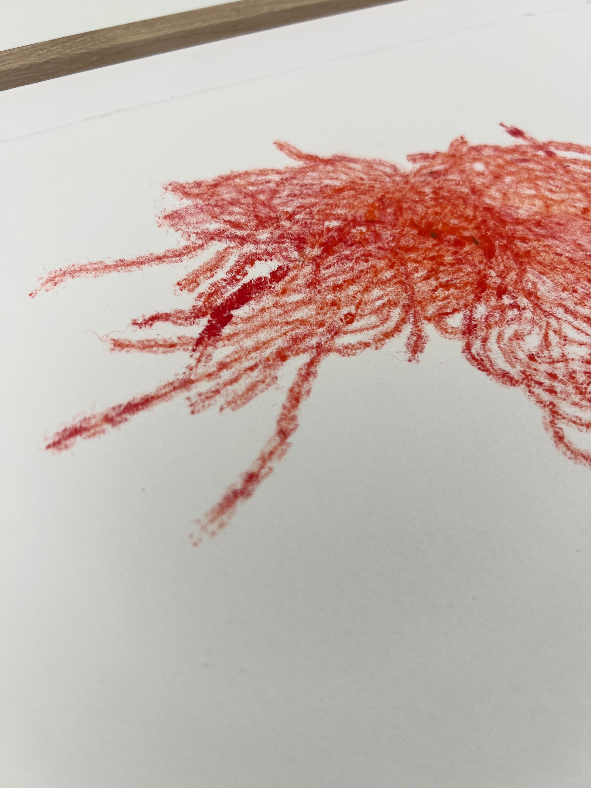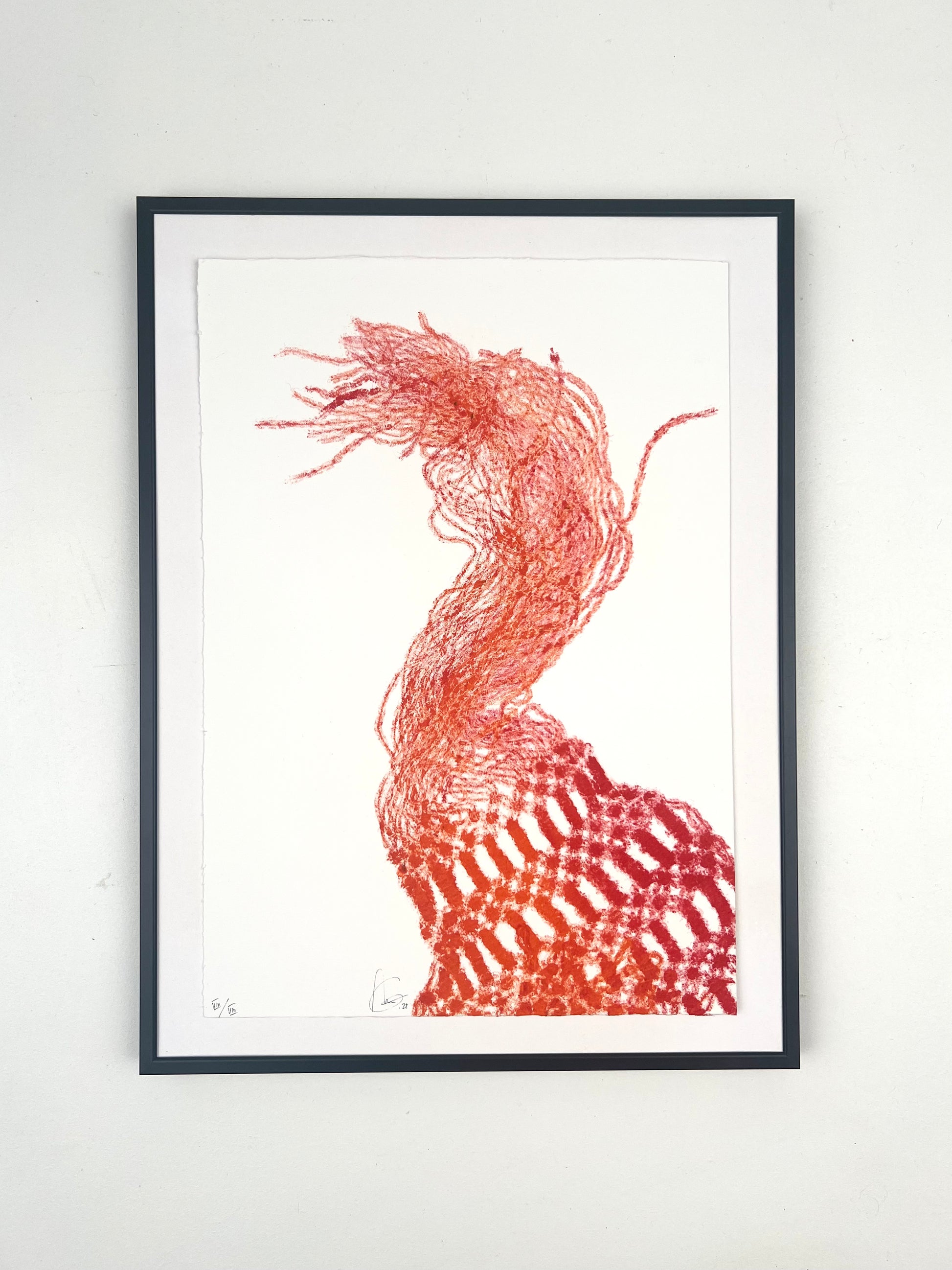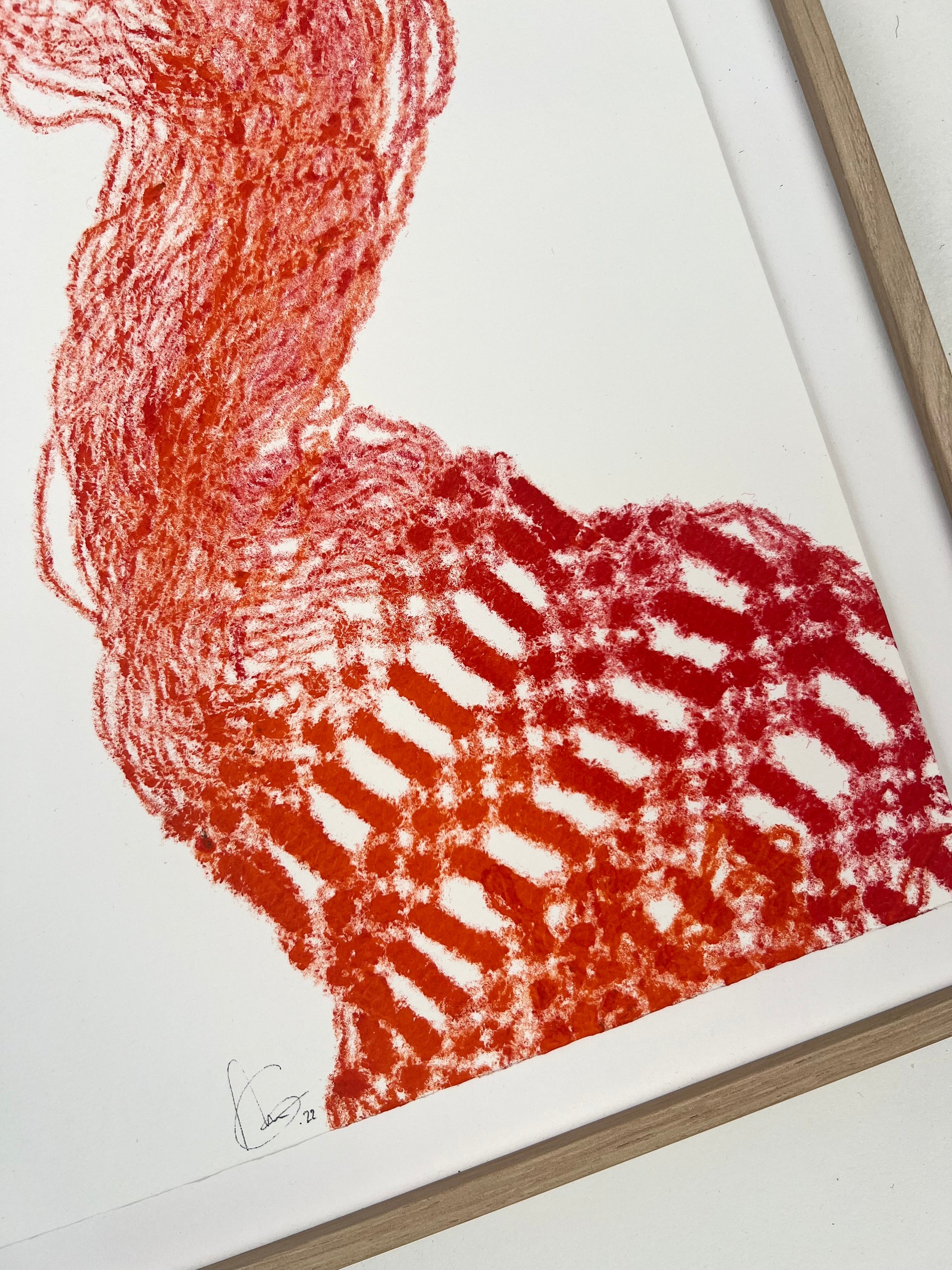Estampe d'une matrice en fibres de laine nouées enduite de plusieurs encres d’impression et passée sous presse sur un papier Fabriano ivoire de 300g