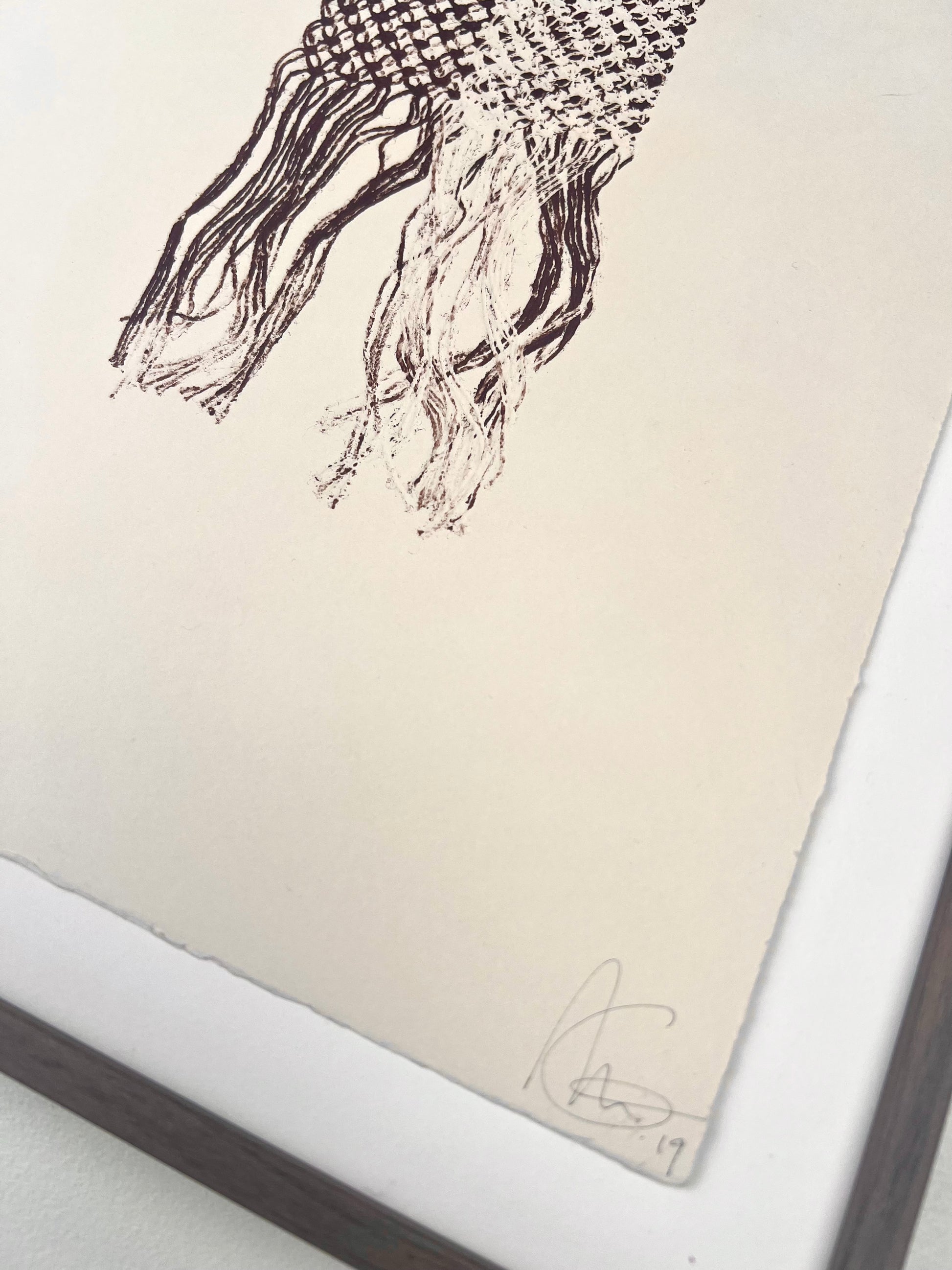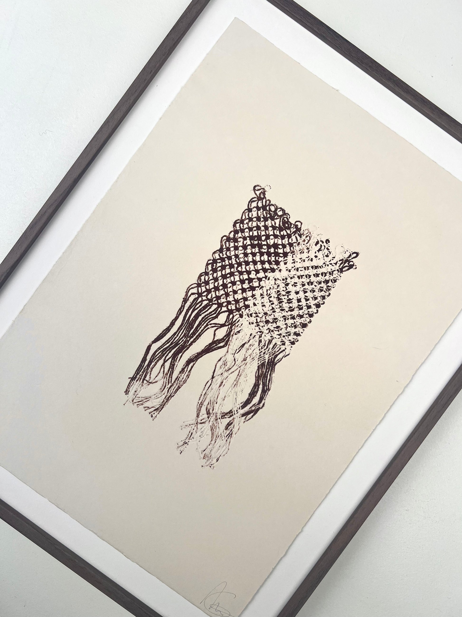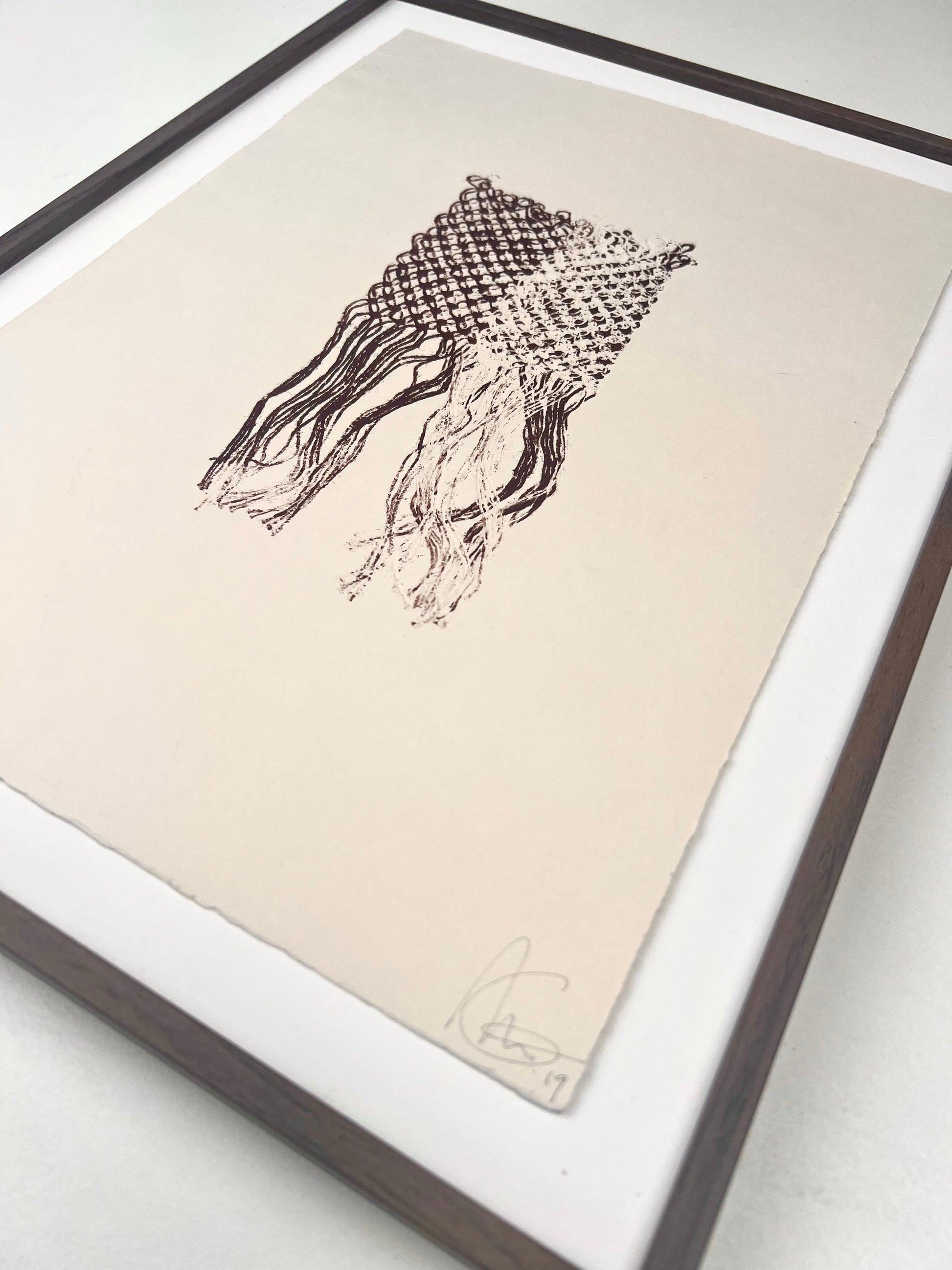 Estampe d'une matrice en fibres de lin nouées enduite d’encre d’impression et passée sous presse sur un papier Fabriano Rosaspina de 250g.