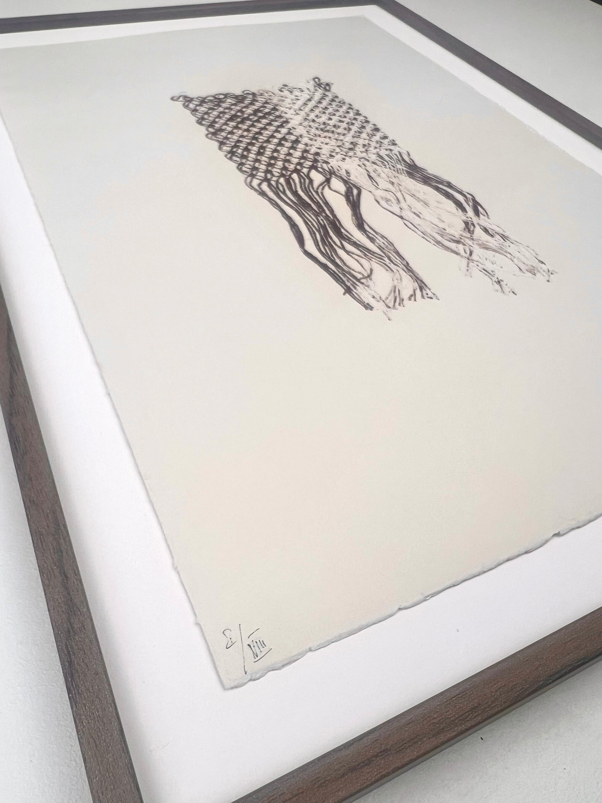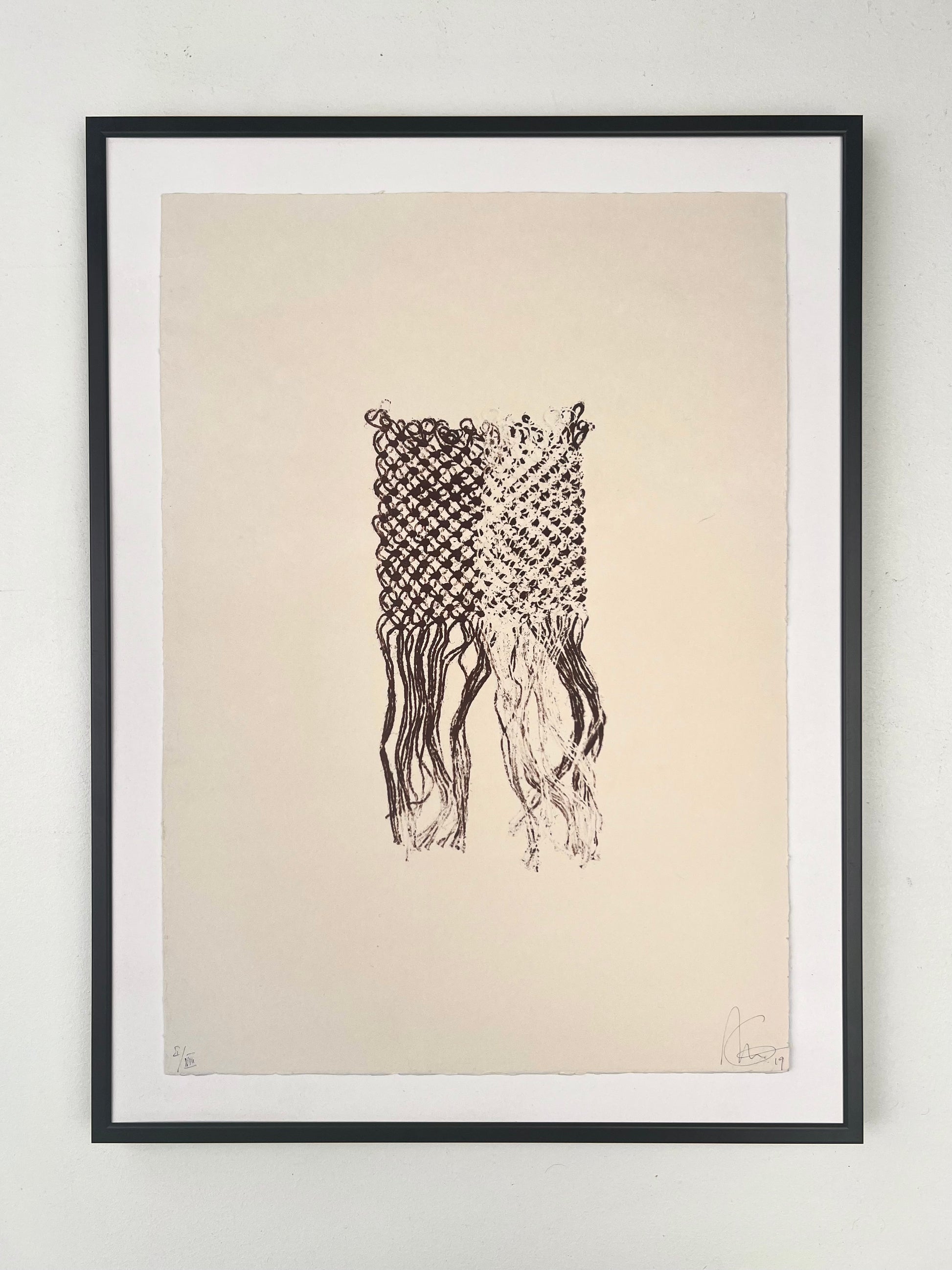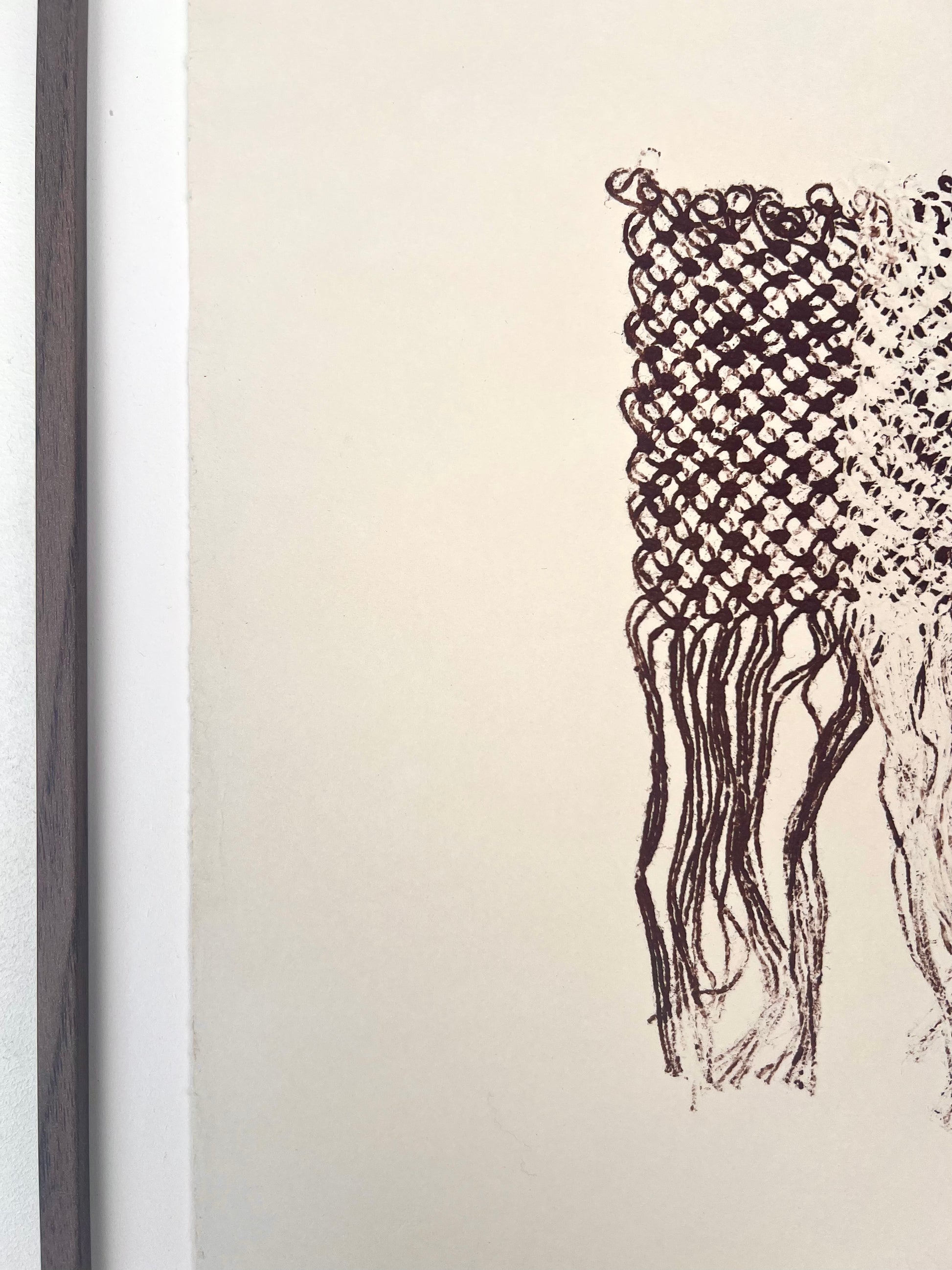 Estampe d'une matrice en fibres de lin nouées enduite d’encre d’impression et passée sous presse sur un papier Fabriano Rosaspina de 250g.