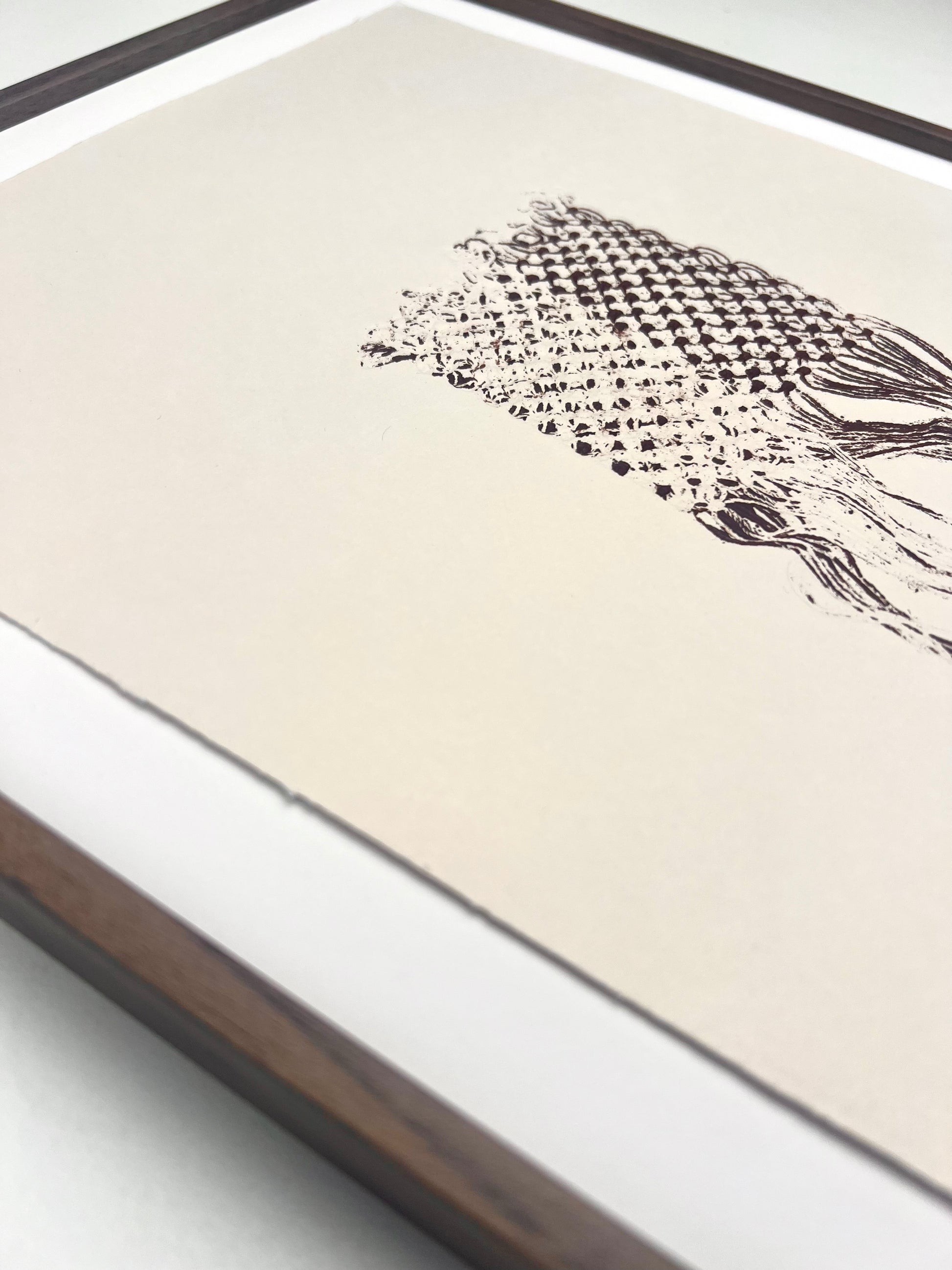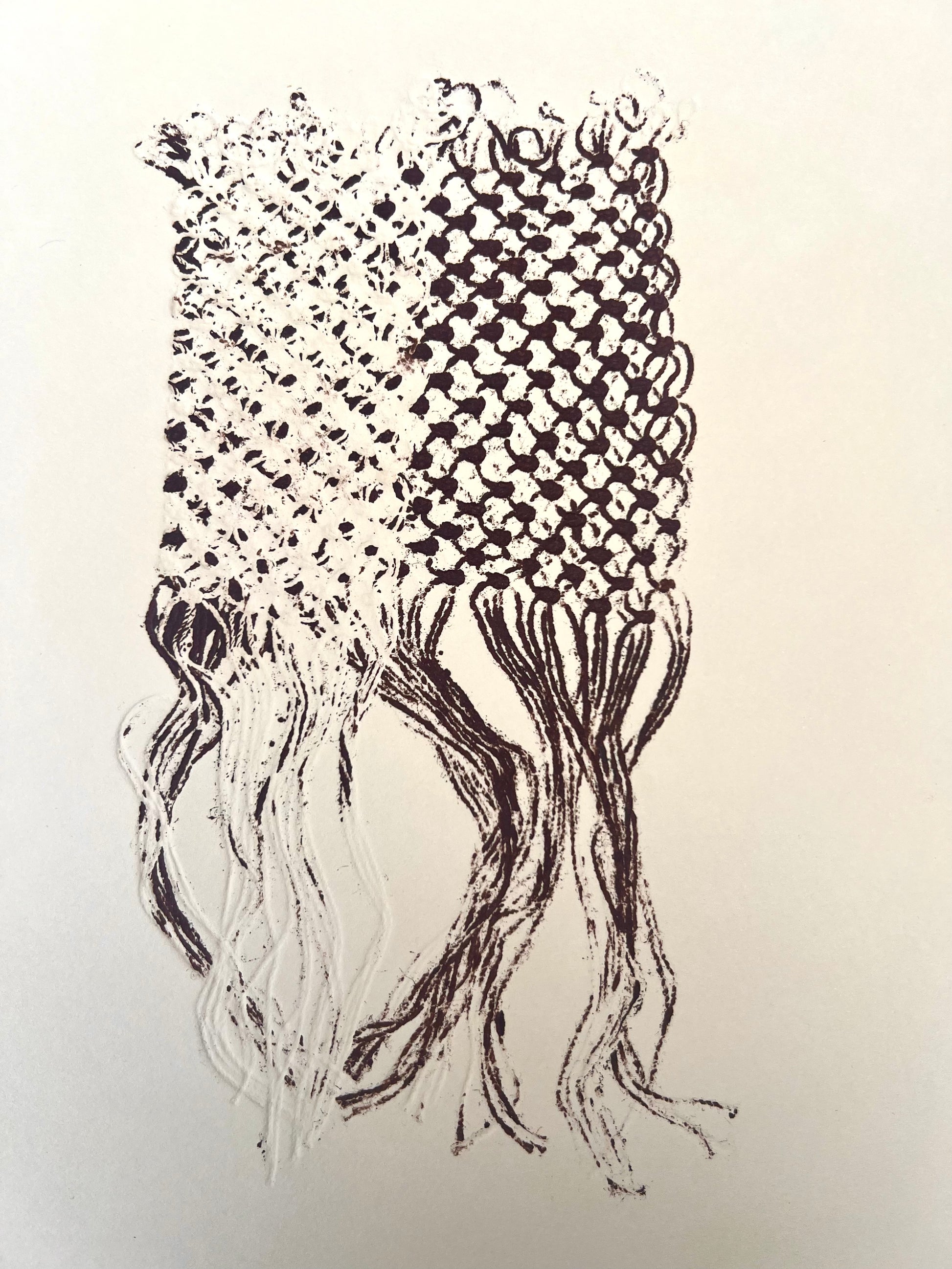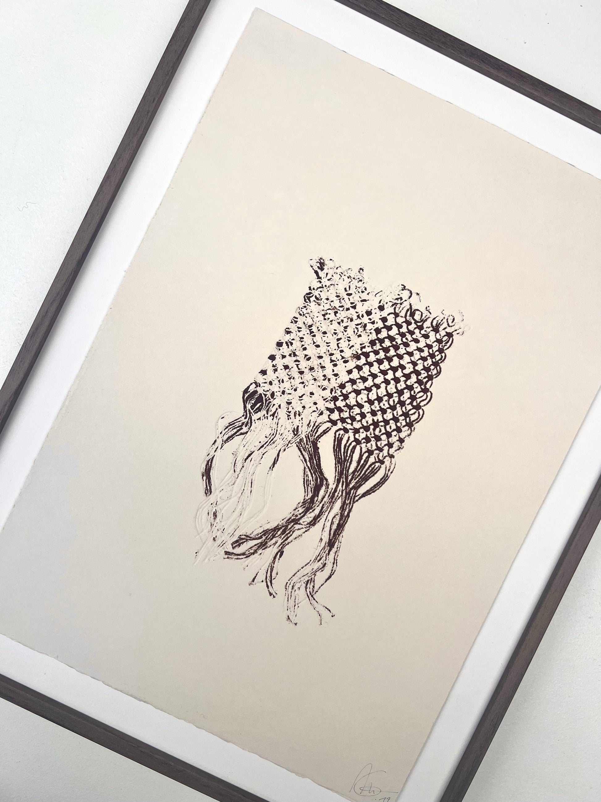 Estampe d'une matrice en fibres de lin nouées enduite d’encre d’impression et passée sous presse sur un papier Fabriano Rosaspina de 250g.