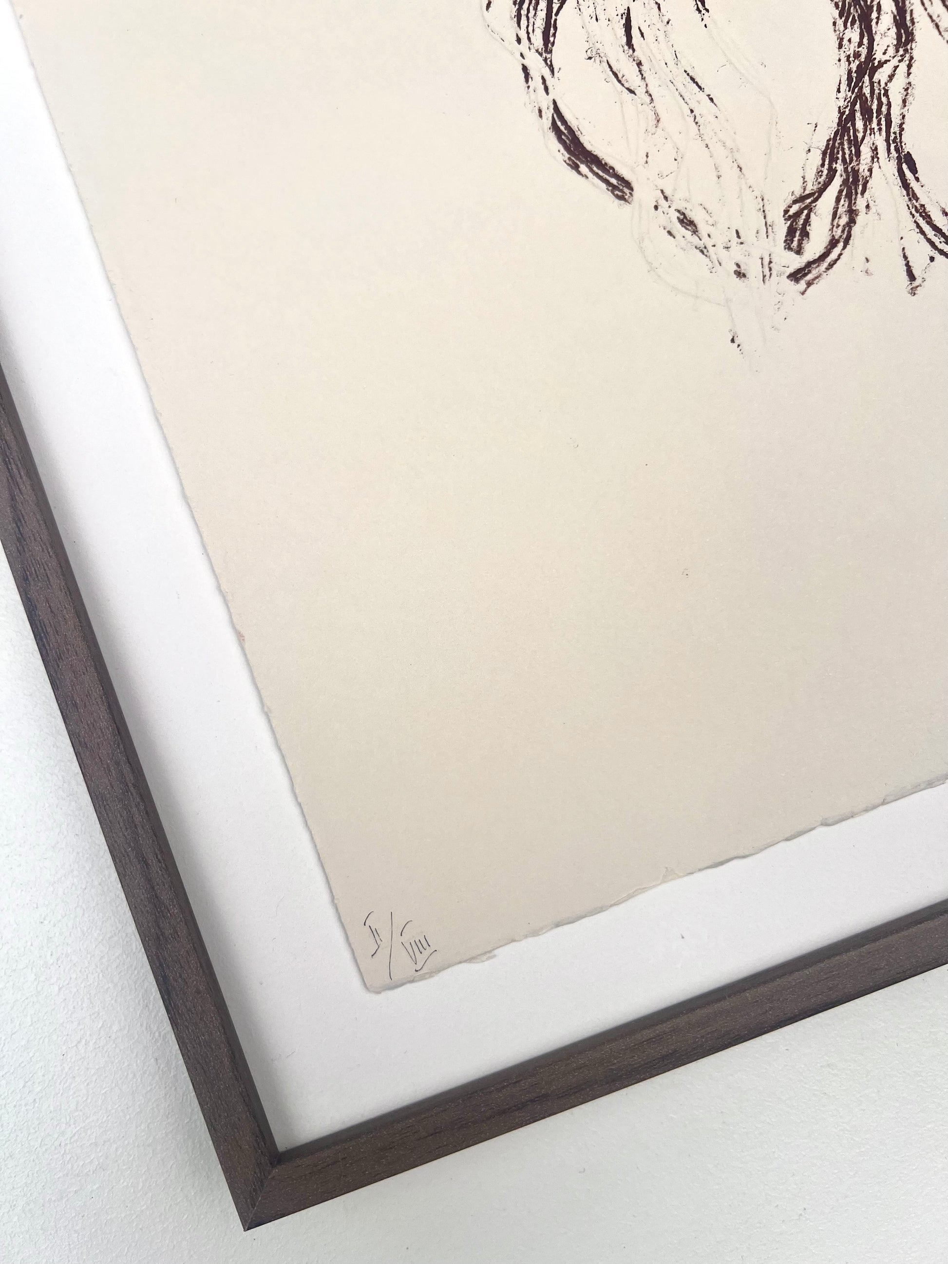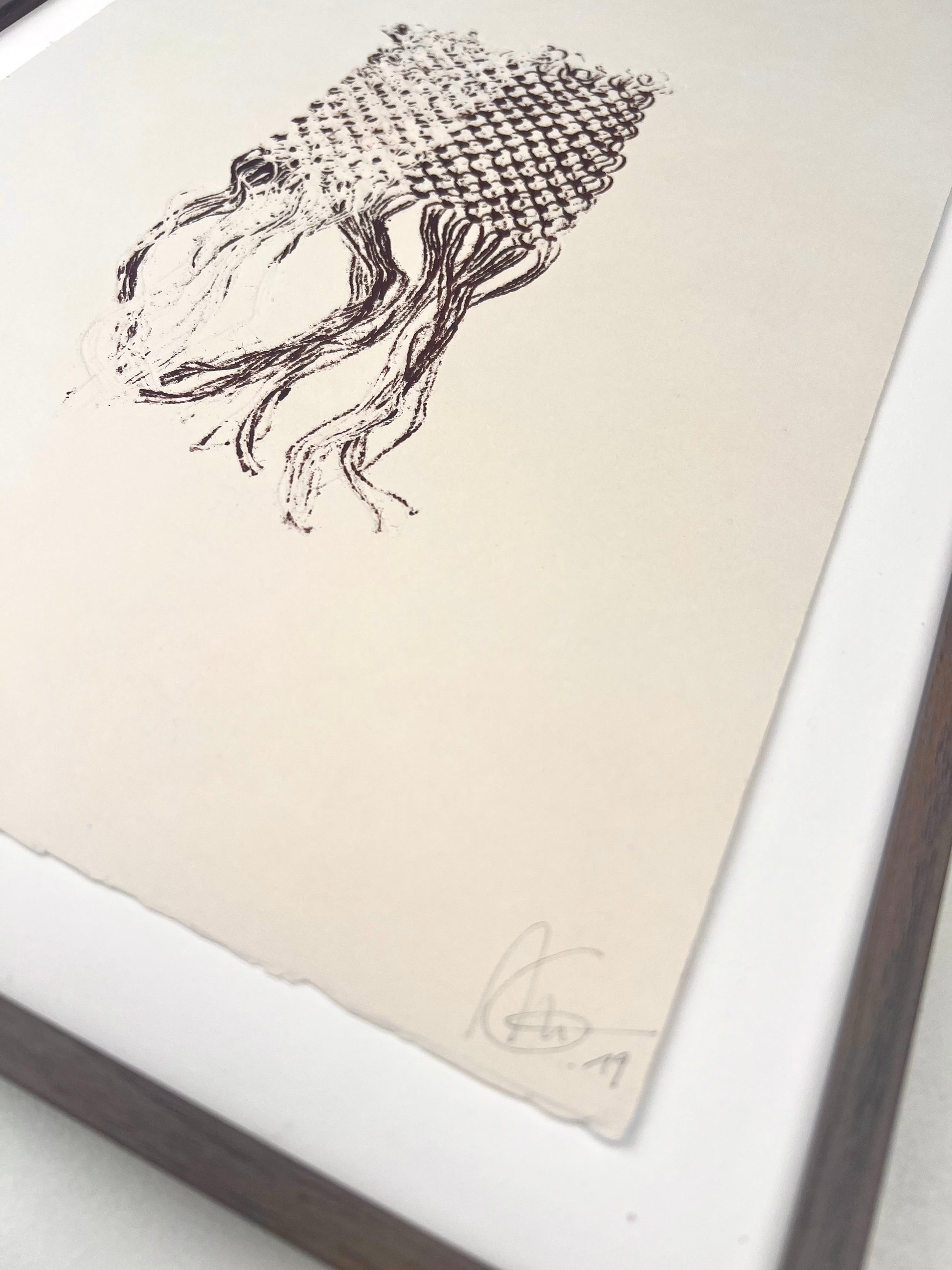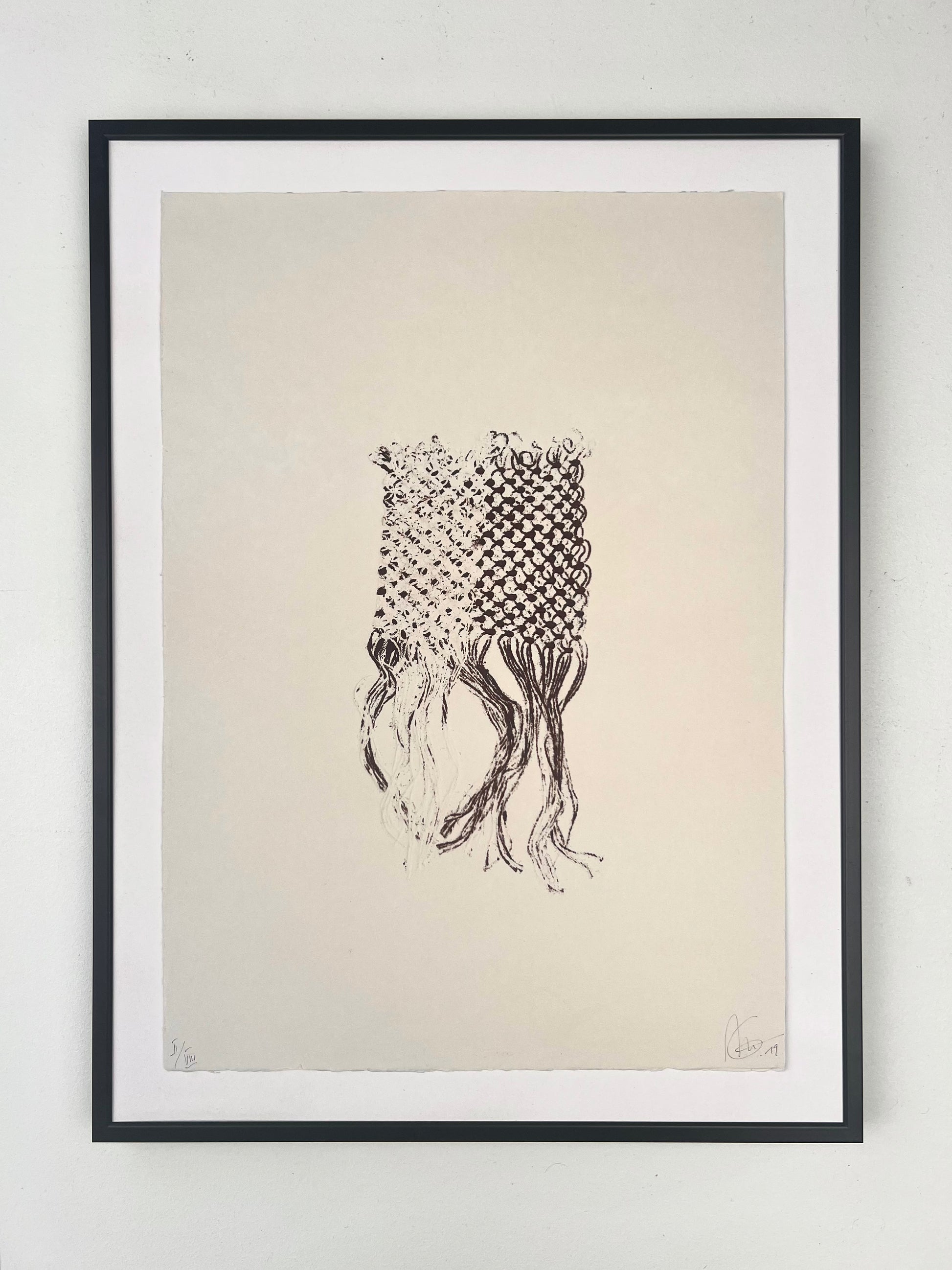 Estampe d'une matrice en fibres de lin nouées enduite d’encre d’impression et passée sous presse sur un papier Fabriano Rosaspina de 250g.