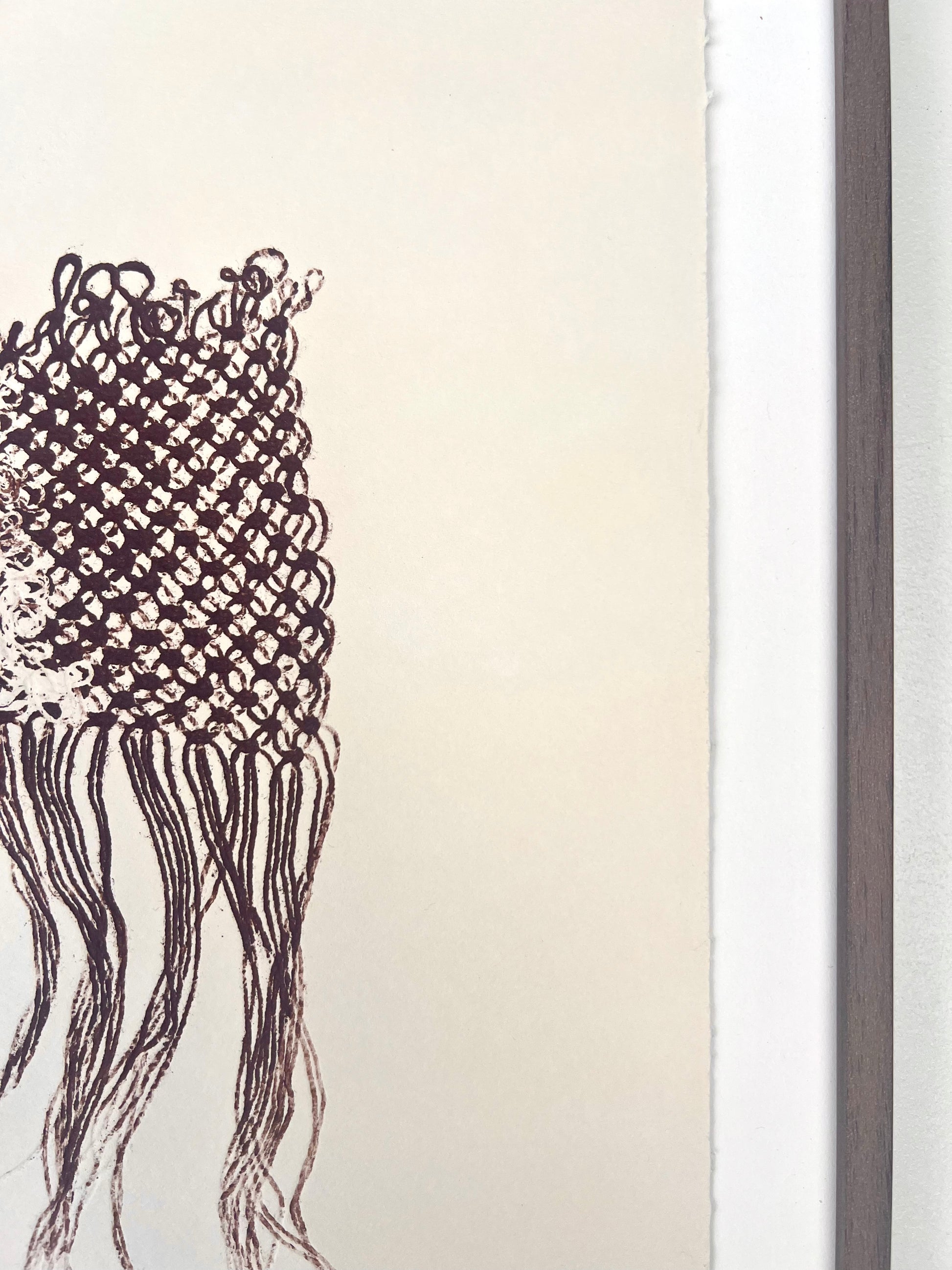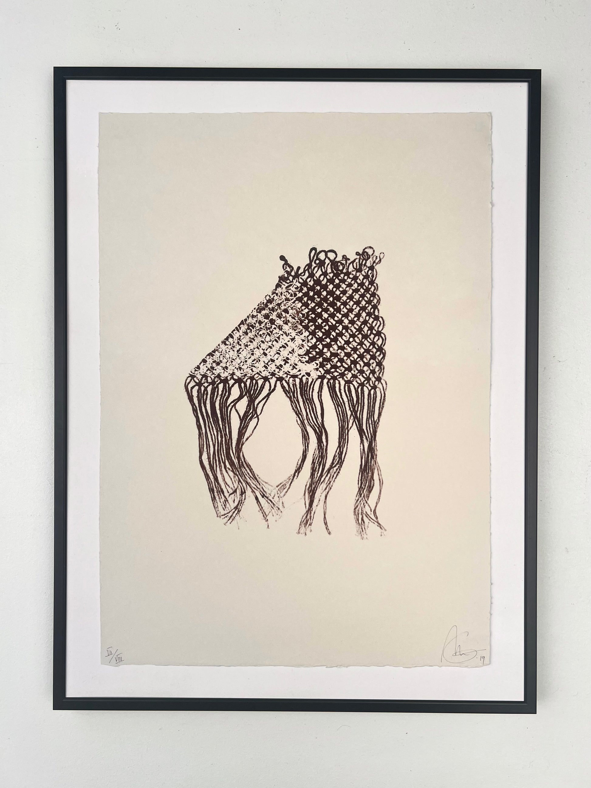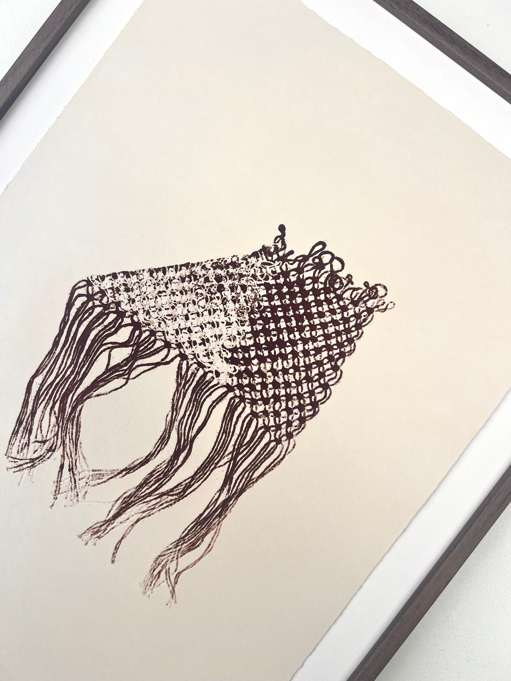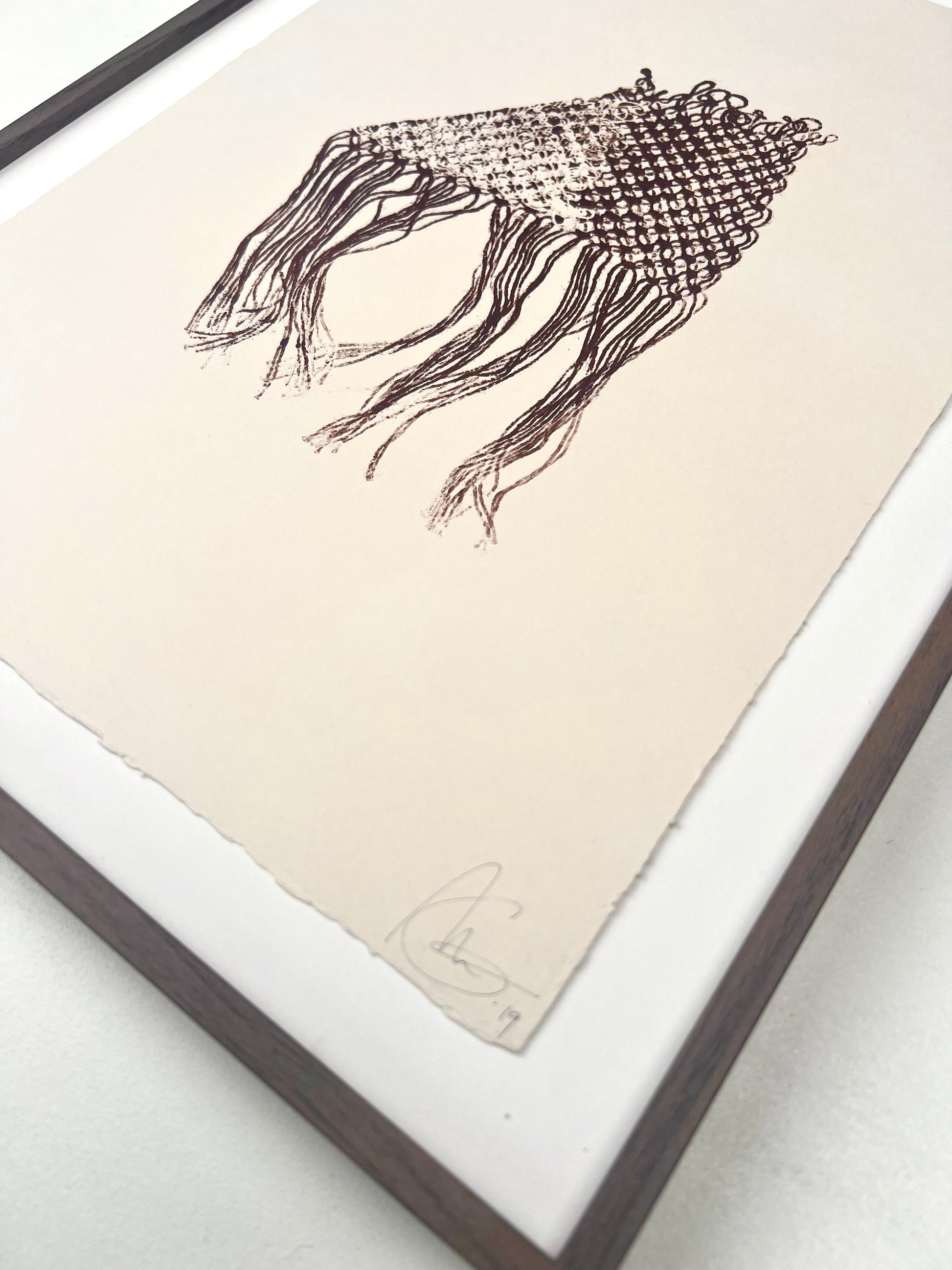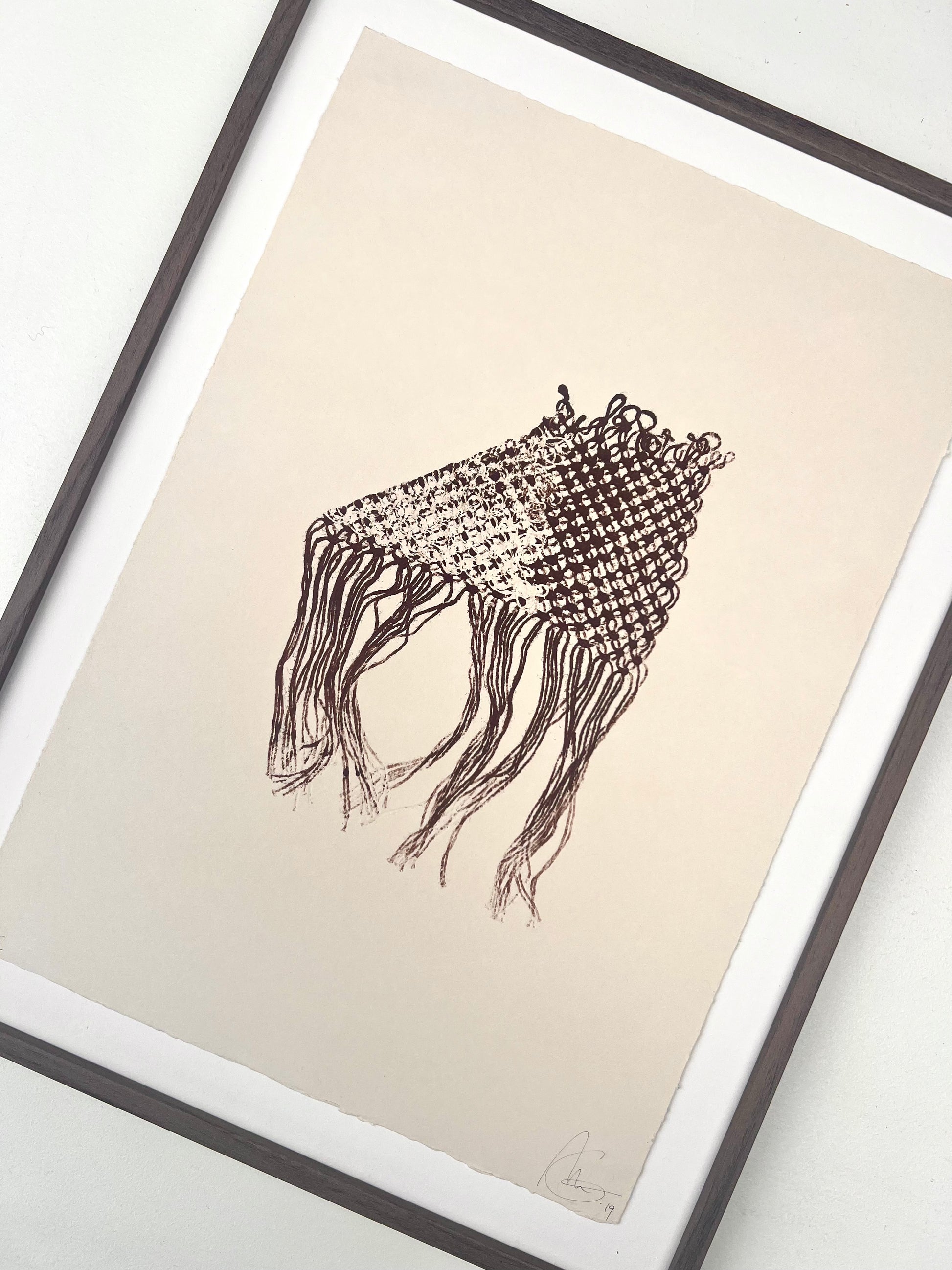 Estampe d'une matrice en fibres de lin nouées enduite d’encre d’impression et passée sous presse sur un papier Fabriano Rosaspina de 250g.