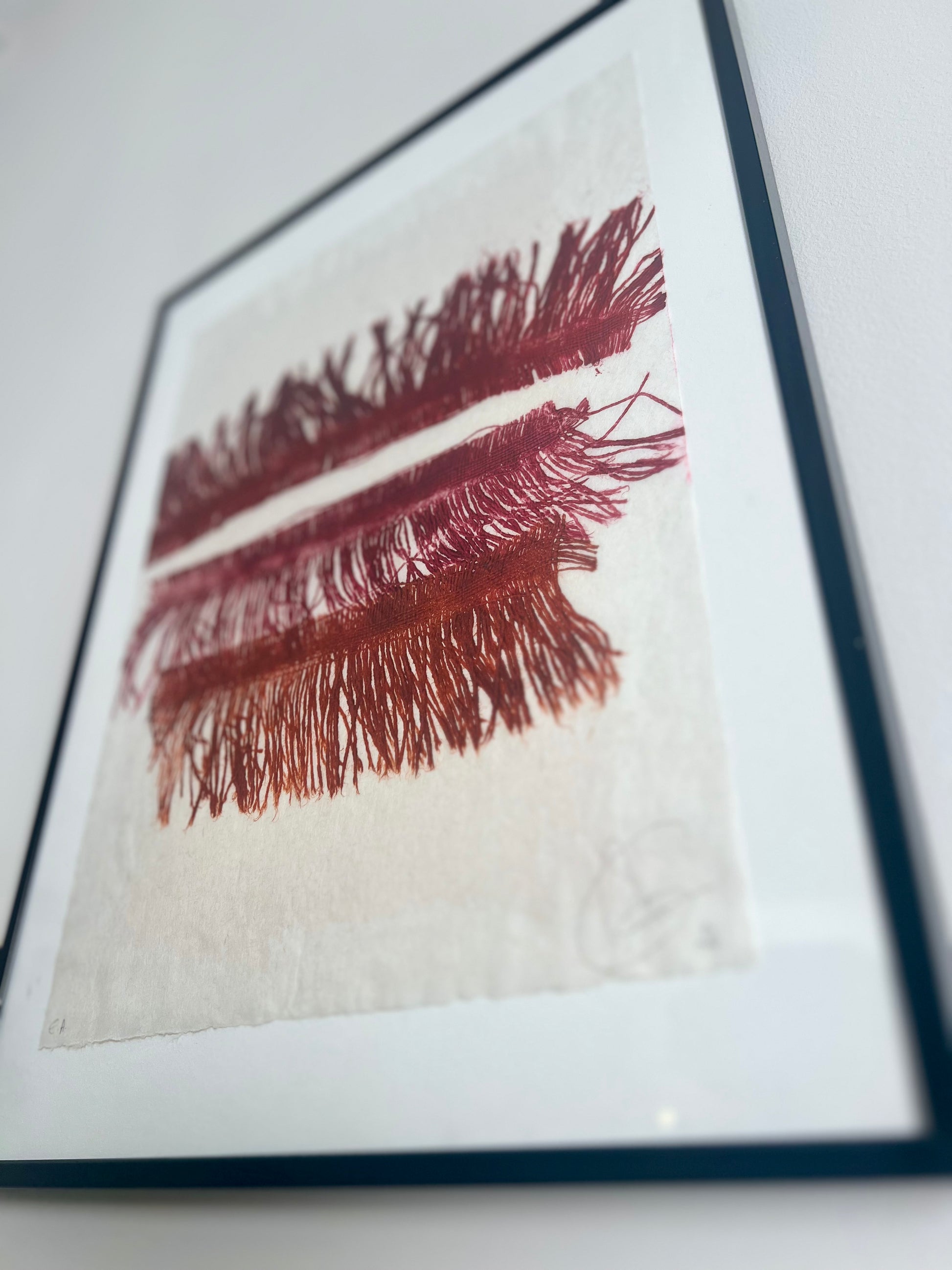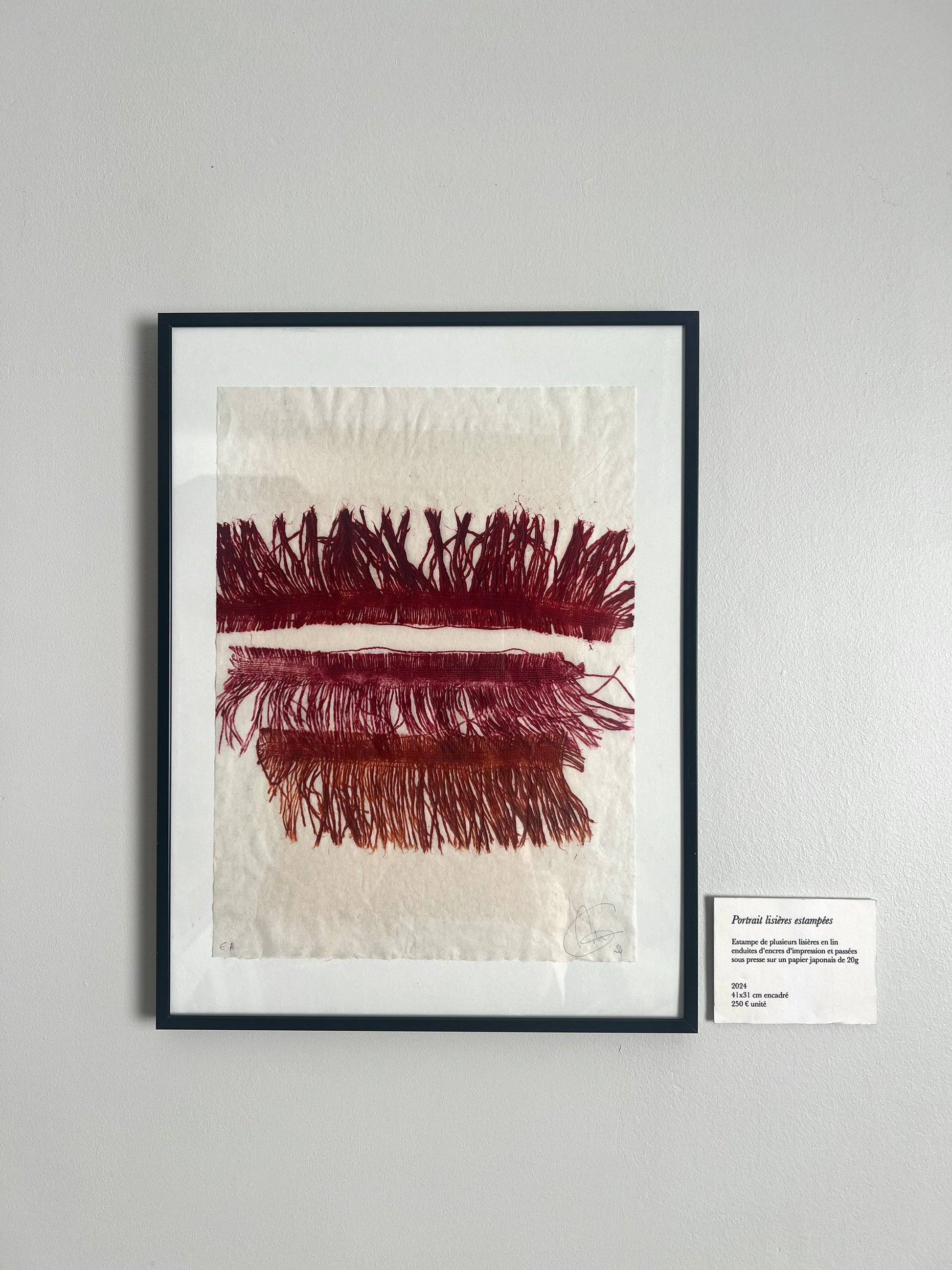 Estampe de plusieurs lisières en lin enduites d'encres d'impression et passées sous presse sur un papier japonais de 40g