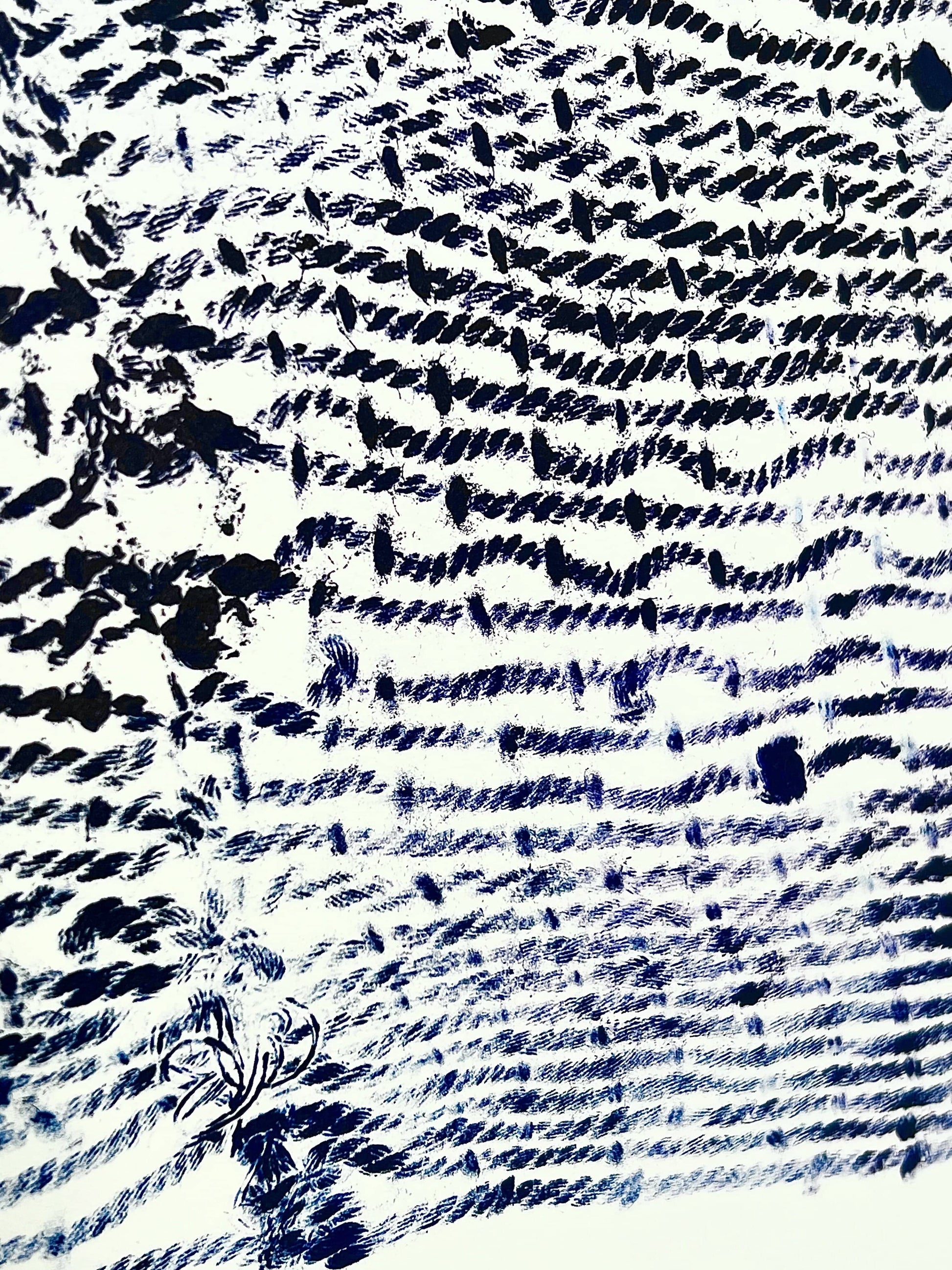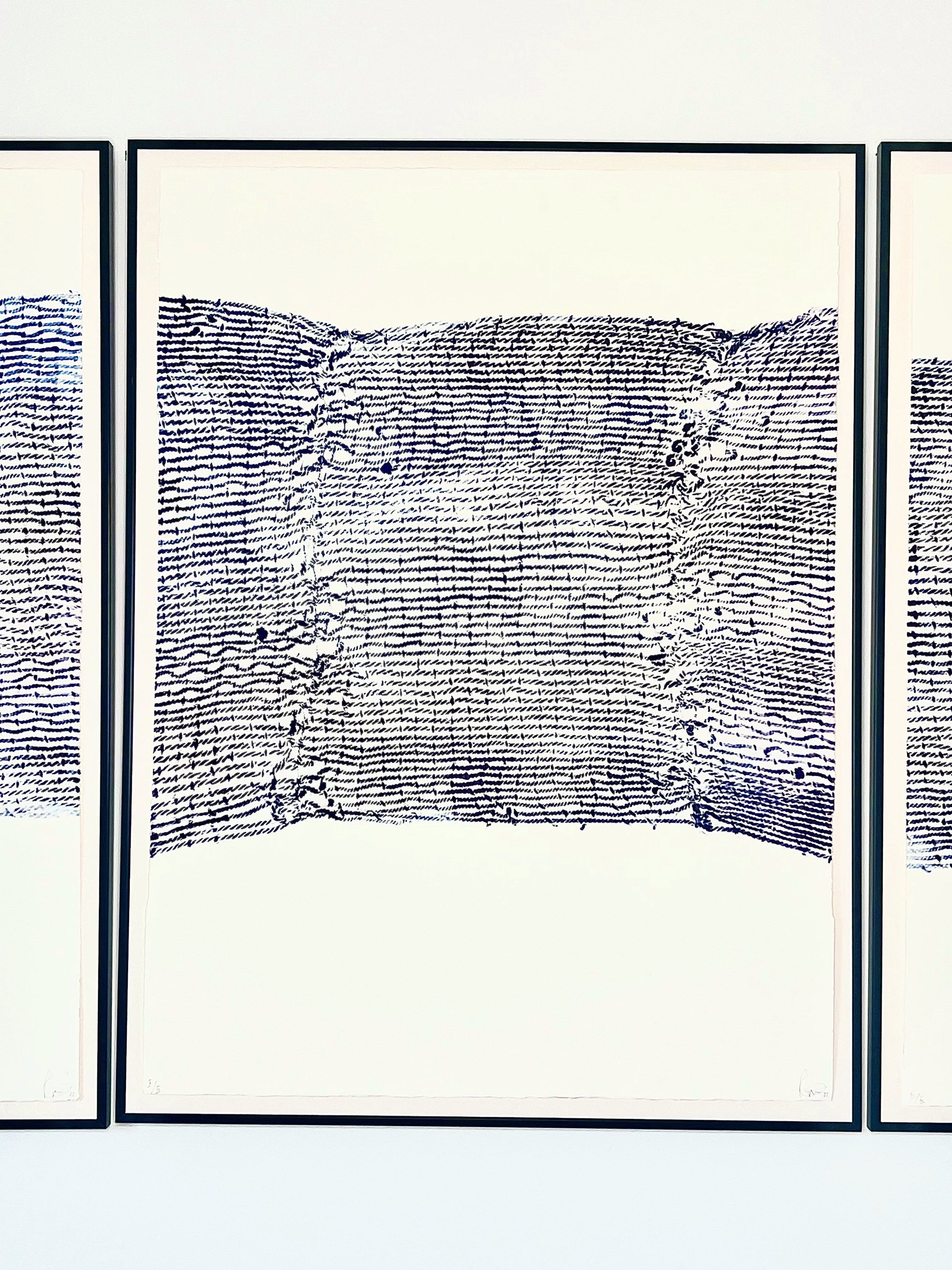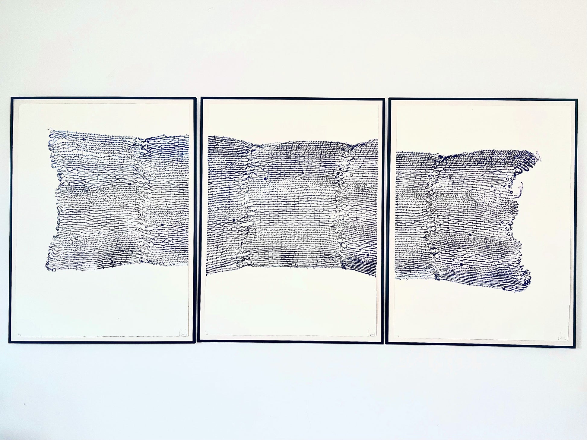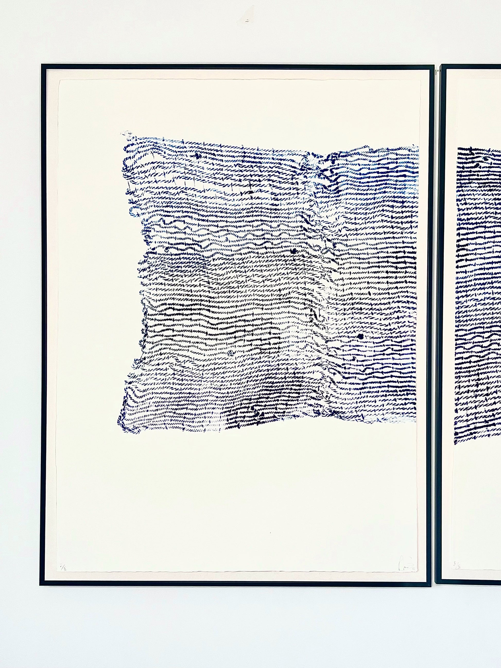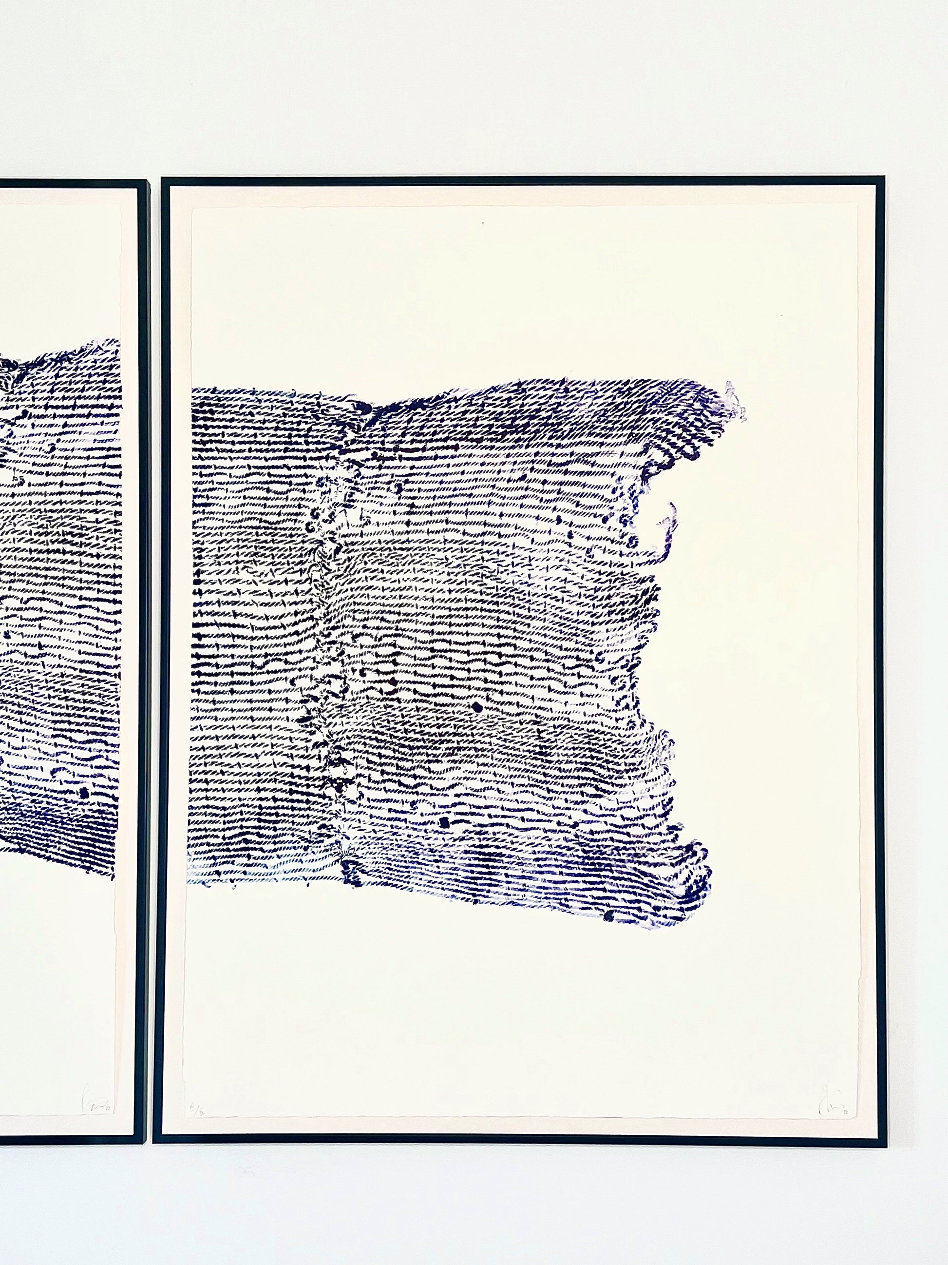 Estampes d’une matrice en fibres de coton tissées enduite de plusieurs encres d’impression et passée sous presse sur un papier BFK Hanhumüle ivoire en coton de 300g
